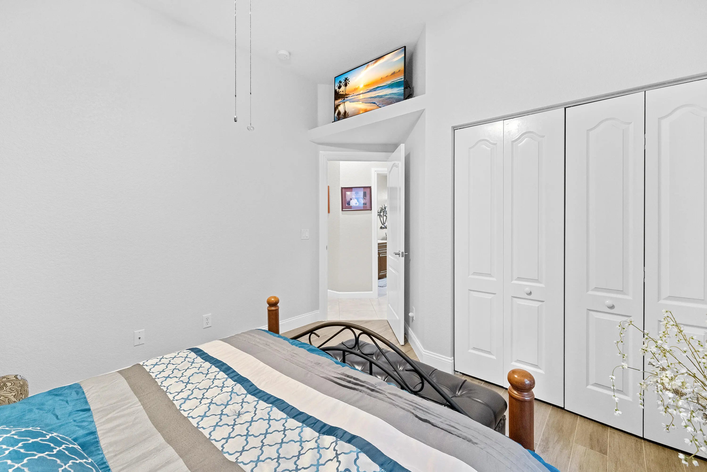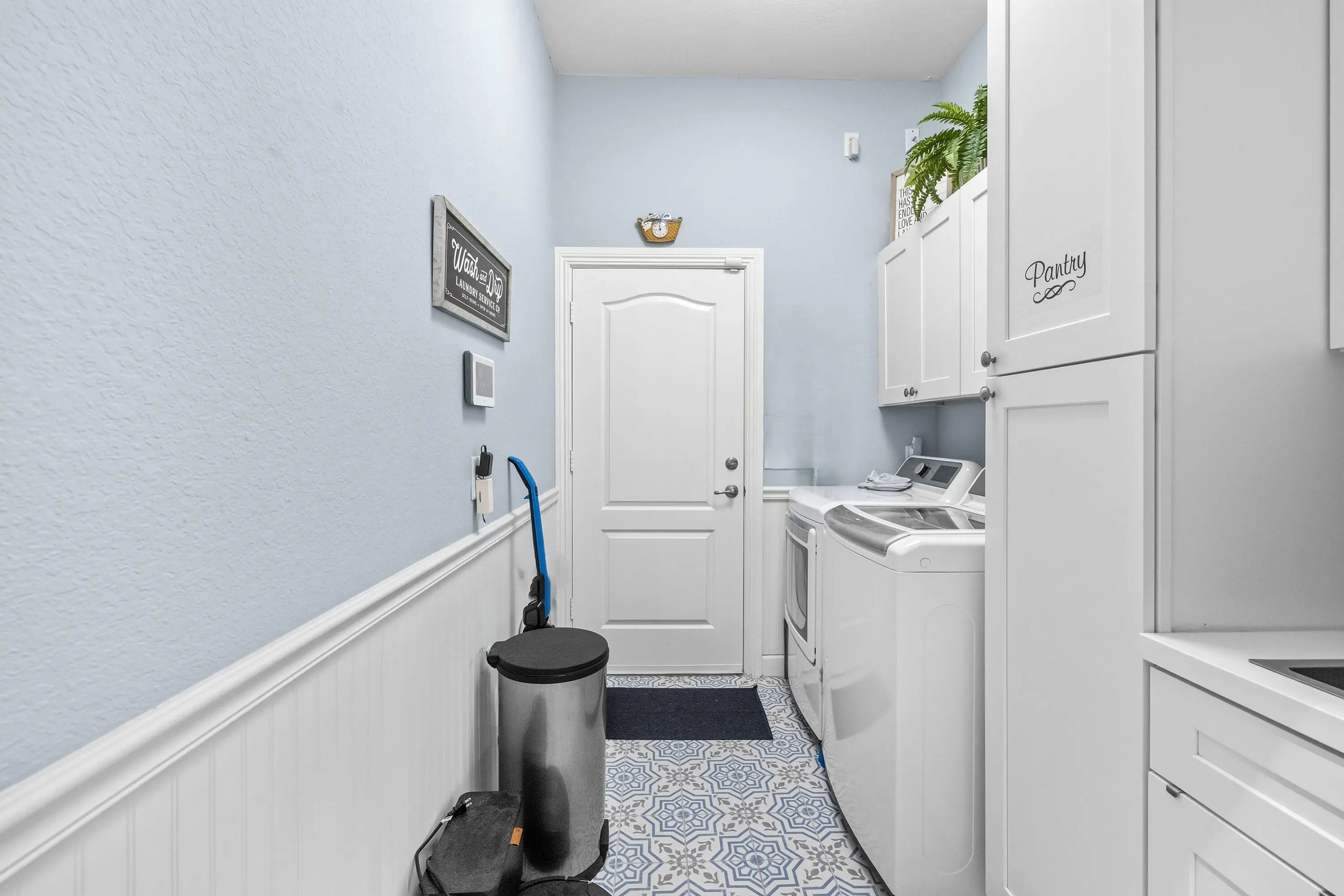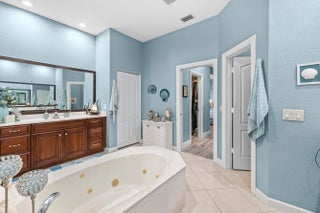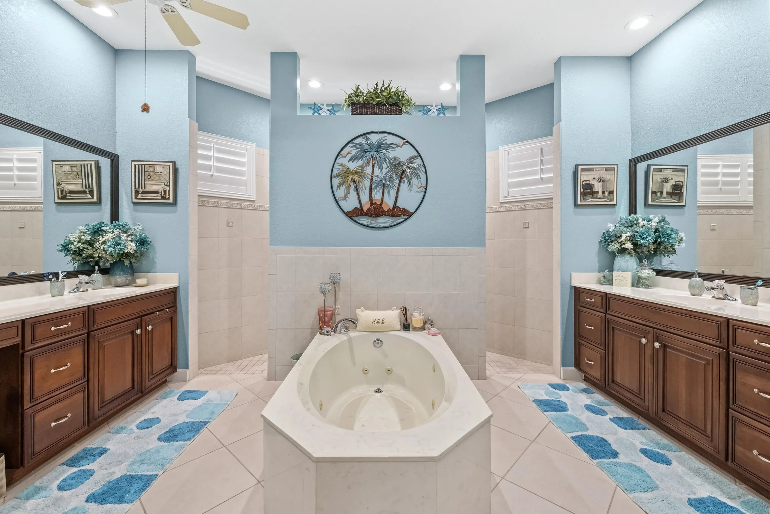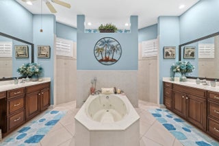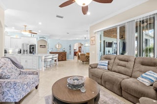 Exceptional opportunity to own this beautifully maintained Craftsman-style residence. Ideally situated on a spacious corner lot, the property offers a three-car garage, additional concrete driveway parking, and an extended concrete pad alongside the garage, perfect for toy storage. A welcoming covered front patio sets the tone for the home's inviting atmosphere. Upon entry through the decorative front door with dual sidelights, you are greeted by a formal living and dining area just beyond the foyer. Cream-colored ceramic tile flows throughout the main living areas, enhancing the home's bright and cohesive design. Multiple access points to the rear patio, from the living room, family room, and primary suite, create a seamless indoor-outdoor lifestyle. The expansive kitchen features a dedicated dining area and counter-height seating, ideal for casual gatherings. Appointments include stainless steel appliances, a large center island with additional storage, white shaker cabinetry, quartz countertops, a glass subway tile backsplash, and elegant upper-cabinet lighting. The adjoining family room provides a comfortable and functional space for everyday living and entertaining. Plantation shutters throughout the home add timeless style and a relaxed Florida aesthetic. The primary suite is a true retreat, showcasing wood-look tile flooring, generous proportions, cove ceilings, dual closets, and a chandelier-style ceiling fan. The spa-inspired ensuite bath features a centrally positioned jetted tub, a spacious walk-through shower, split vanities with dual sinks, and a private water closet. Three additional guest bedrooms and two full bathrooms provide ample accommodations, including one bathroom with wheelchair-accessible tile flooring. The laundry room is thoughtfully designed with built-in storage and a utility sink. Outdoors, enjoy a private screened oasis offering both covered and open patio spaces. The covered lanai boasts a stunning wood ceiling and ample room for entertaining. Accordion shutters protect the patio doors, while paver accents enhance the overall ambiance. The beautifully landscaped corner lot also features gutters, solar panels, and the added benefit of no HOA fees or restrictions. This exceptional property offers comfort, style, and flexibility, your dream home awaits.