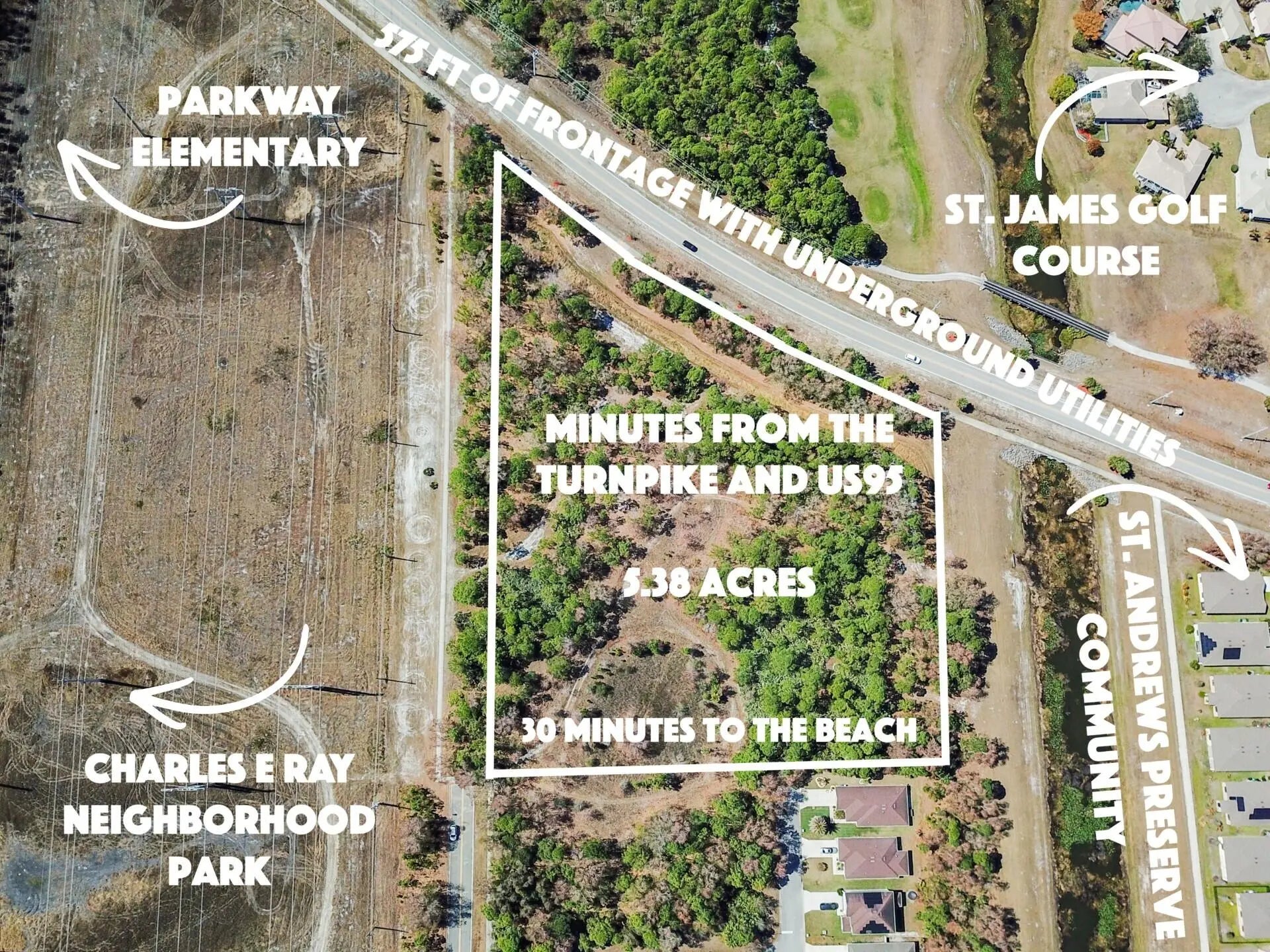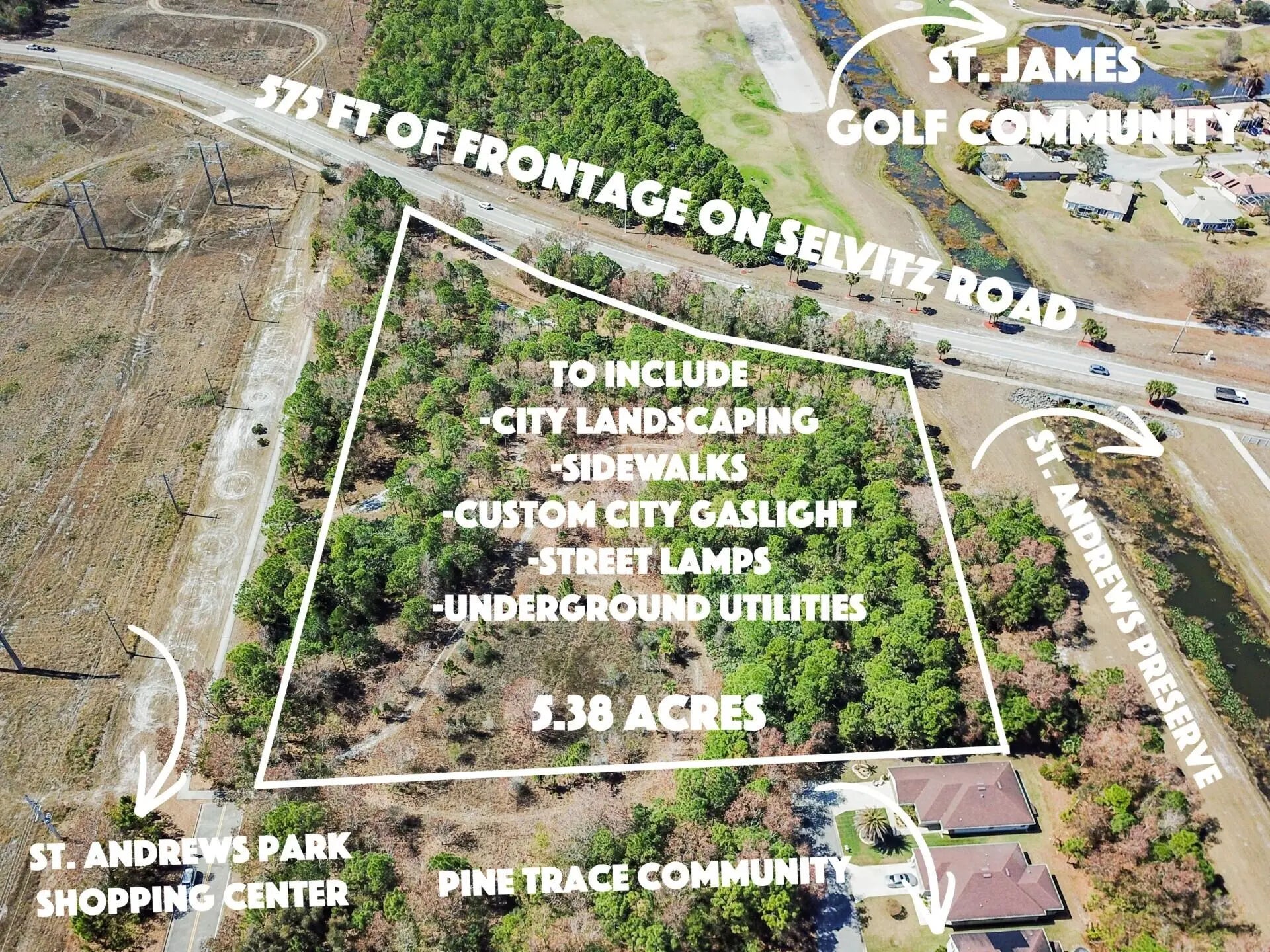 Fantastic 5.38 Acres, High & Dry Property with an Amazing 575 Ft of Landscaped Frontage on Selvitz Rd: to include City Landscaping, Sidewalks, Custom City Gaslight Style Street Lamps & Underground Utilities! This property is Located Almost Directly Across from the St James Golf Club Community. Current Zoning is General USE! I have a letter from the City of Port St. Lucie stating that the Future Land Use (ROI) allows for Professional (P), Limited Mixed Use (LMD), Multifamily Residential (RM-5) or Residential PUD (Planned Unity Development) between 5 to 11 Units Per Acre. I have attached the sections of Port St. Lucie City's Code that Outline all of the Permitted Uses and Requirements for each Zoning District. This Property is Eligible for Rezoning, as it meets the City's Size Requirements
