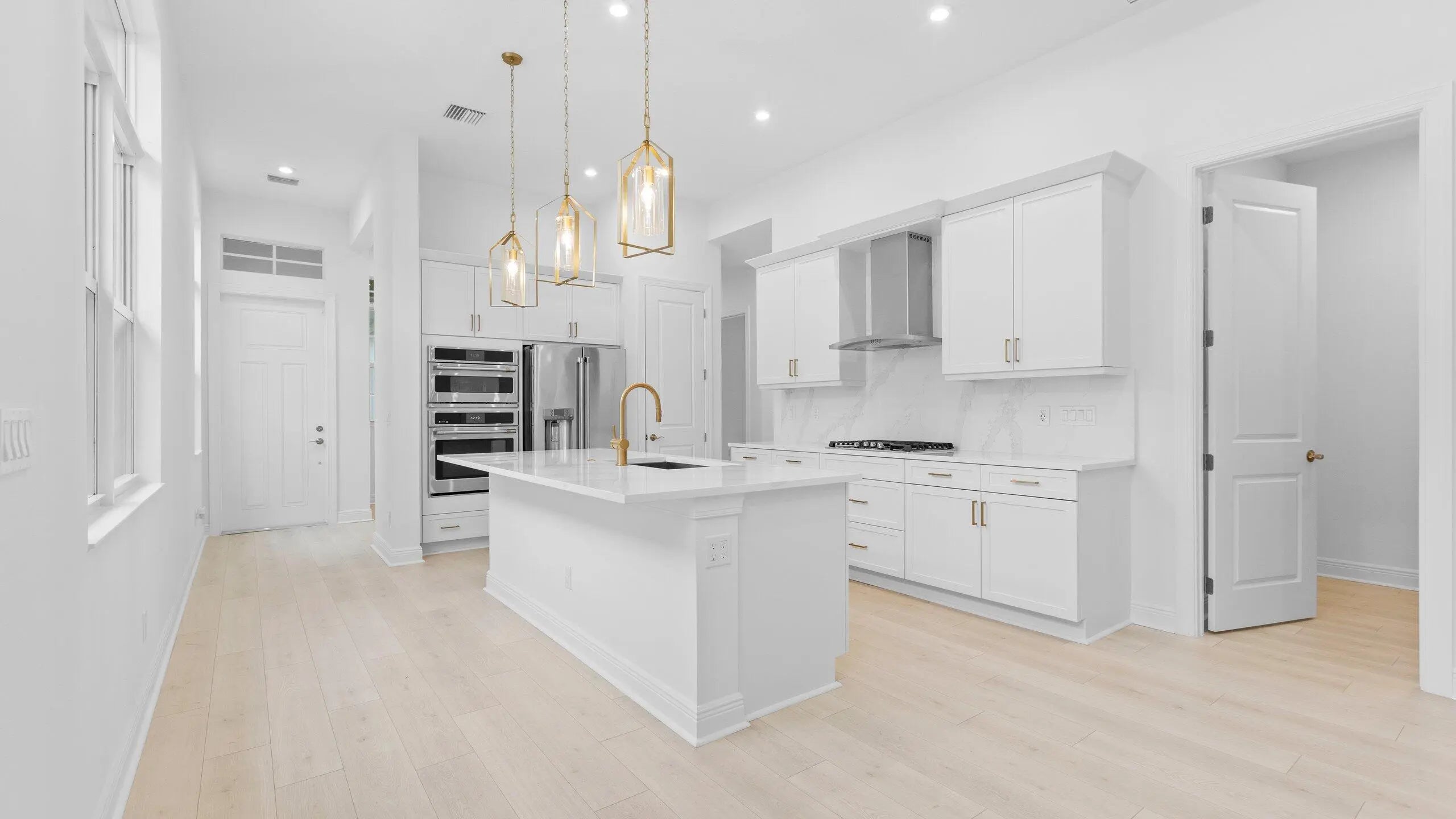 The only brand-new 4-bedroom Caroline home in Rivella on the preserve, offering exceptional privacy with no homes in front or behind and a prime location of Rivella. This beautifully designed residence features a charming coastal elevation and laminate flooring throughout for a seamless, modern feel. With 3 full bathrooms and a flexible living space ideal for a home office, media room, or playroom, the layout adapts to your lifestyle. The gourmet kitchen is the centerpiece, showcasing quartz countertops, a full quartz backsplash, and elegant gold hardware, blending style and function in a peaceful, private setting.
