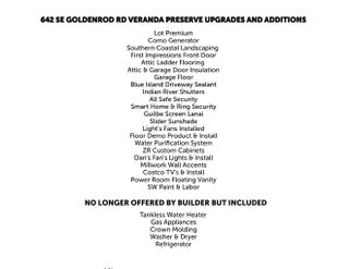 Welcome to 642 Southeast Goldenrod Road, located within the prestigious Veranda Preserve, an exclusive 55-plus community in Port St. Lucie, designed for refined Florida living. This beautifully appointed residence offers three generous bedrooms, a den, and four bathrooms, providing exceptional space, privacy, and flexibility. The home's expansive open-concept layout is ideal for elegant entertaining, seamlessly flowing to peaceful lake views that create a calm, private, and serene setting--enhanced by newly updated flooring throughout that keeps the home light, bright, and inviting. Completing the living space is a screened-in lanai with tranquil lake views, offering the perfect setting to relax, unwind, and enjoy Florida living year-round. Every detail has been thoughtfully curated, featuring extensive high-end upgrades throughout. Highlights include a striking custom front entry door, Indian River shutters, upgraded ceiling fans, designer wall accents, and timeless crown moldings. Modern conveniences include a whole-home water purification system, tankless water heater, natural gas service, and a whole-home generator, offering comfort, efficiency, and peace of mind year-round. The three-car garage is a standout feature, finished with RaceDeck diamond plate garage flooring, upgraded ceiling lighting, and custom wall graphics--creating a polished, functional, and visually impressive space. Residents of Veranda Preserve enjoy a resort-style lifestyle, with access to a beautifully appointed clubhouse, resort pool, bocce ball courts, pickleball, tennis, and a fully equipped, full-service fitness center--all designed to support an active yet tranquil lifestyle. This exceptional home delivers the perfect balance of luxury, comfort, and community, offering an elevated Florida lifestyle in one of Port St. Lucie's most desirable 55-plus neighborhoods. If this home speaks to you, I invite you to experience it in person.