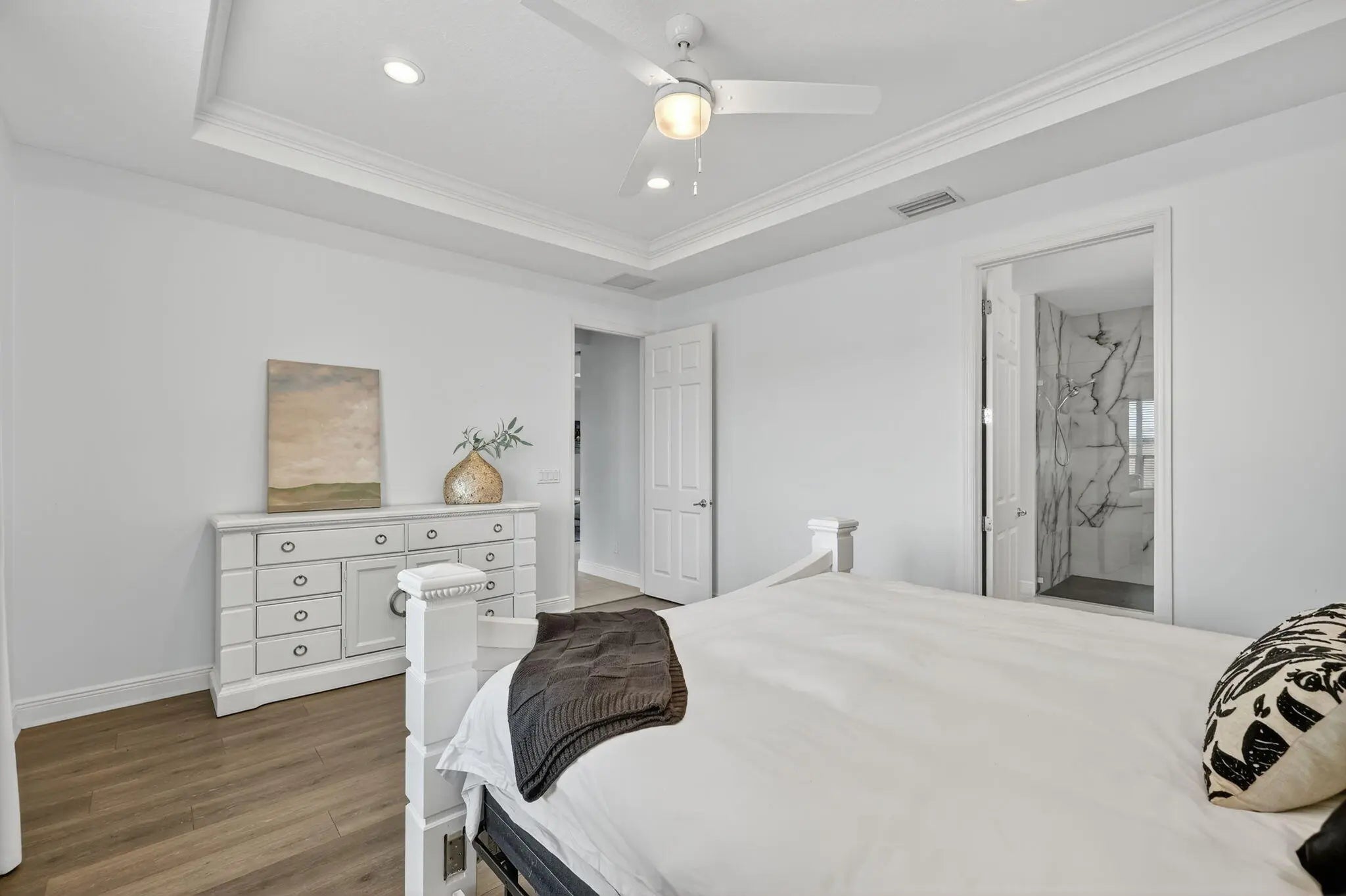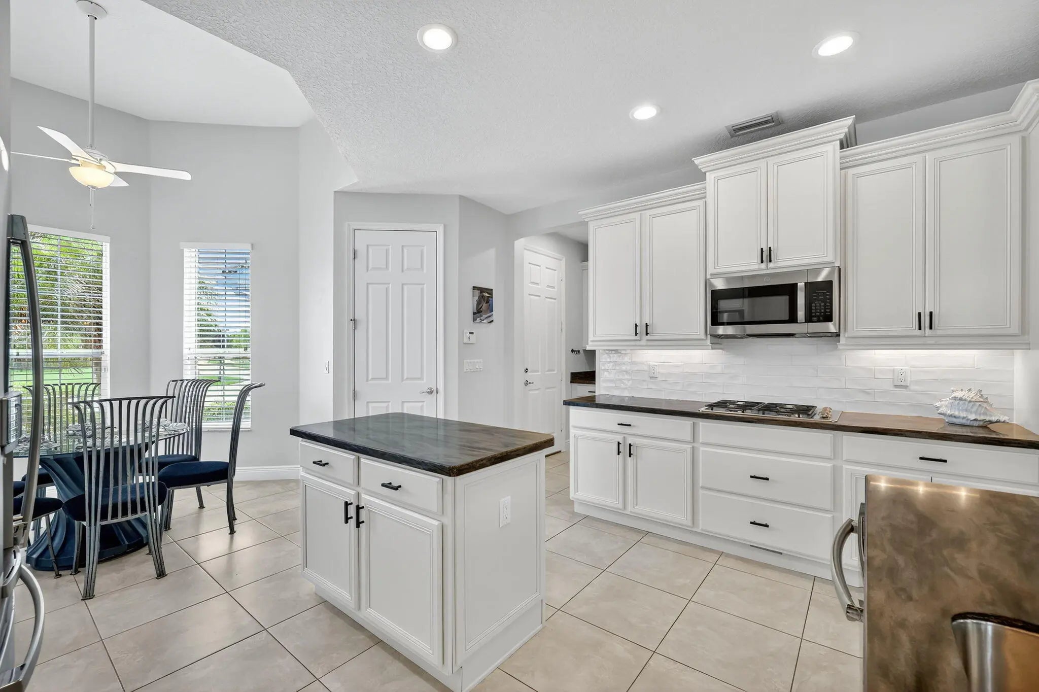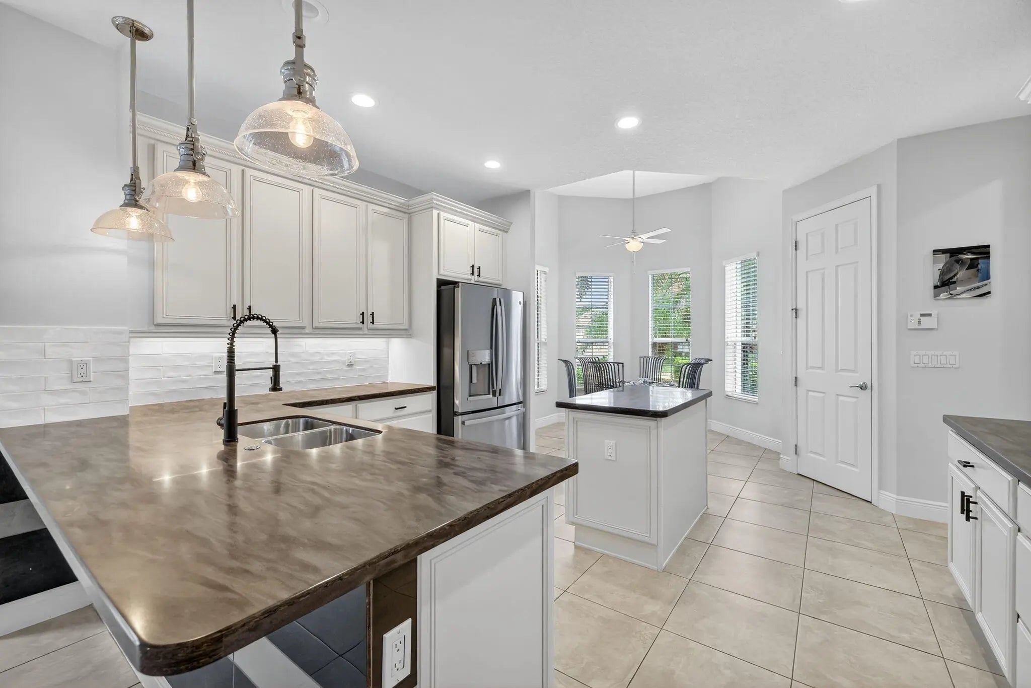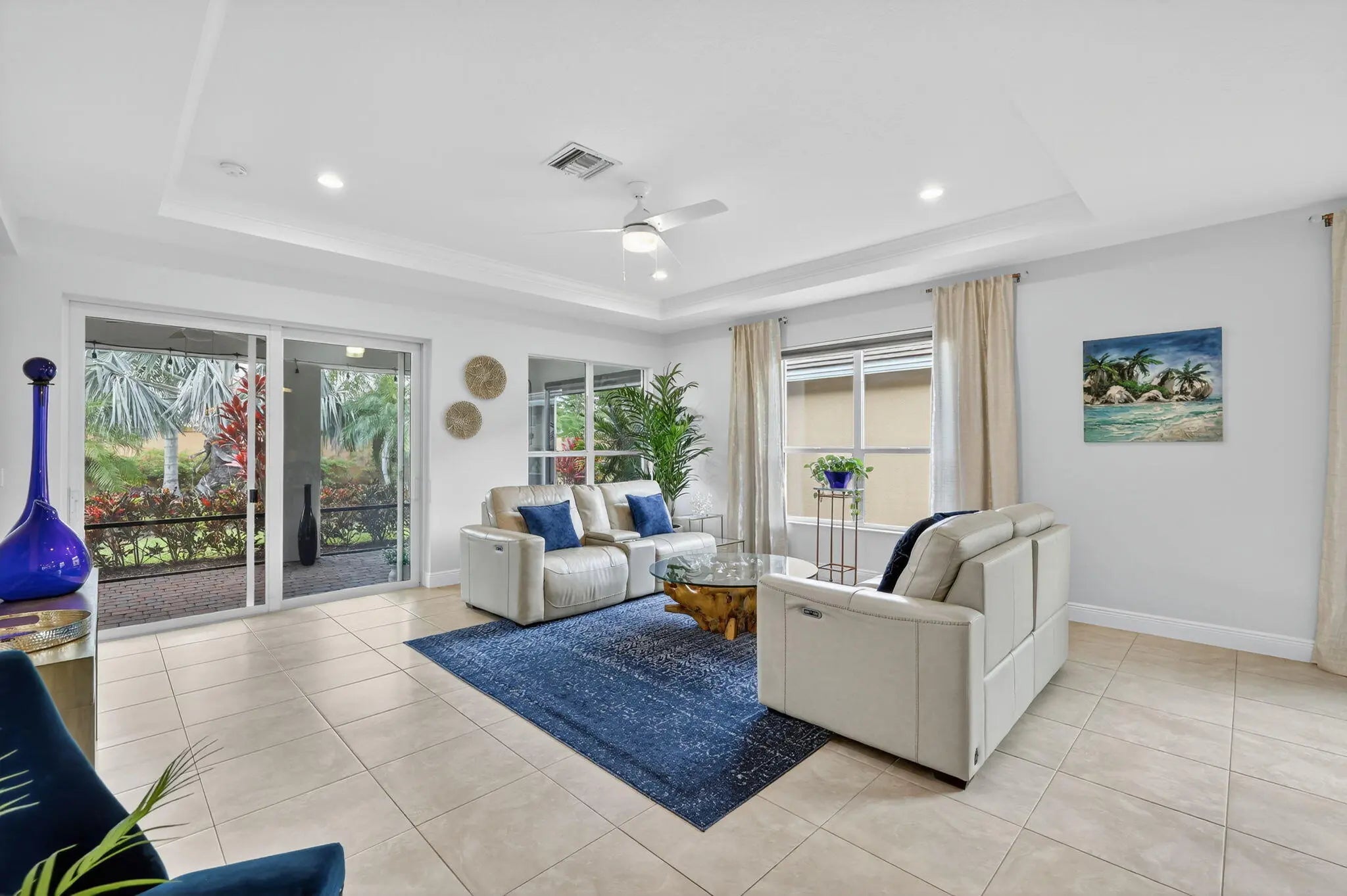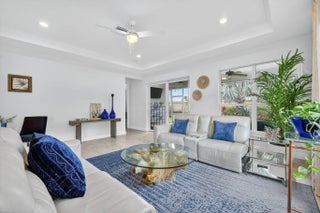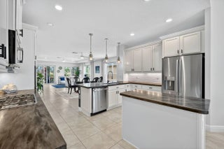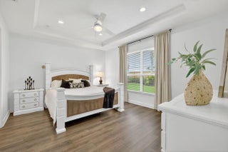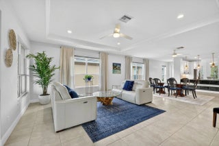 Model-perfect true 3-bedroom, 2-bath home offering 2,262 sq. ft. of beautifully designed living space. The spacious eat-in kitchen features upgraded countertops, center island with breakfast bar, dual wall ovens, gas range, and a walk-in pantry--ideal for cooking and entertaining. The great room showcases elegant coffered ceilings and sliding glass doors that open to the covered lanai complete with an electric roll-down shade. Enjoy a private backyard with no neighbors behind, plus hurricane impact glass throughout for year-round security and peace of mind. The primary suite offers coffered ceilings, a massive walk-in closet, and a stunning remodeled bathroom featuring a large walk-in shower and double vanities. Located in Vitalia at Tradition, a premier 55+ active lifestyle.