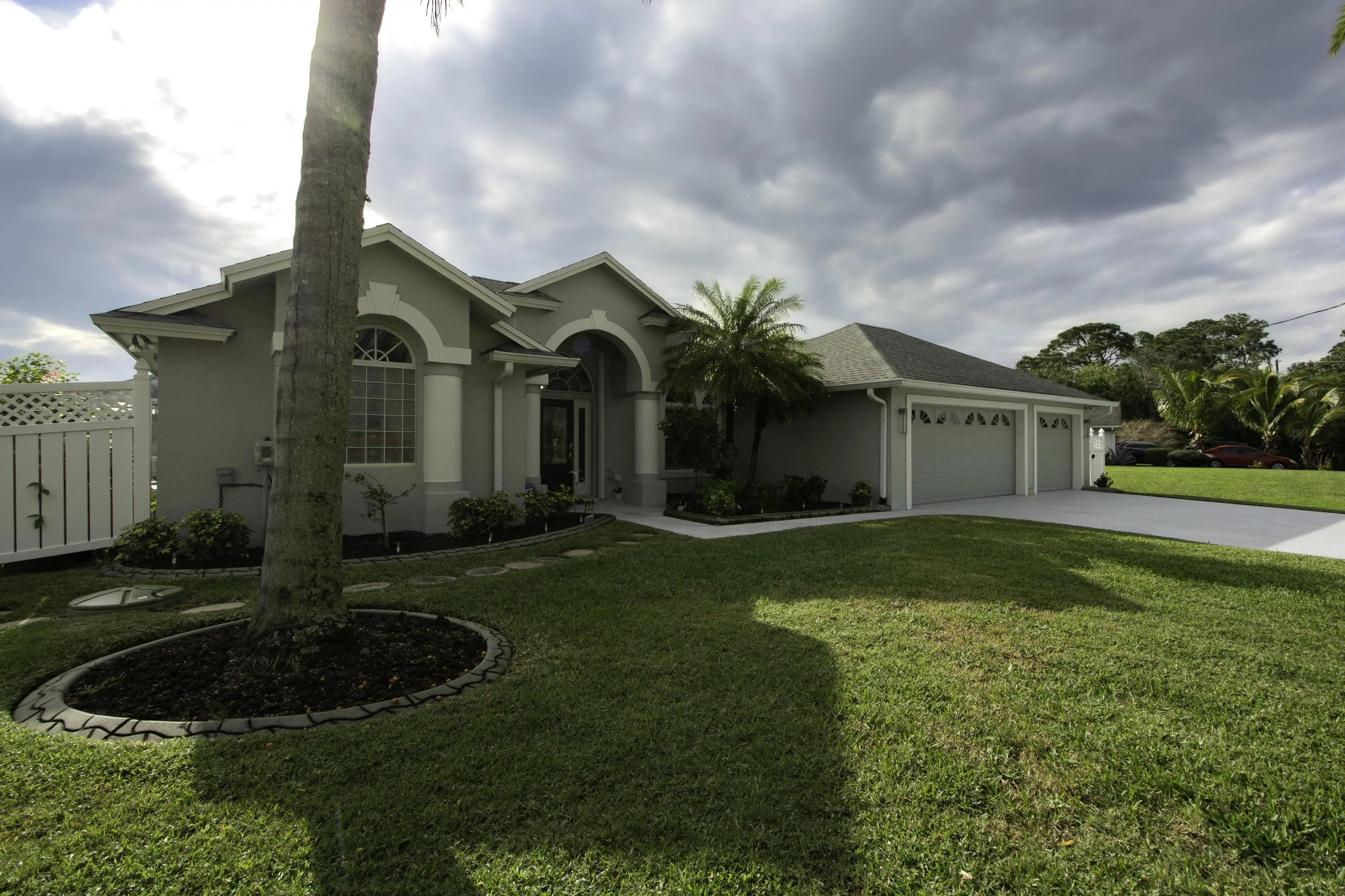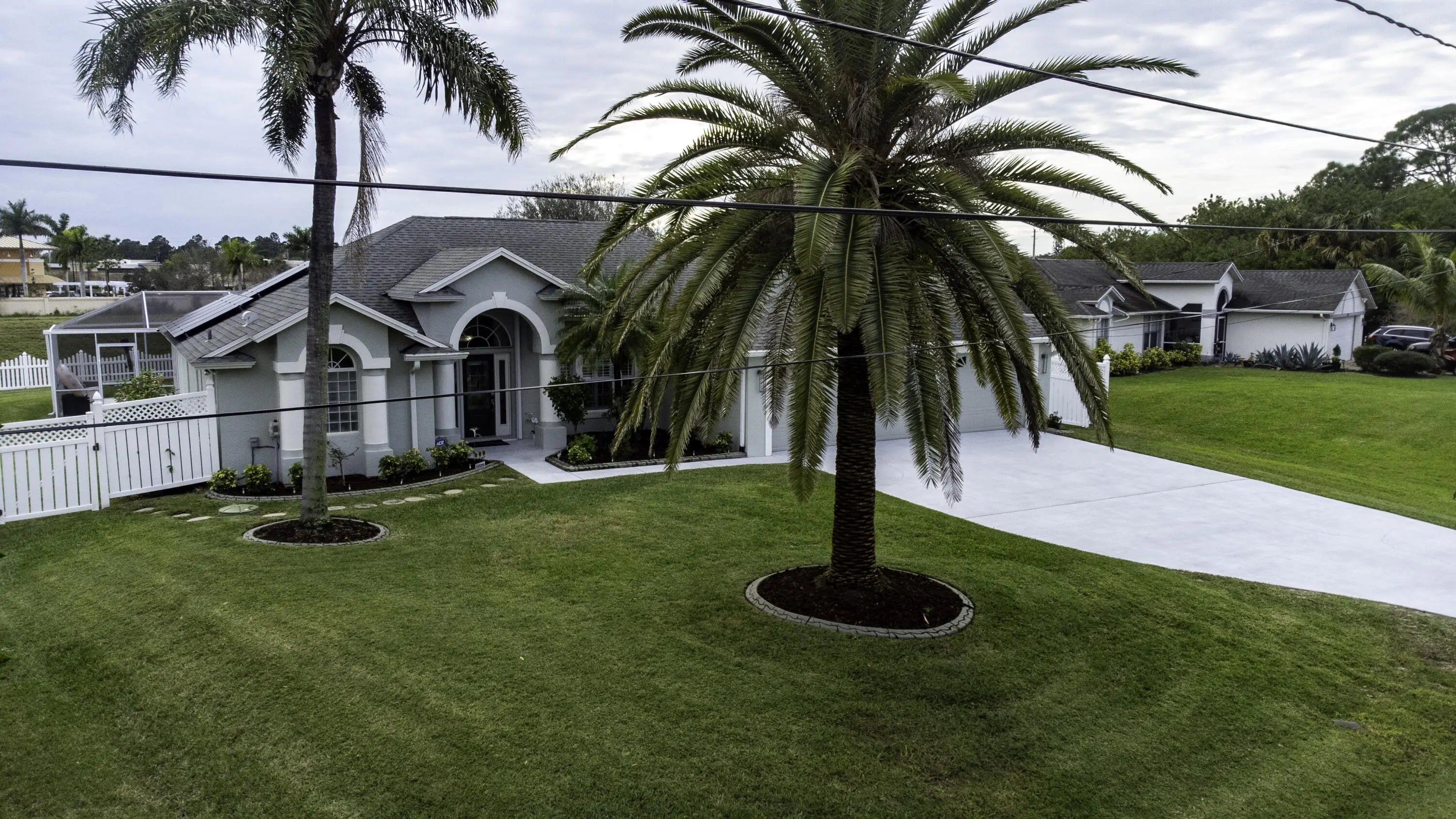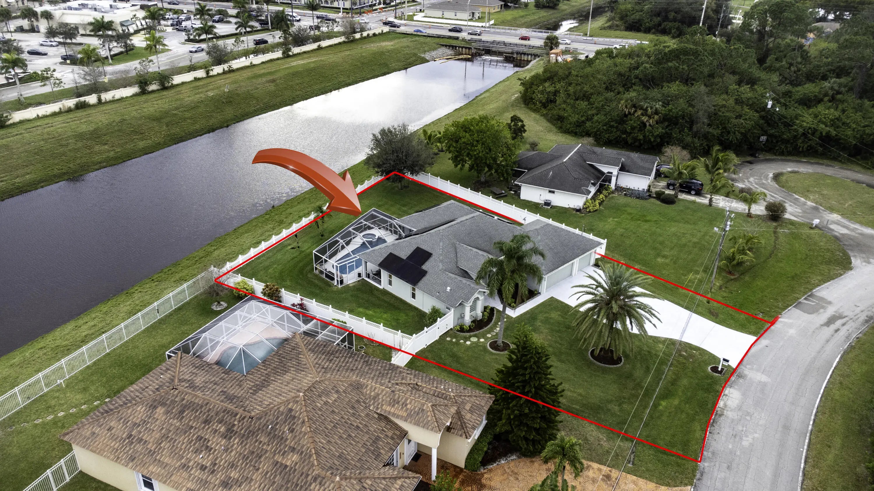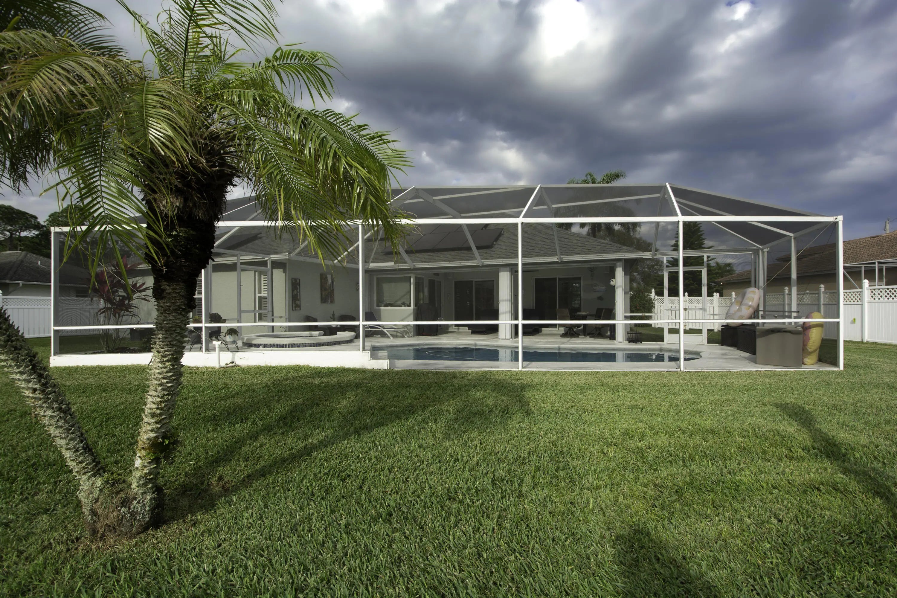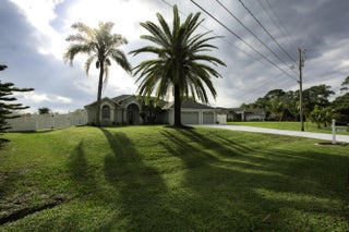 Beautiful energy-efficient Tropical Builder Home! This home offers many features and updates, making it the perfect blend of comfort, style, and convenience. Owner replaced entry door 2020. 2019 roof with the added bonus of solar panels, ensuring you save electricity monthly. A/C 2021. Water Heater 2021, Electric car charging station in garage, New pool pump & heater, pool was resurfaced in 2022. extended driveway providing ample parking space for guests. Wood plantation shutters inside the home. Accordion shutters for porch and front entry door, and hurricane panels for exterior windows. Tray ceiling in Family and master, new exterior paint. The kitchen is beautifully done w/ granite counters. Newer SS appliances. Guest bath renovated. Big Porch area overlooking the jacuzzi screened pool with view of water canal on the back. New tile around pool. Vinyl Fenced yard, Gutters. Sprinkler for lawn irrigation. Water treatment Softener-Owned. Beautiful Landscaping. A Short drive away from I95, Turnpike, Multiple grocery stores (Sam's Club, Aldi's, Publix), Walmart Supercenter, and Tradition where you will find Multiple Restaurants and so much more for you and your family. **A Must See**