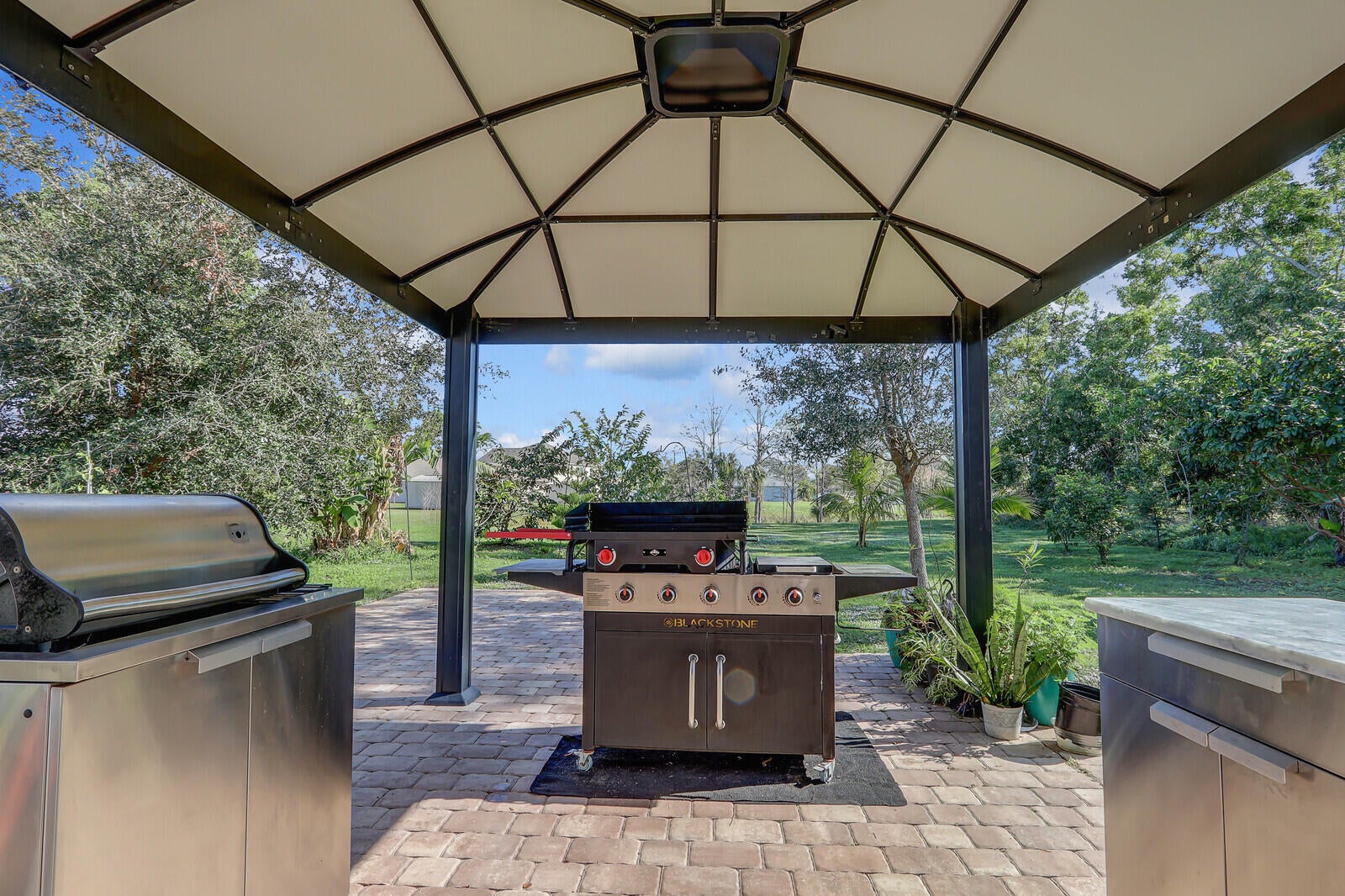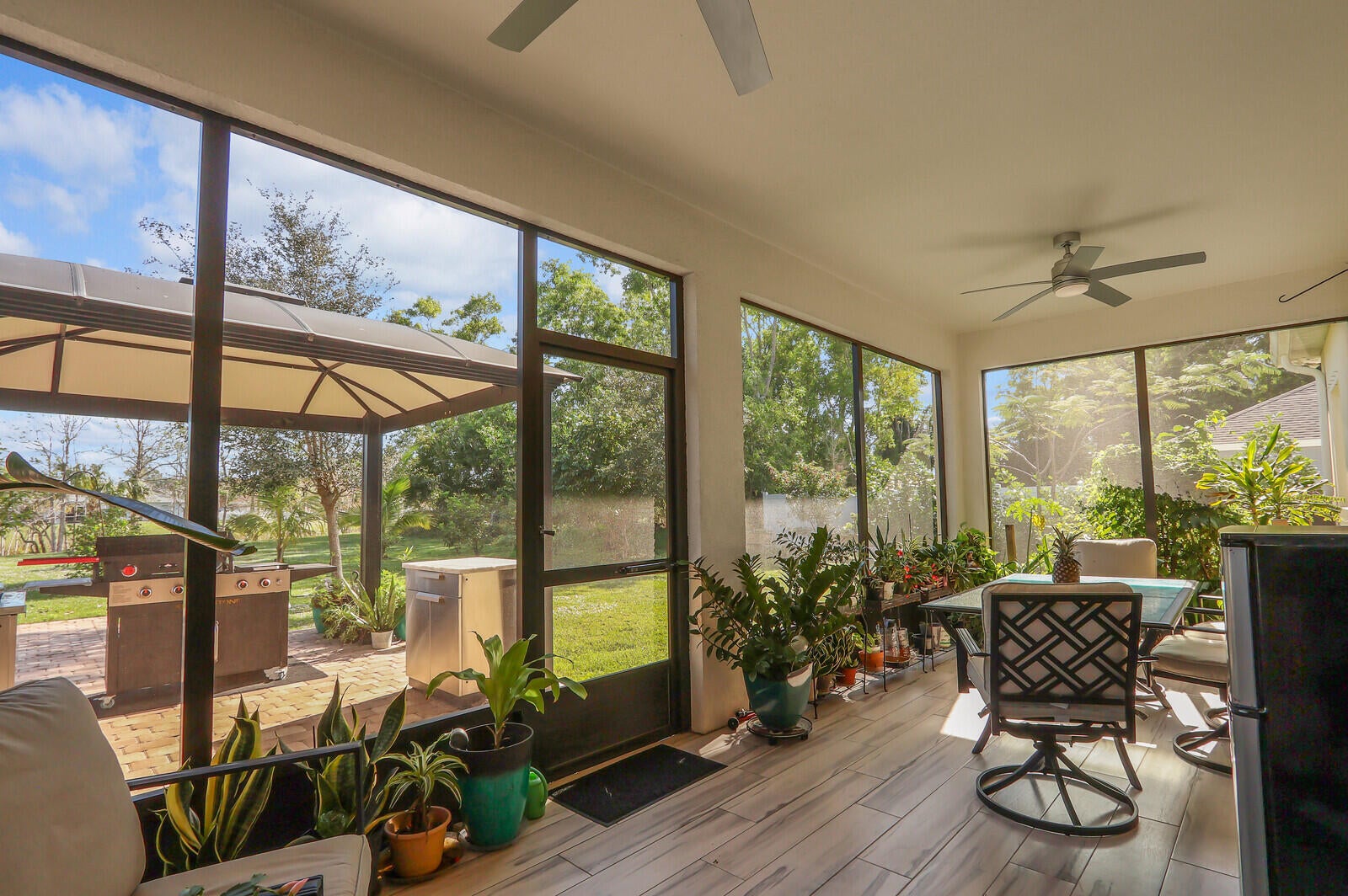 Meticulous! 2019 3bed, 2 bath, PLUS den/office/or potential 4bed w/ large 3-car epoxy garage, pull-down attic stairs & extra side park pad for RV/boat.The open kitchen boasts a large island with quartz countertops, stainless steel appliances and pantry. Relax in the living room by the electric fireplace, or in the screened lanai with tile flooring, an outdoor refrigerator, and well-kept plants. Enjoy the backyard oasis with a paver patio, Blackstone grill, gazebo, separate shed, and mature fruit trees with beautiful PRESERVE view. Upgraded lighting, cabinets, and ceiling fans throughout. Dual UV disinfectant system in HVAC, large primary suite with walk in closet & tray ceiling. Newer gutters and leaders, laundry room w/cabinets and oversized washer and dryer. Ideal St. James location.