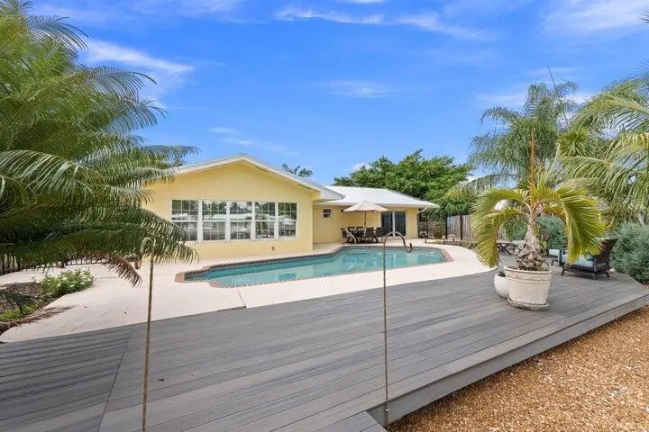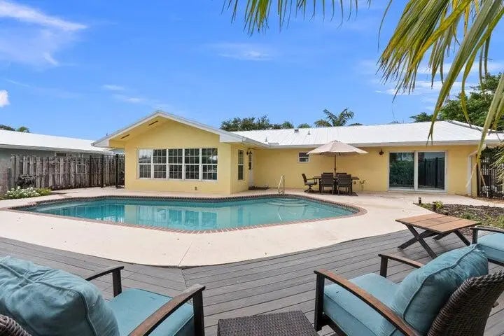 Situated in the prestigious waterfront community of Lighthouse Point/Seagate Harbor, this 3 bed, 2 bath fully furnished home combines exclusive living with convenient Ocean access. Step inside to an inviting open floor plan designed for both relaxation and entertaining. The spacious living areas flow effortlessly into the gourmet kitchen equipped with white quartz countertops, walk-in pantry, shaker cabinets and GAS stove. Escape to the outdoors where a built-in fire-pit, private dock and 25 foot boat lift await, accompanied by lush landscaping and a solar-heated pool. This home is equipped with a durable metal roof, partial impact windows and tinted glass throughout, enhancing both energy efficiency and privacy. Bring your boat, your clothes and your family and enjoy!