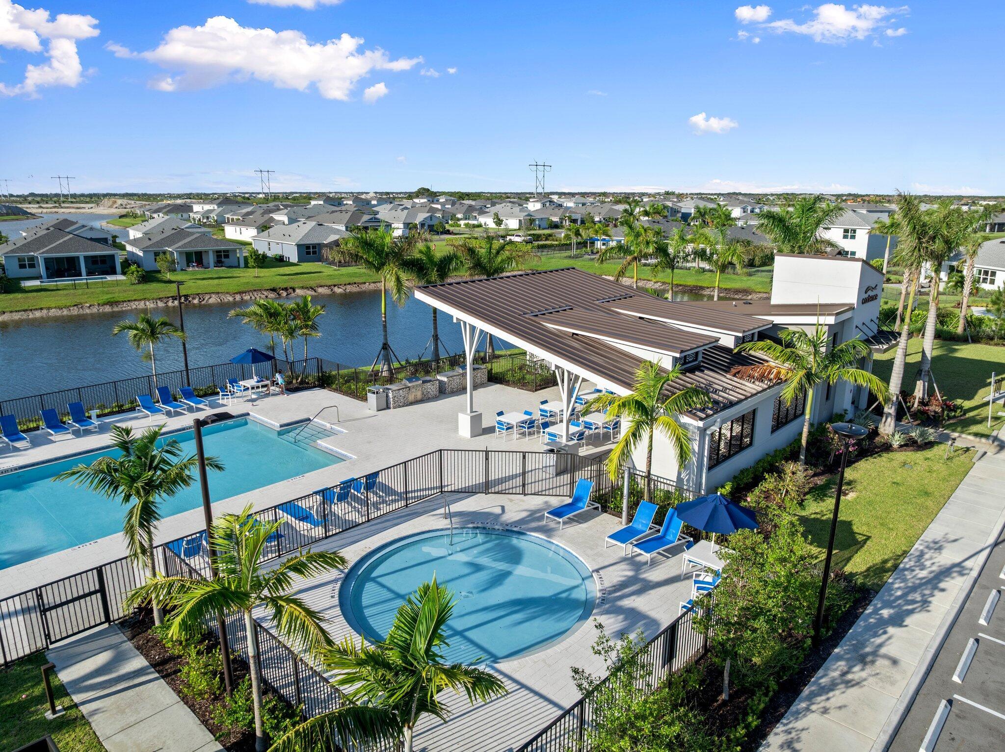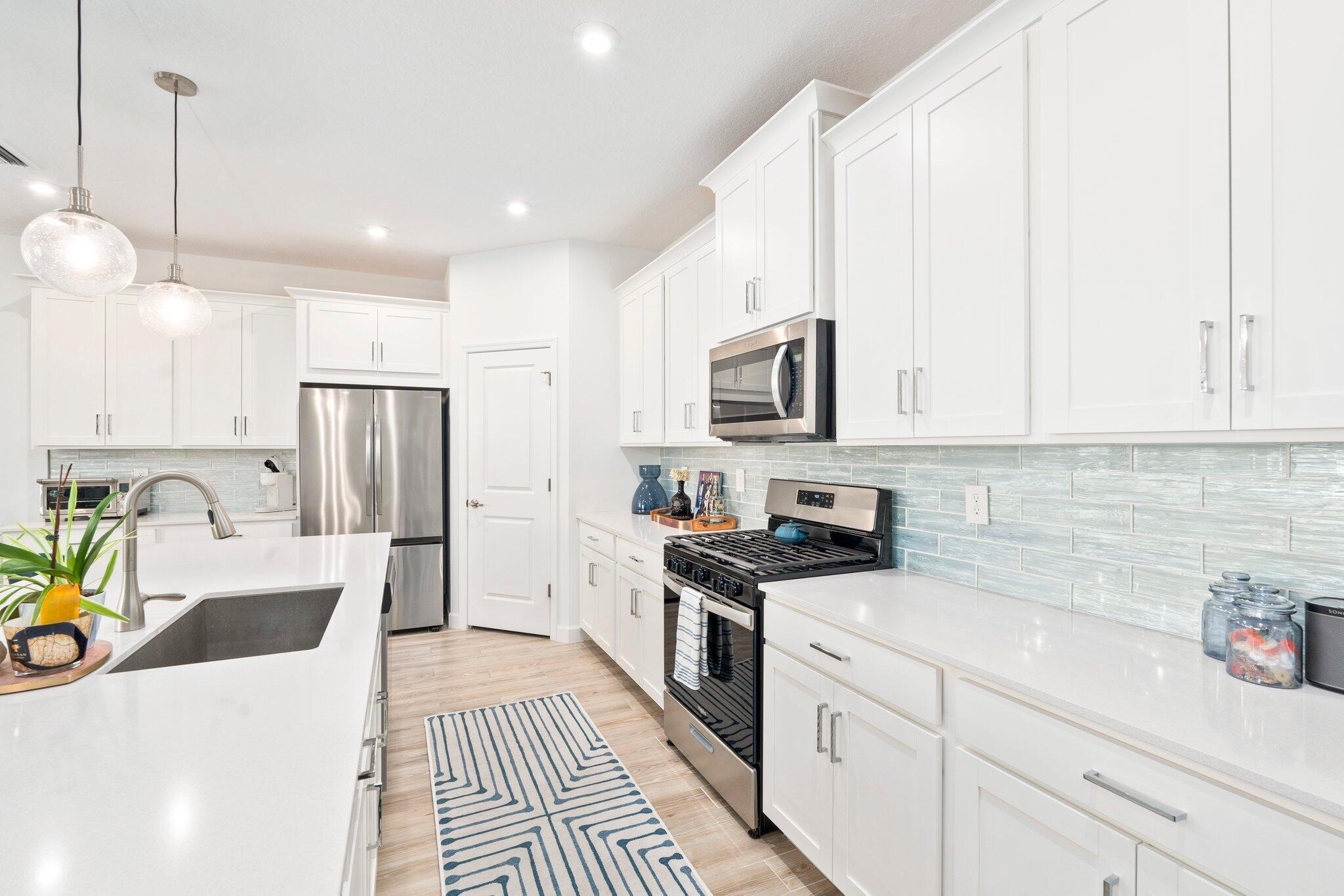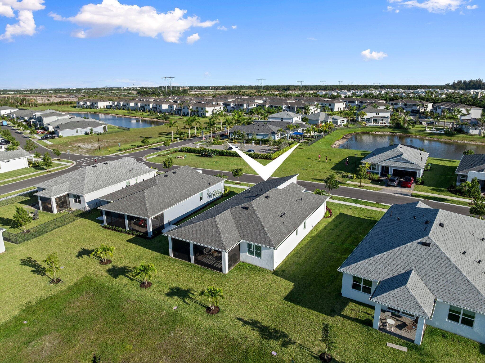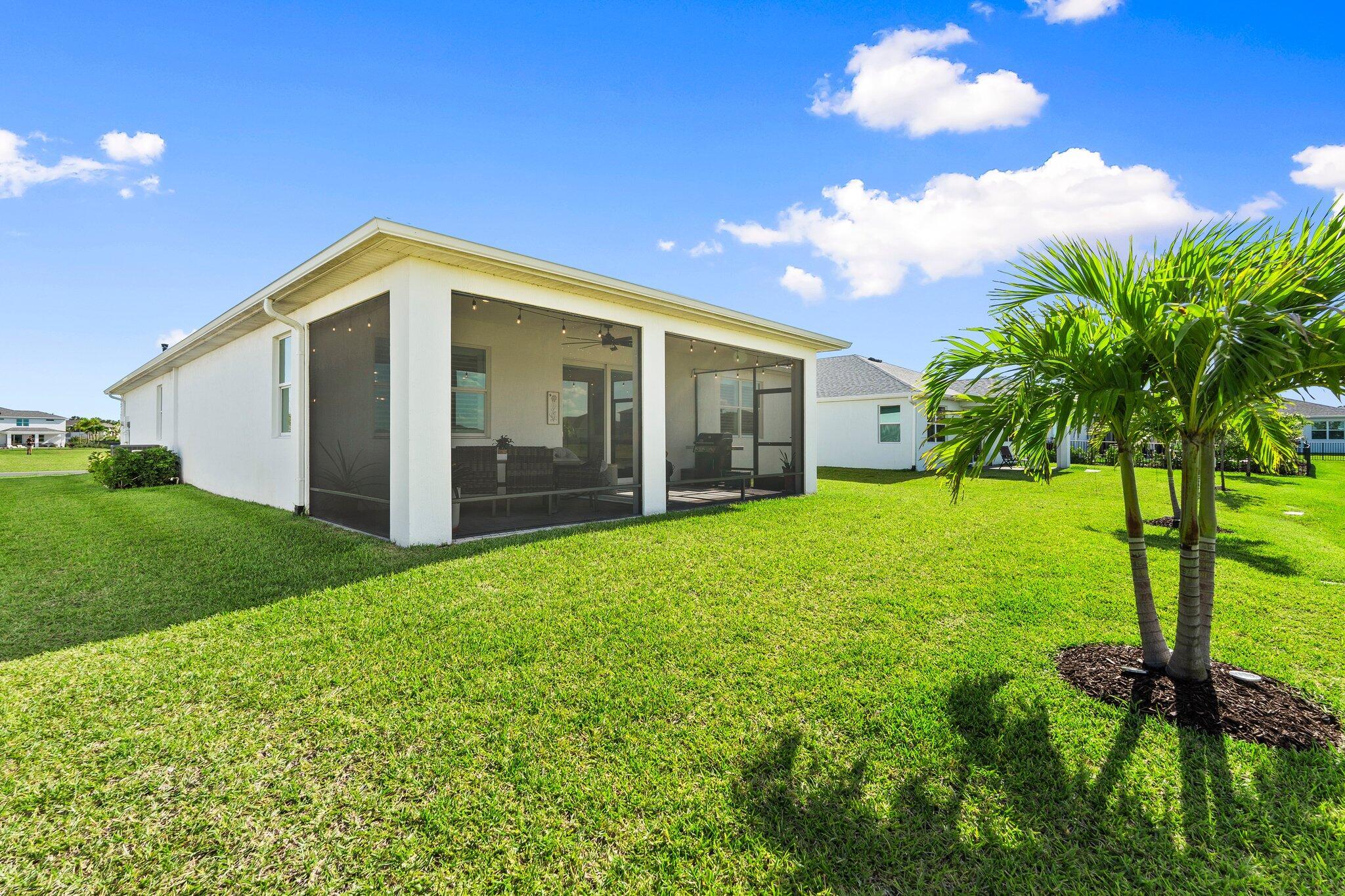 Newer home with upgrades galore! This stunning Gateway model sits on a premium lakefront lot and features an open floor plan with beautiful lake views. Enjoy wood plank tile, soaring ceilings, impact windows/doors, and upgraded fans and fixtures throughout. The gourmet kitchen shines with quartz counters, stainless appliances, gas stove, glass tile backsplash, and a large island. The split floor plan offers a private owner's suite and ample storage with pull-out drawers and a walk-in pantry. Relax on the extended, screened lanai surrounded by tropical landscaping and a yard with room for a pool (pool plan available upon request). Located in Cadence at Tradition with resort-style amenities, scenic trails, and close to shopping, dining, and community events.