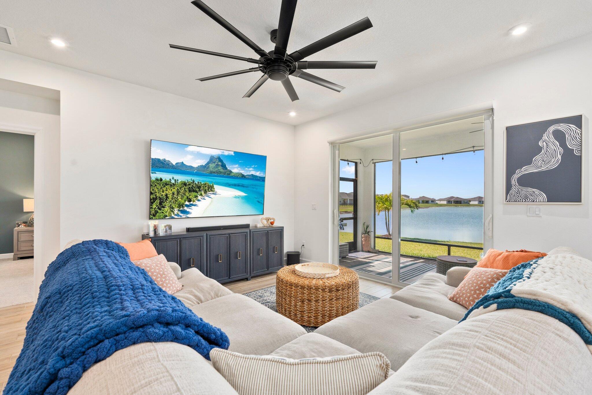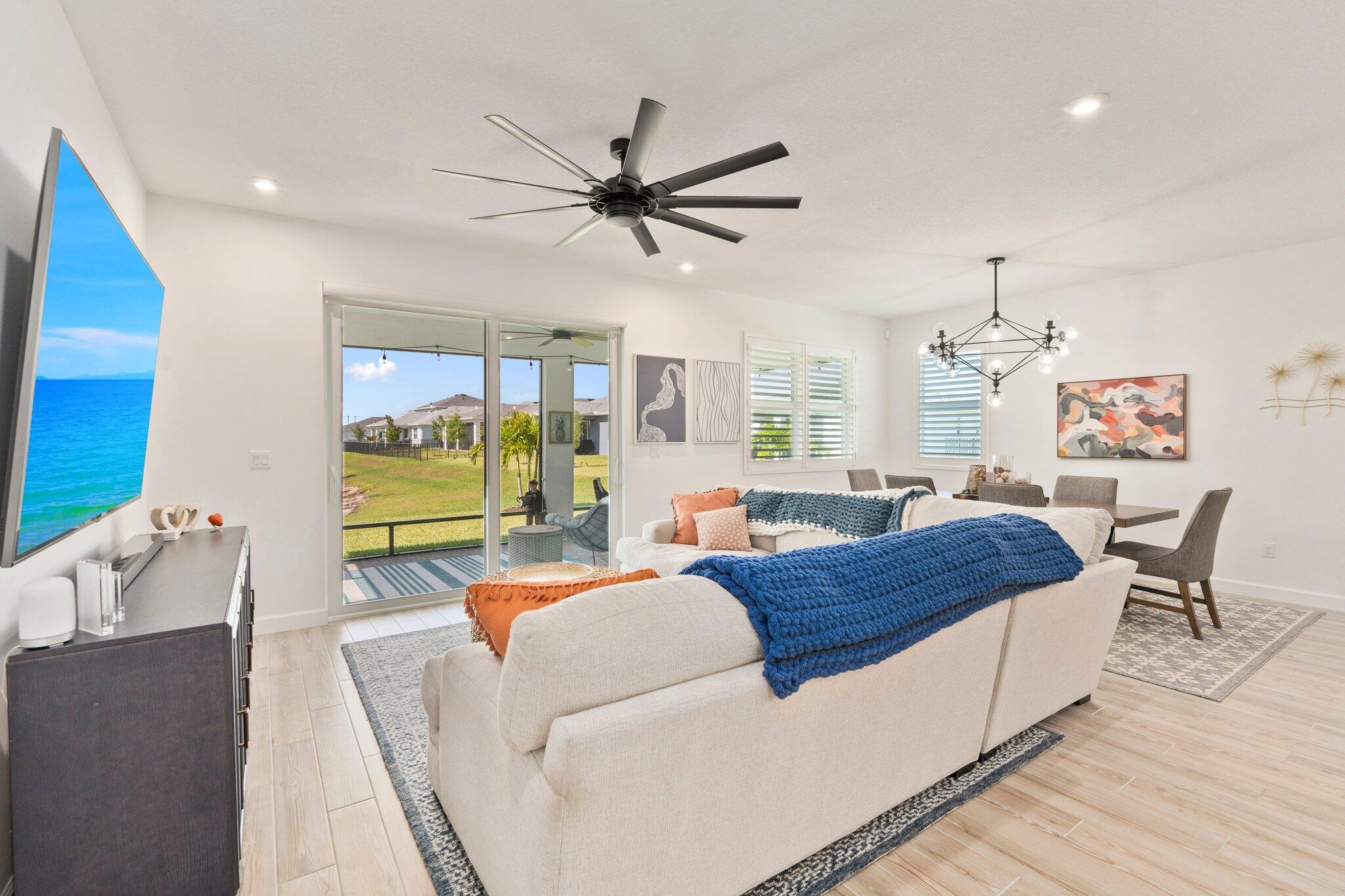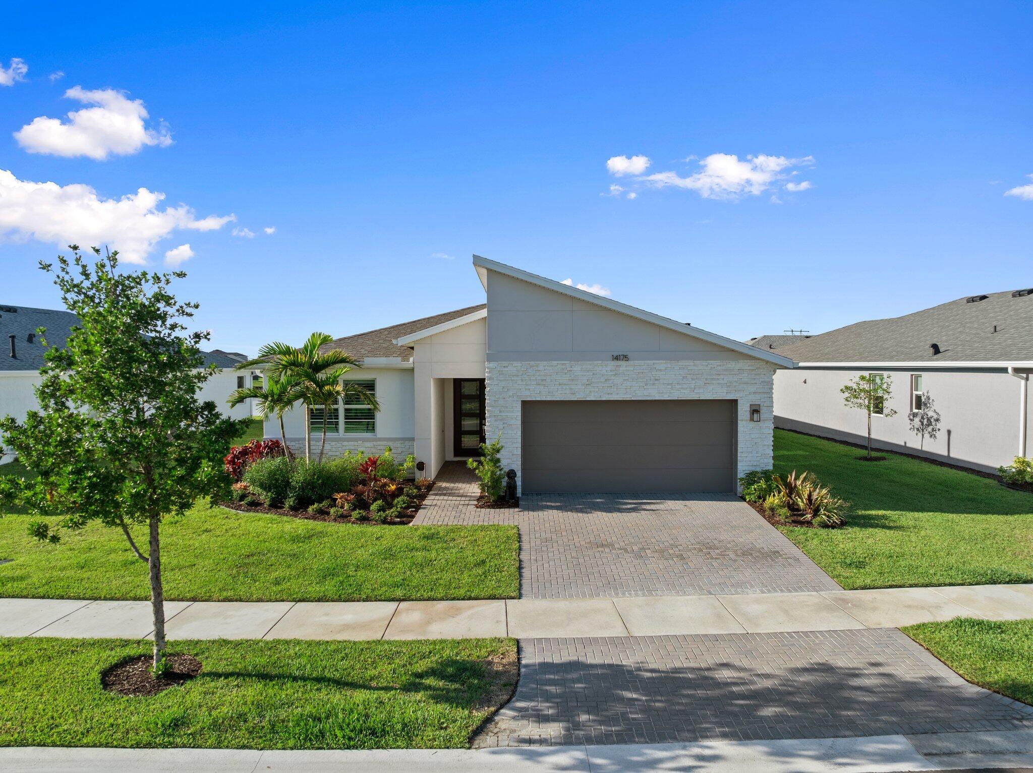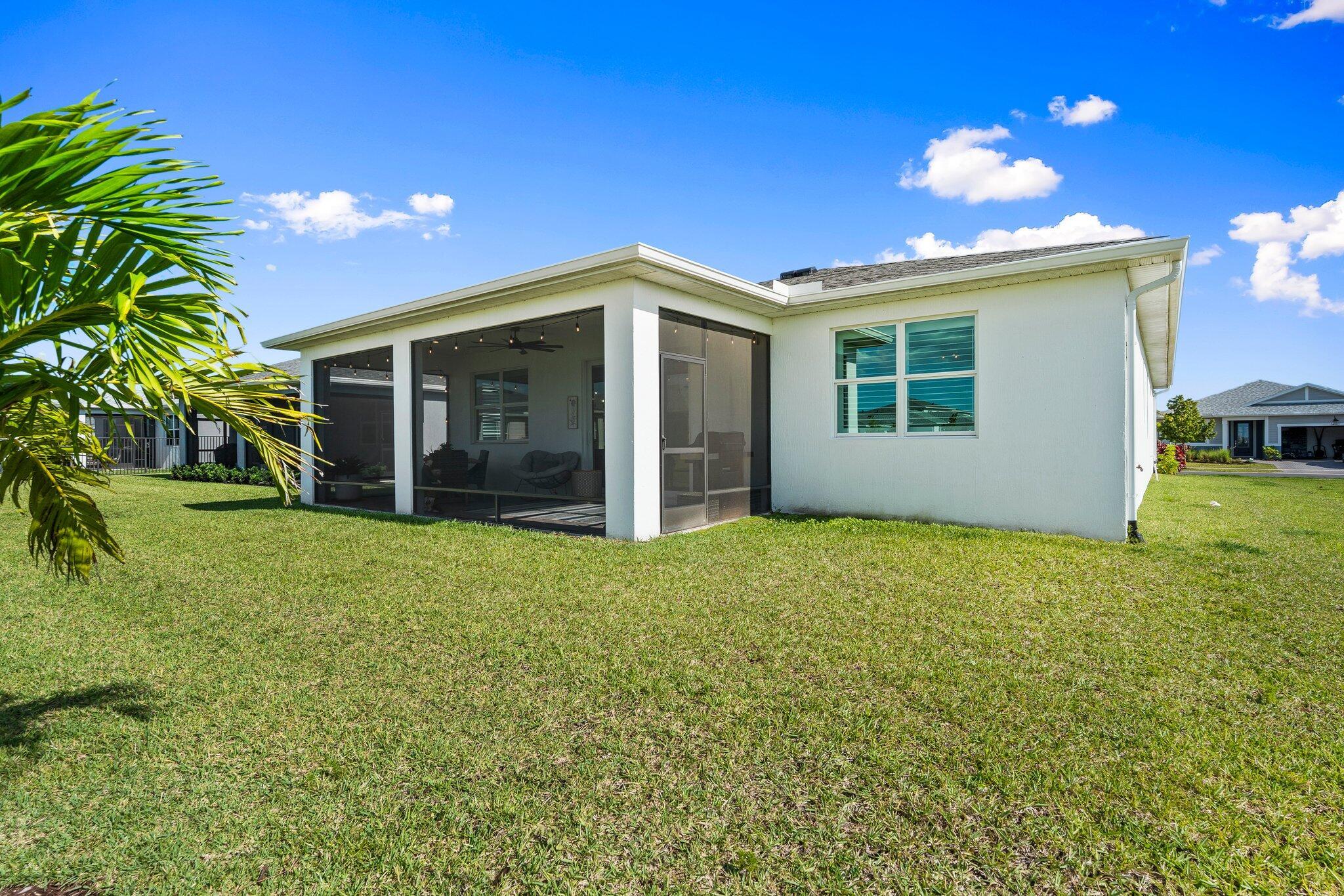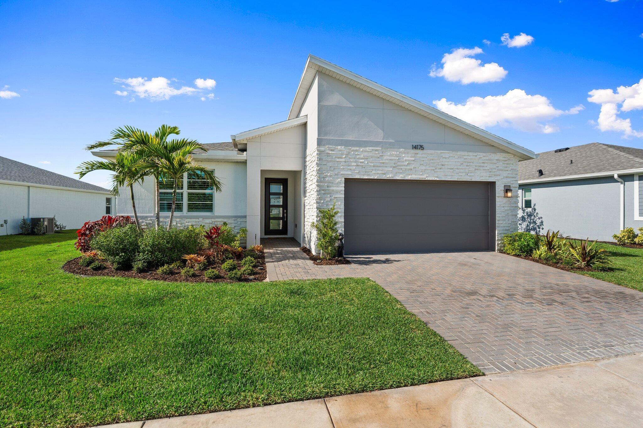 Newer home with upgrades galore! This stunning Gateway model sits on a premium lakefront lot and features an open floor plan with beautiful lake views. Enjoy wood plank tile, soaring ceilings, impact windows/doors, and upgraded fans and fixtures throughout. The gourmet kitchen shines with quartz counters, stainless appliances, gas stove, glass tile backsplash, and a large island. The split floor plan offers a private owner's suite and ample storage with pull-out drawers and a walk-in pantry. Relax on the extended, screened lanai surrounded by tropical landscaping and a yard with room for a pool (pool plan available upon request). Located in Cadence at Tradition with resort-style amenities, scenic trails, and close to shopping, dining, and community events.