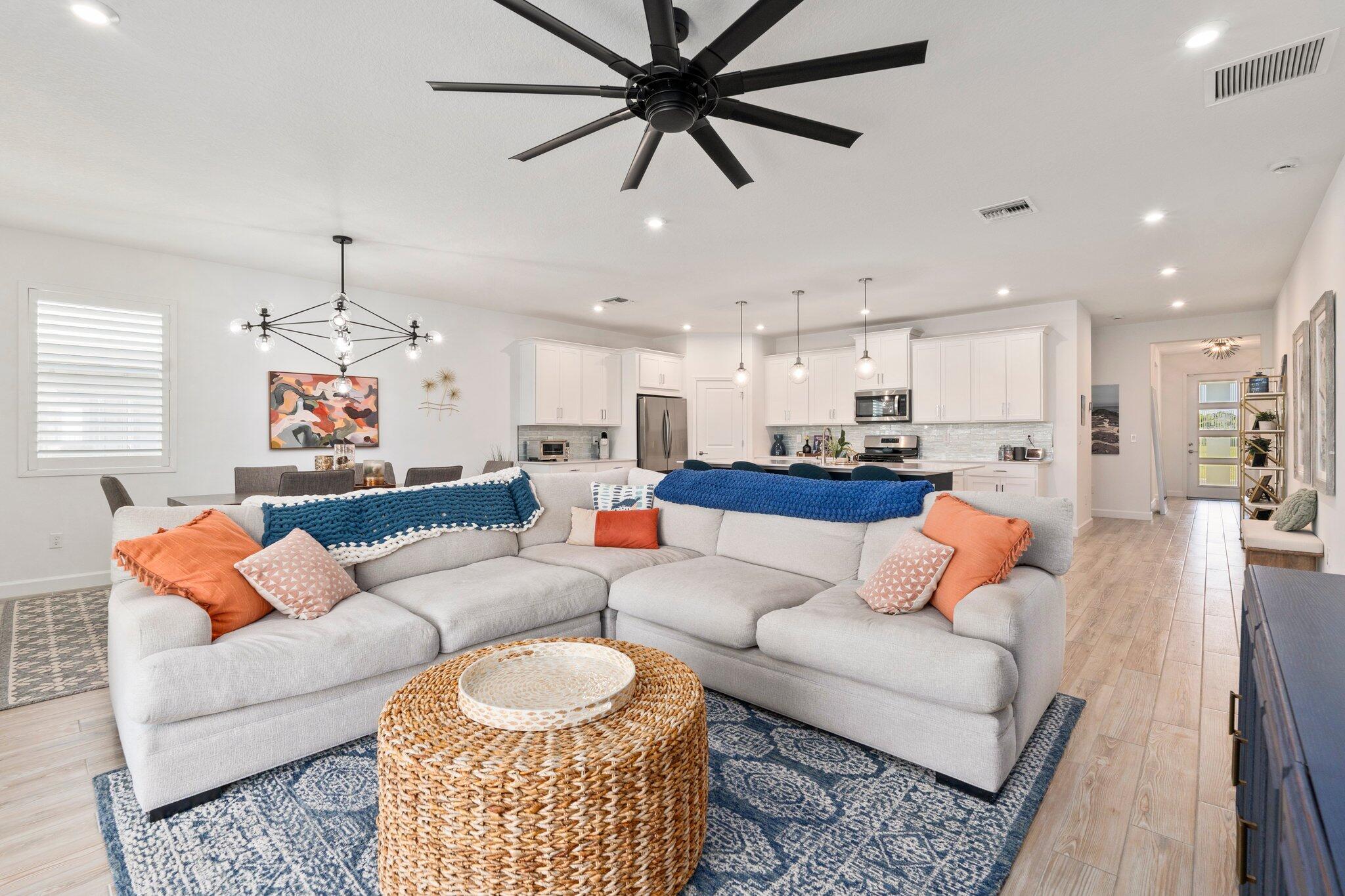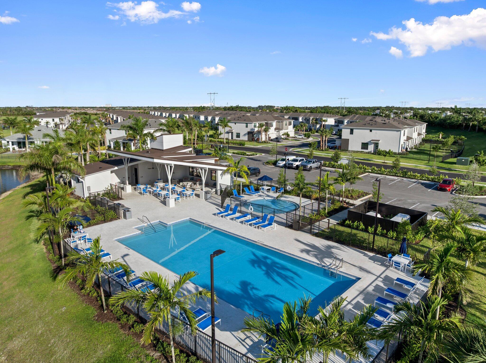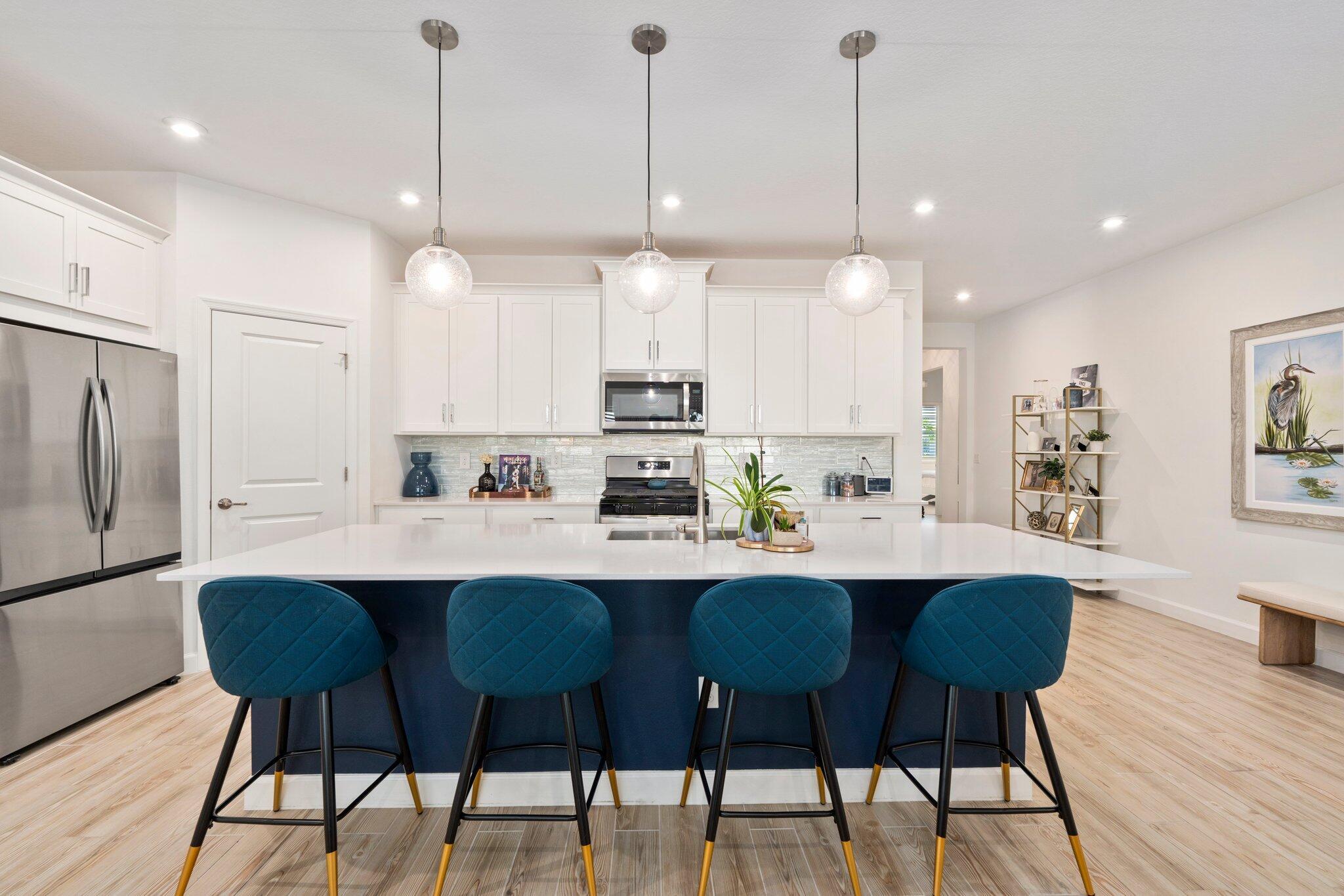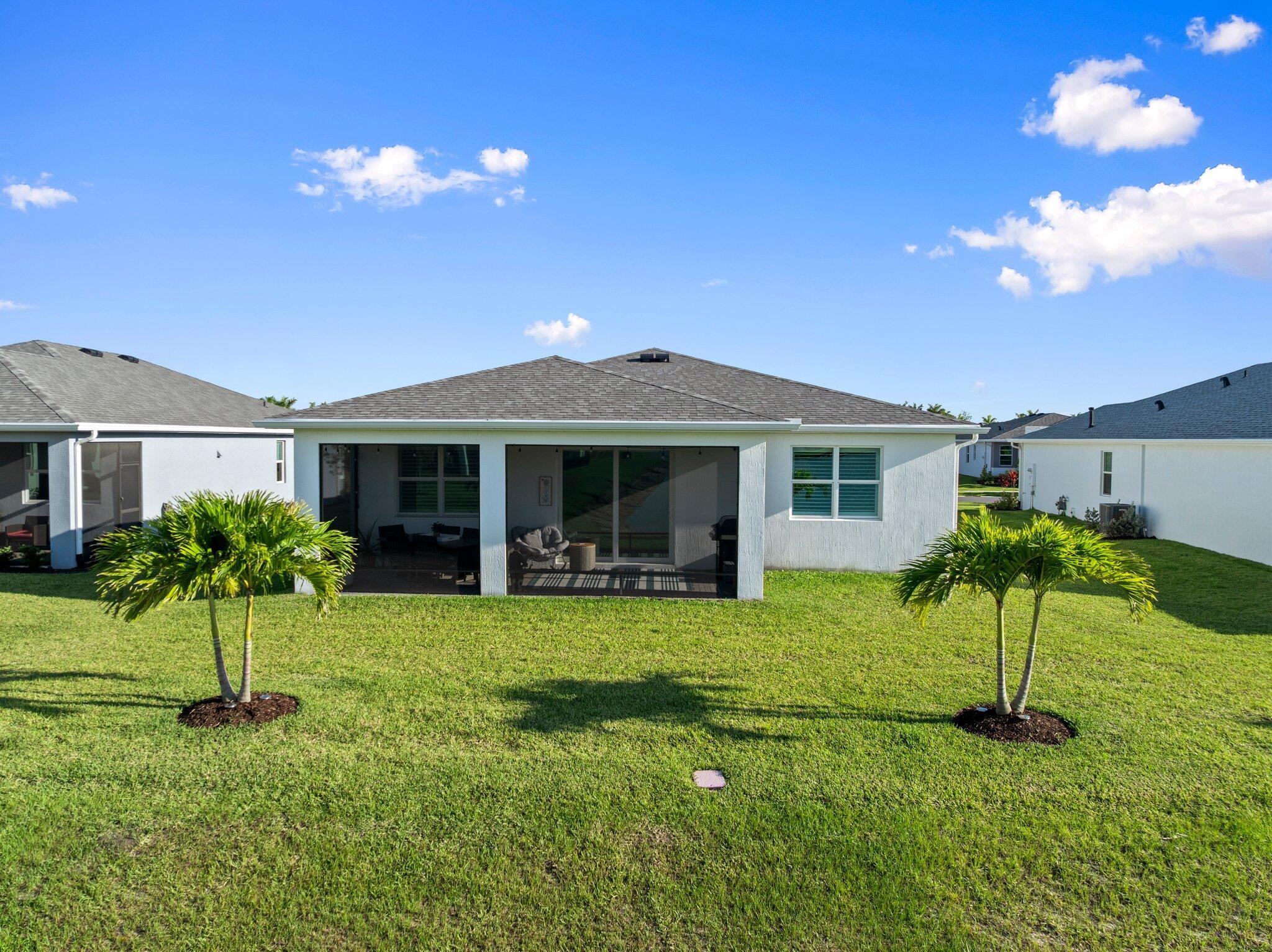 Newer home with upgrades galore! This stunning Gateway model sits on a premium lakefront lot and features an open floor plan with beautiful lake views. Enjoy wood plank tile, soaring ceilings, impact windows/doors, and upgraded fans and fixtures throughout. The gourmet kitchen shines with quartz counters, stainless appliances, gas stove, glass tile backsplash, and a large island. The split floor plan offers a private owner's suite and ample storage with pull-out drawers and a walk-in pantry. Relax on the extended, screened lanai surrounded by tropical landscaping and a yard with room for a pool (pool plan available upon request). Located in Cadence at Tradition with resort-style amenities, scenic trails, and close to shopping, dining, and community events.