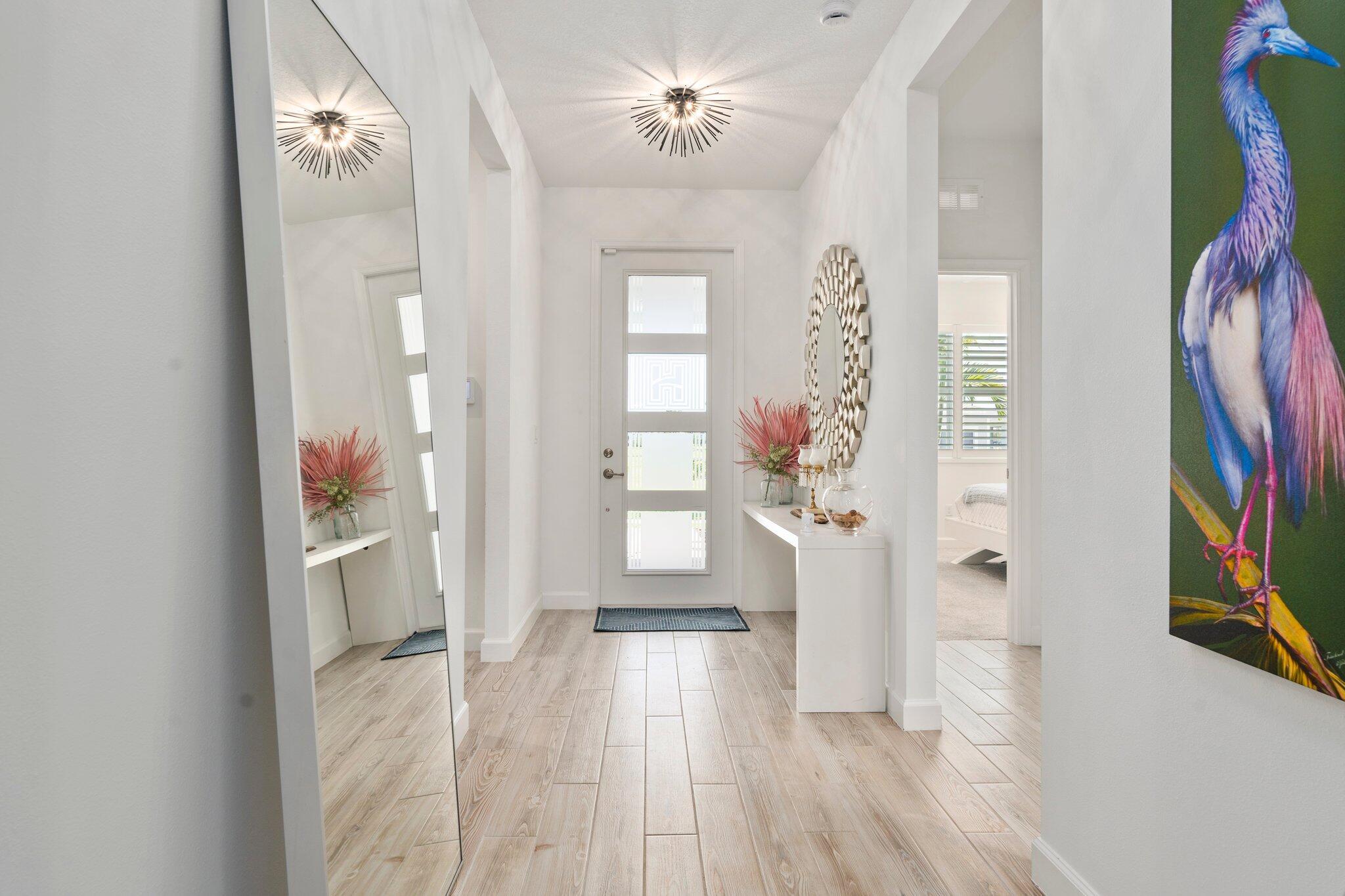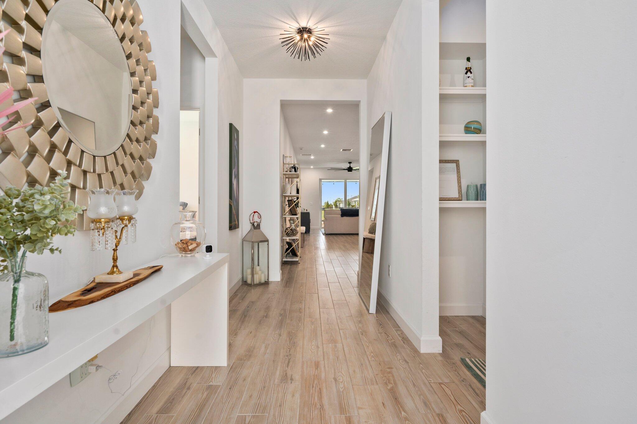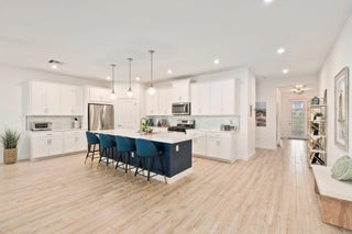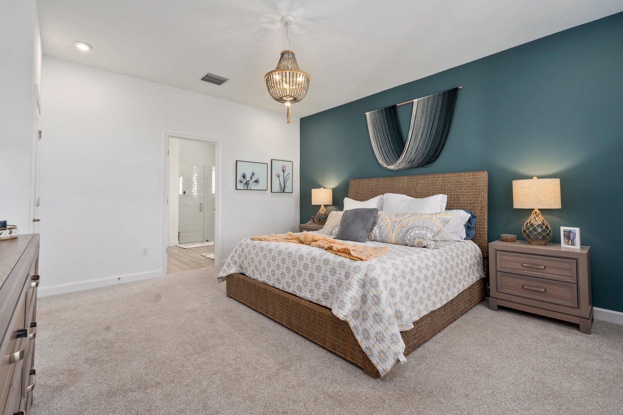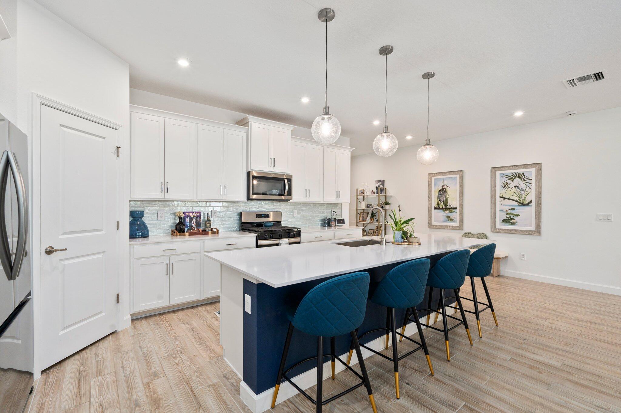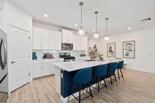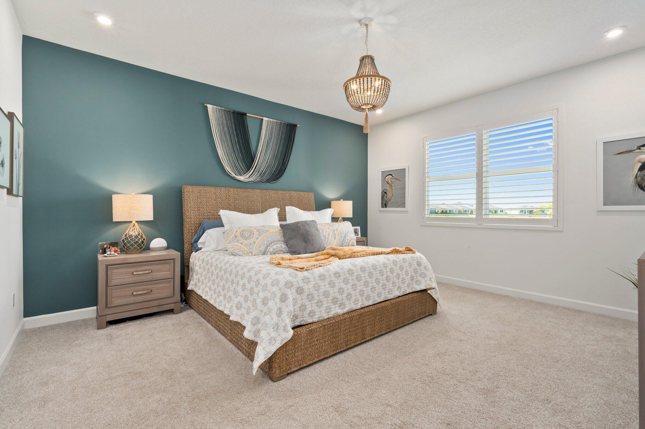 Newer home with upgrades galore! This stunning Gateway model sits on a premium lakefront lot and features an open floor plan with beautiful lake views. Enjoy wood plank tile, soaring ceilings, impact windows/doors, and upgraded fans and fixtures throughout. The gourmet kitchen shines with quartz counters, stainless appliances, gas stove, glass tile backsplash, and a large island. The split floor plan offers a private owner's suite and ample storage with pull-out drawers and a walk-in pantry. Relax on the extended, screened lanai surrounded by tropical landscaping and a yard with room for a pool (pool plan available upon request). Located in Cadence at Tradition with resort-style amenities, scenic trails, and close to shopping, dining, and community events.