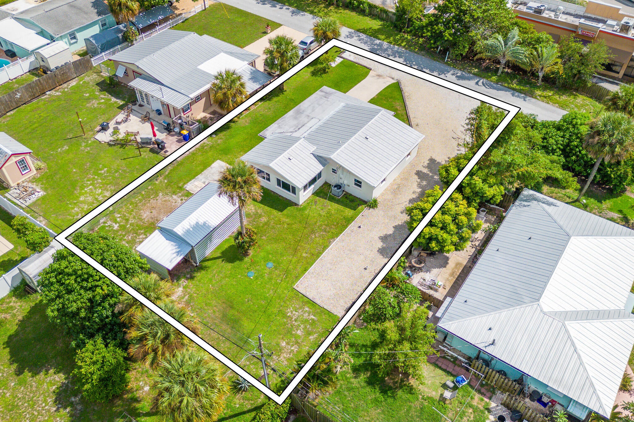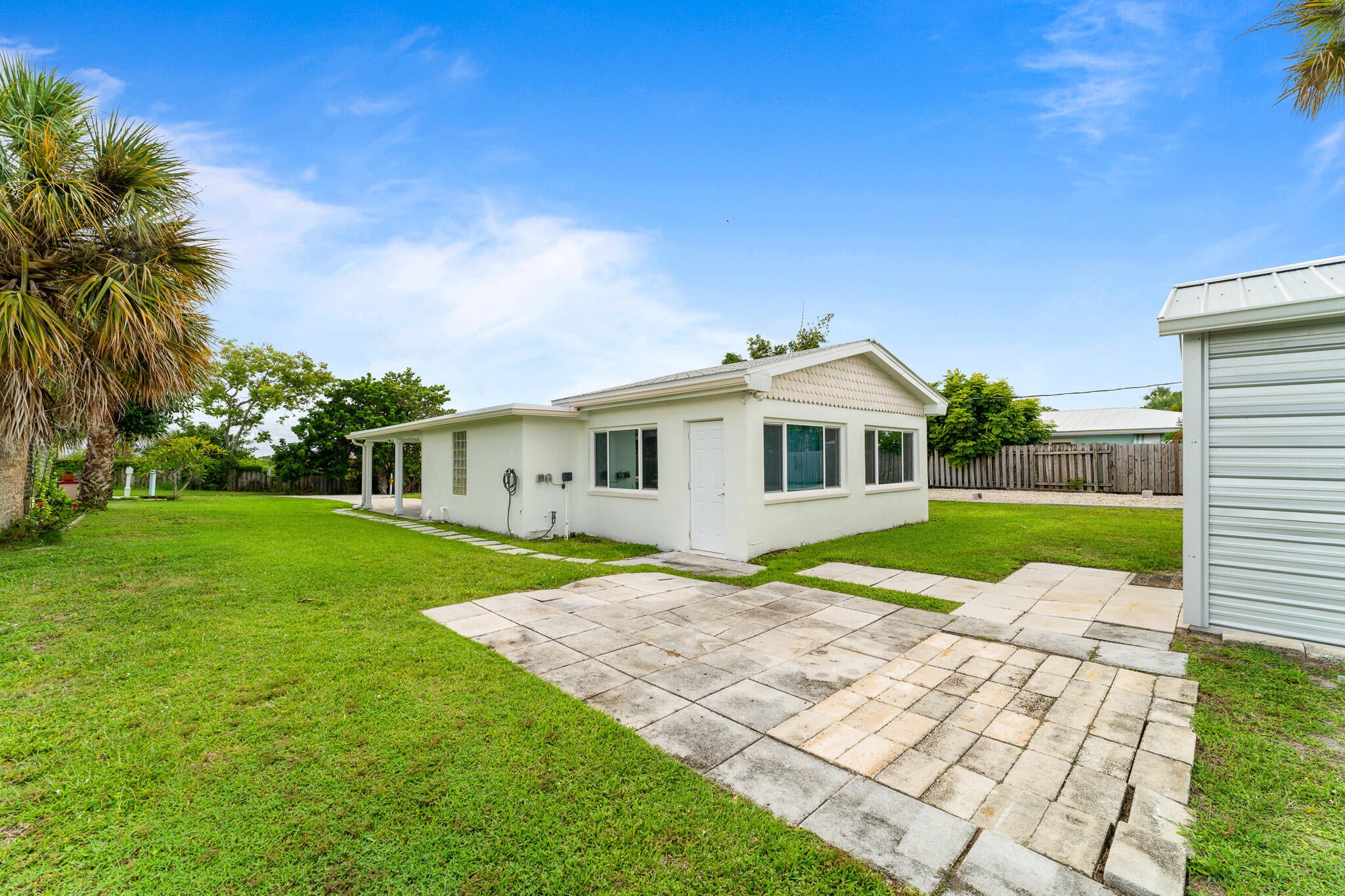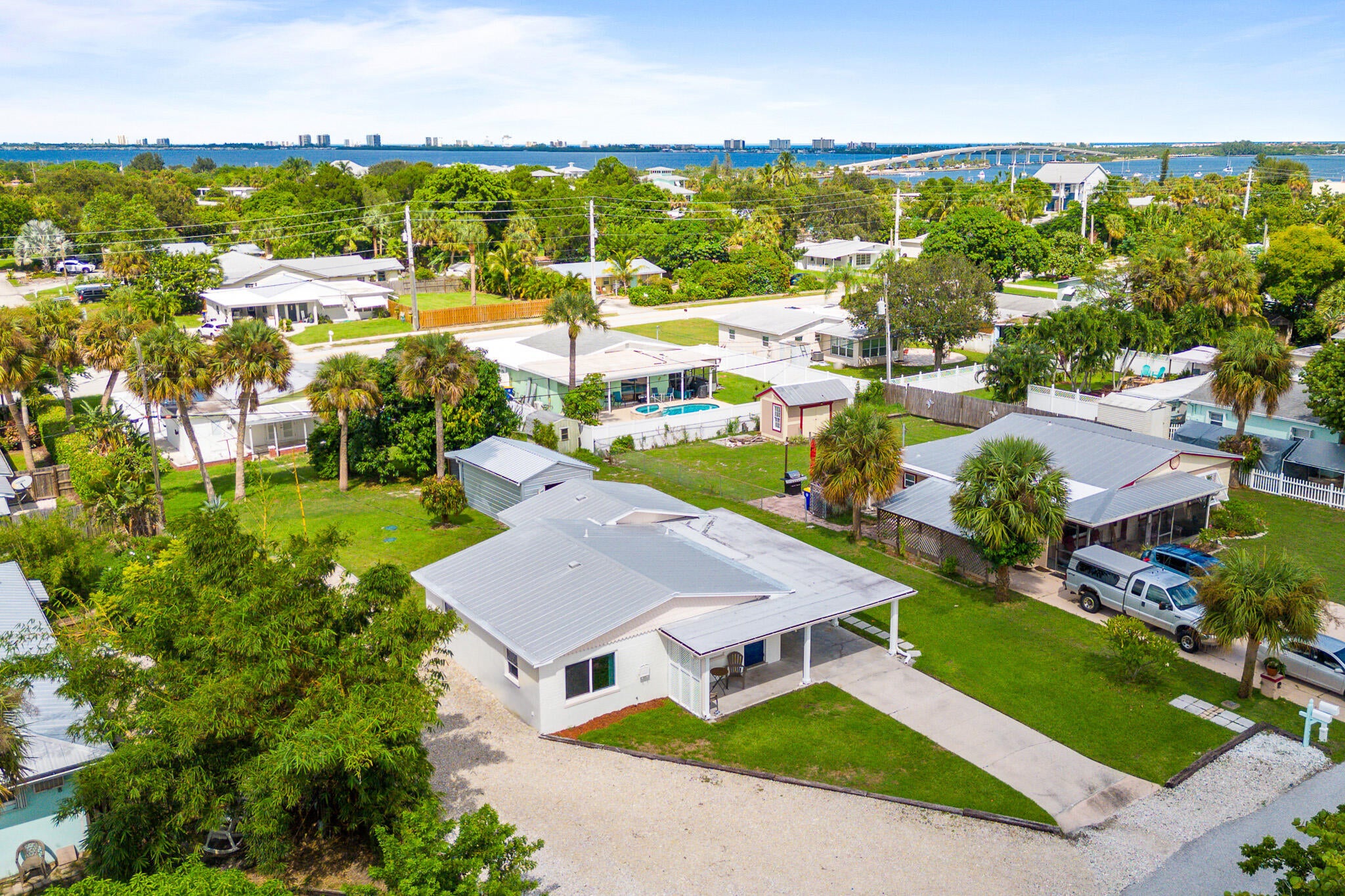 Plenty of room to park your boat, RV and all your toys! Located at the end of a quiet dead end street, this 3 bedroom 2 bathroom concrete block constructed home features a newly remodeled kitchen, newly remodeled bathrooms PLUS a separate laundry room. The main roof is metal and the carport is covered by a NEWLY installed flat roof. The big bonus comes from having 2 driveways! The main driveway is perfect for everyday parking and the huge side driveway is perfect for a boat, RV and all your toys! Set on a bluff, this superior location offers terrrific breezes and it also means NO FLOOD INSURANCE required. The large steel shed out back makes a perfect workshop, man cave or she shed or just use it for extra storage.The local boat ramp and Hutchinson Island Beaches are less than 5 minutes away and Publix Supermarket, local restaurants, farmers market, watering holes and Historic Downtown Jensen Beach are TRULY all within walking distance for real! You will not find a better location!