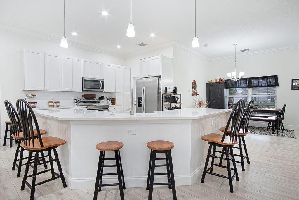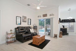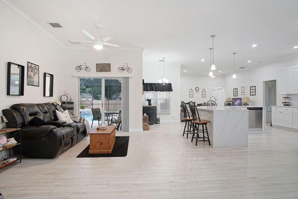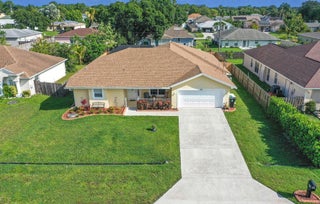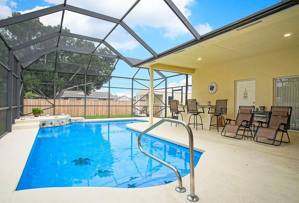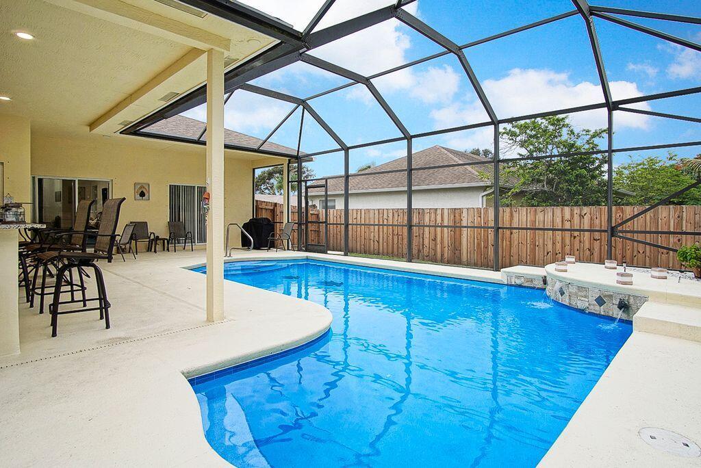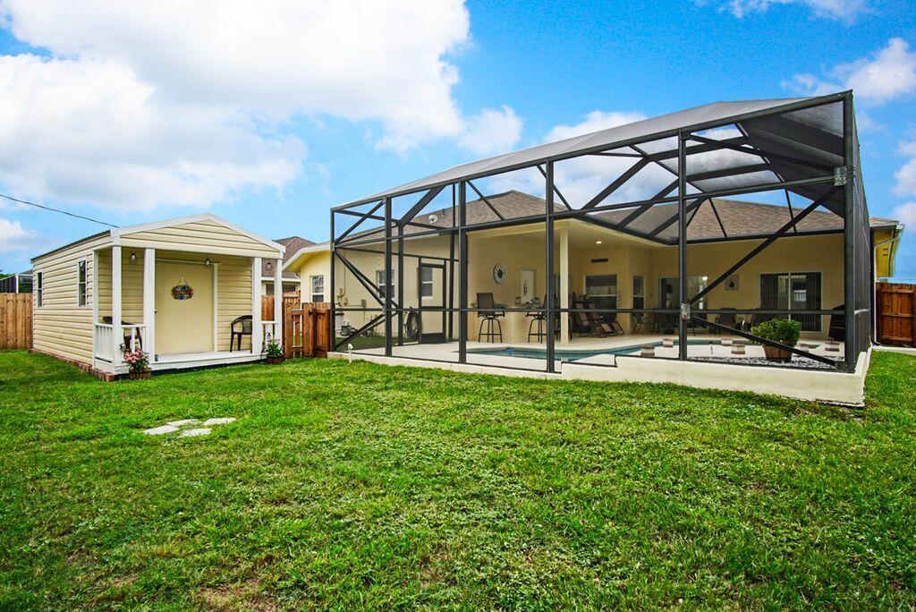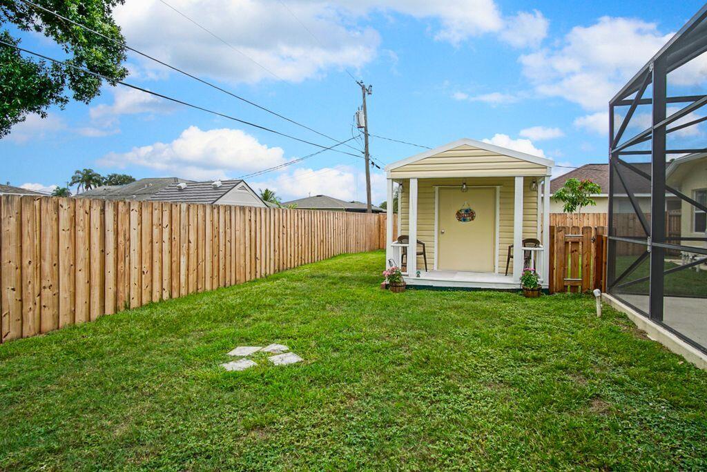 Amazing pool home in the heart of Port St. Lucie. This gorgeous remodeled 4 large bedroom 3 bathroom house has it all. Open concept to a gourmet kitchen equipped with quartz countertops with a waterfall island for added space. Perfect for entertaining family and friends. Cute front porch to sit away the mornings. Large newly rescreened pool patio area with access to a cabana bathroom. Large shed (10x20) in backyard with electricity for a workshop or She Shed. Strapped down for storm protection. Whole house generator 2024, Roof 2023, AC 2023, HWH 2023, gutters and newly fenced yard. Close to everything PSL has to offer.