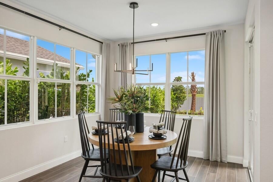 K. Hovnanian's Four Seasons at Wylder, a new active adult 55+ community in Port St. Lucie Florida!This beautifully appointed Astaire floor plan blends thoughtful design with high-end finishes and an incredible lake view.Just off the foyer, a private home office with sliding doors offers a quiet space for work or study, enhanced by a custom feature wall that sets the tone for the home's stylish interior. The great room showcases a vaulted ceiling with stained beams and opens to a covered lanai through a 12' multi-slide glass door. The lanai continues the vaulted ceiling, creating a seamless transition to outdoor living overlooking the lake.The open dining area also offers patio access--ideal for effortless entertaining. The chef-inspired kitchen is anchored by stacked BrellinGreyhound cabinetry with glass-front uppers, GE stainless steel appliances (including washer/dryer), and thoughtful finishes throughout. Retreat to the spacious primary suite, where a feature wall adds visual interest and the bath includes dual freestanding vanities for elevated comfort. A utility sink in the laundry room adds extra convenience, while the included Home Technology Suite brings smart living to life. Additional highlights include a pool pre-wire and serene water viewsthis home is designed for both luxury and livability. Enjoy an all-inclusive, resort-at-home lifestyle with access to countless amenities and activities. Residents can take advantage of the community's clubhouse, which features a state-of-the-art fitness center, game room, a catering kitchen and a bustling calendar of classes, clubs, and activities. All of these mere steps from you front door. Located in sunny Port St. Lucie, Florida, residents can also enjoy outdoor activities year-round. Take a dip in the tropical beach-entry pool or enjoy the poolside cabana. Get a great session of exercise on one of the pickleball courts. Plus, there are always social events and outings so you can get to know your neighbors and enjoy the fun together. Experience the best of active adult 55+ living together with South Florida's natural beauty.
