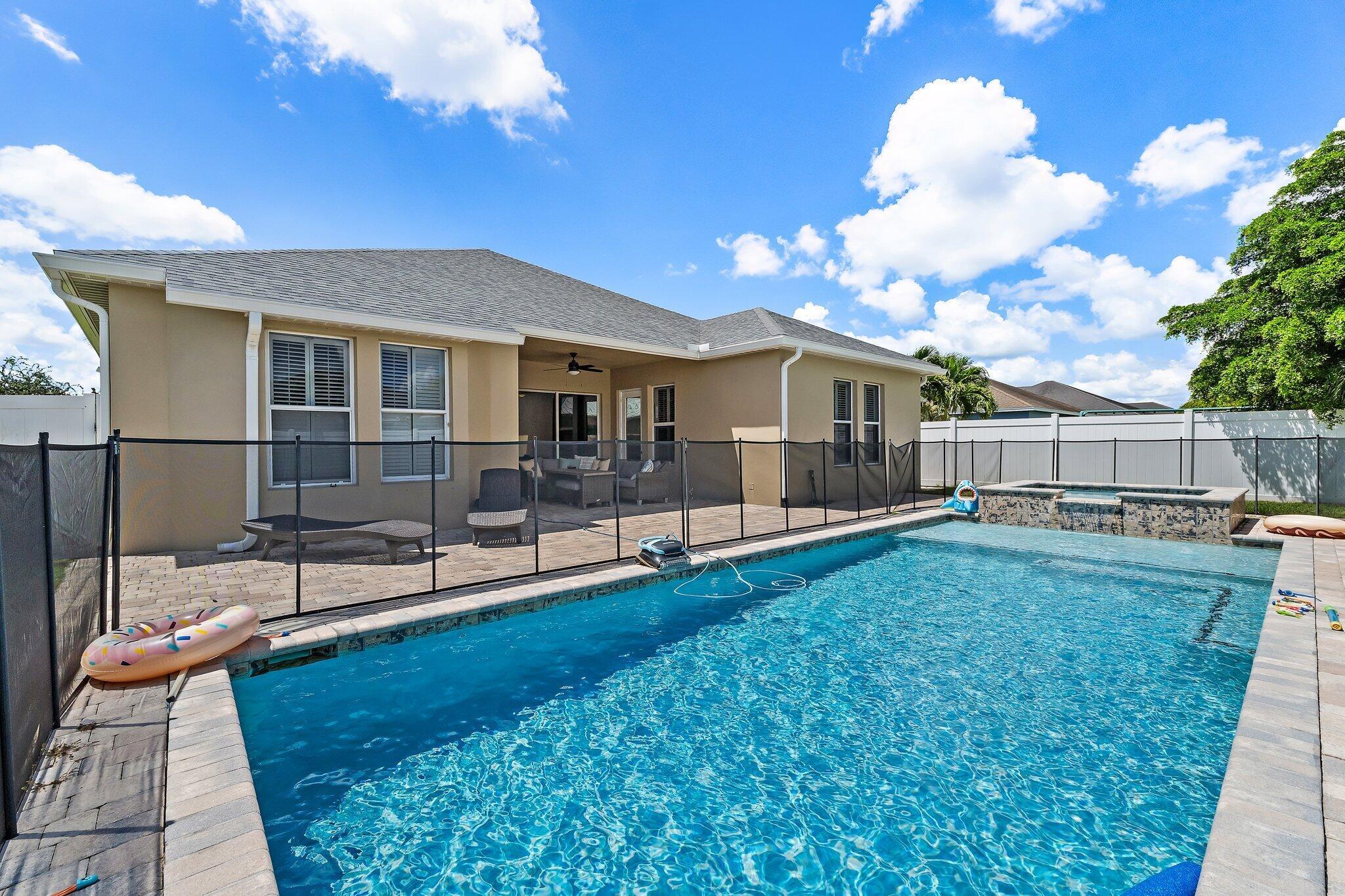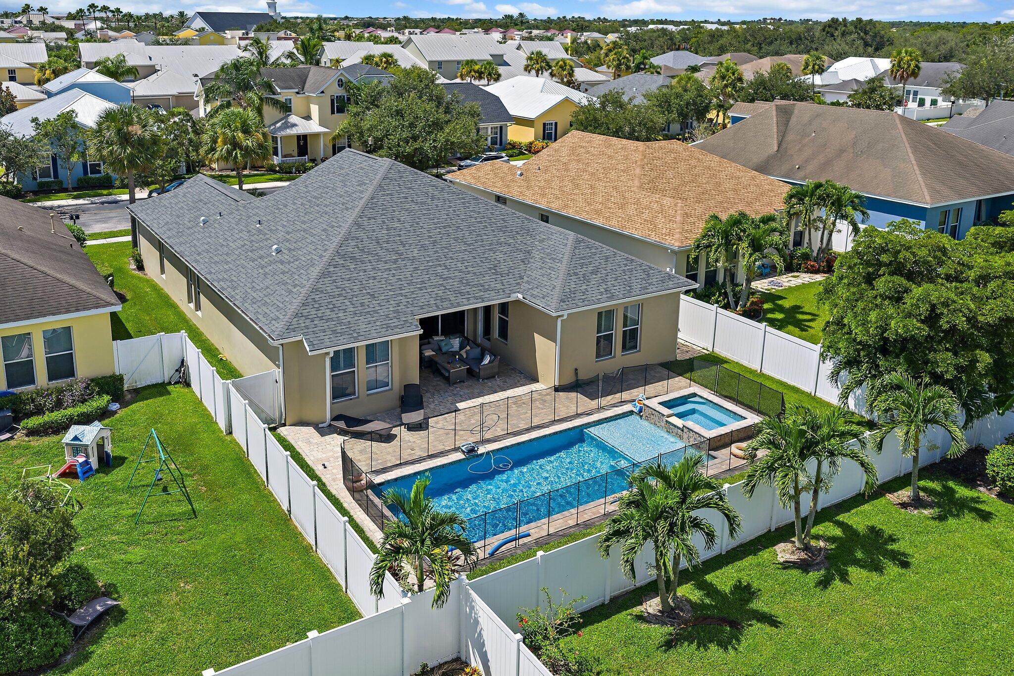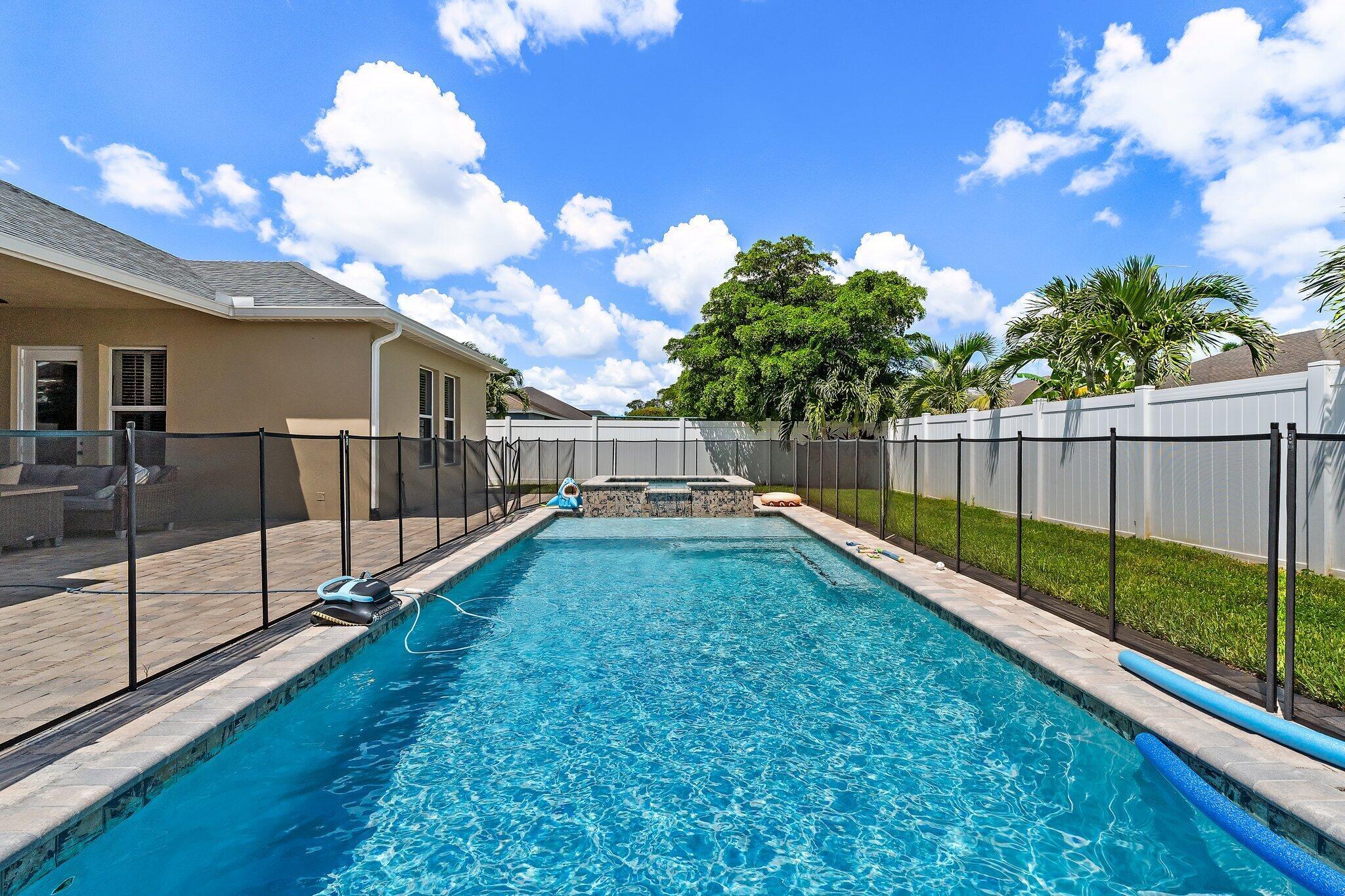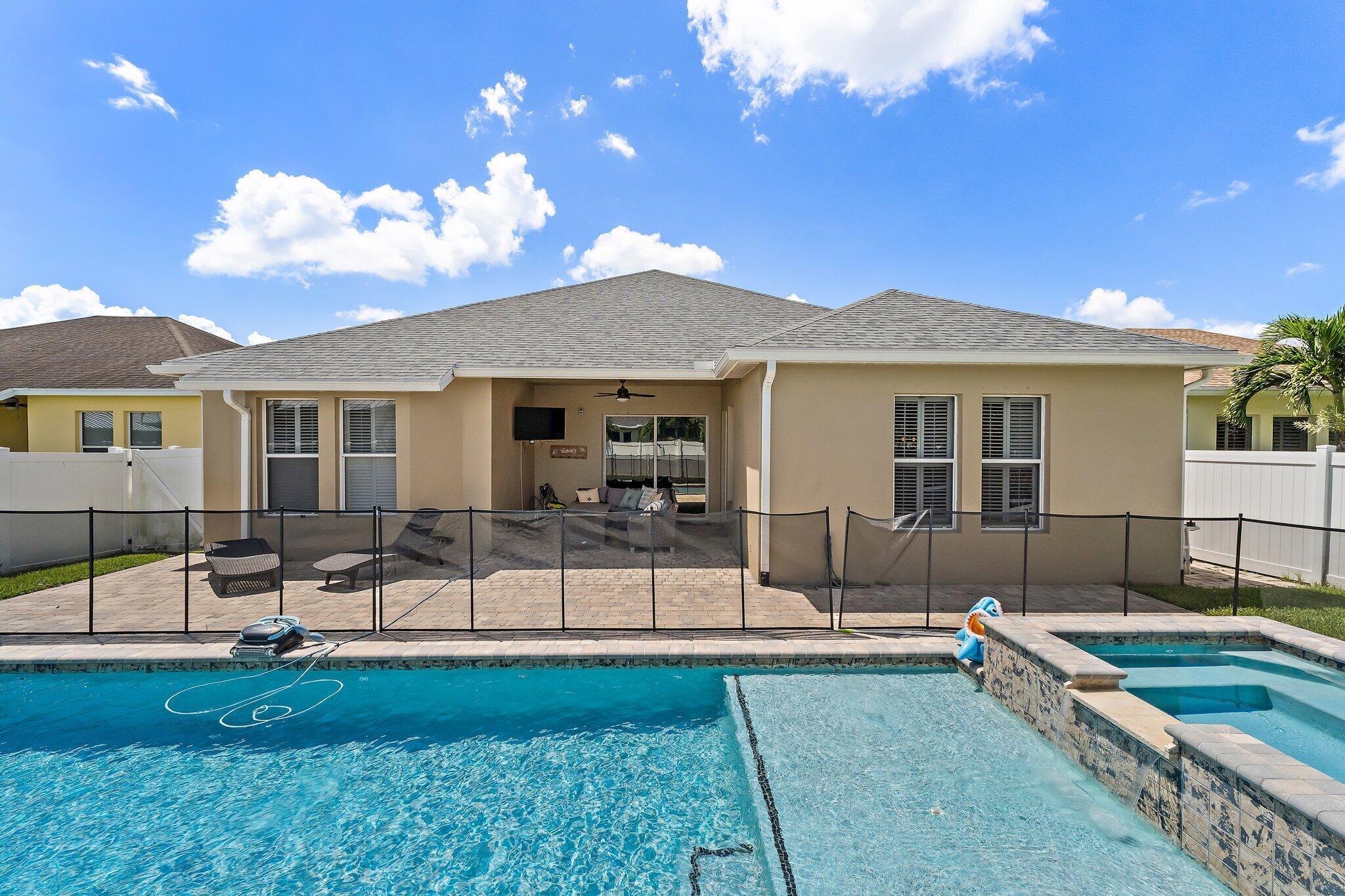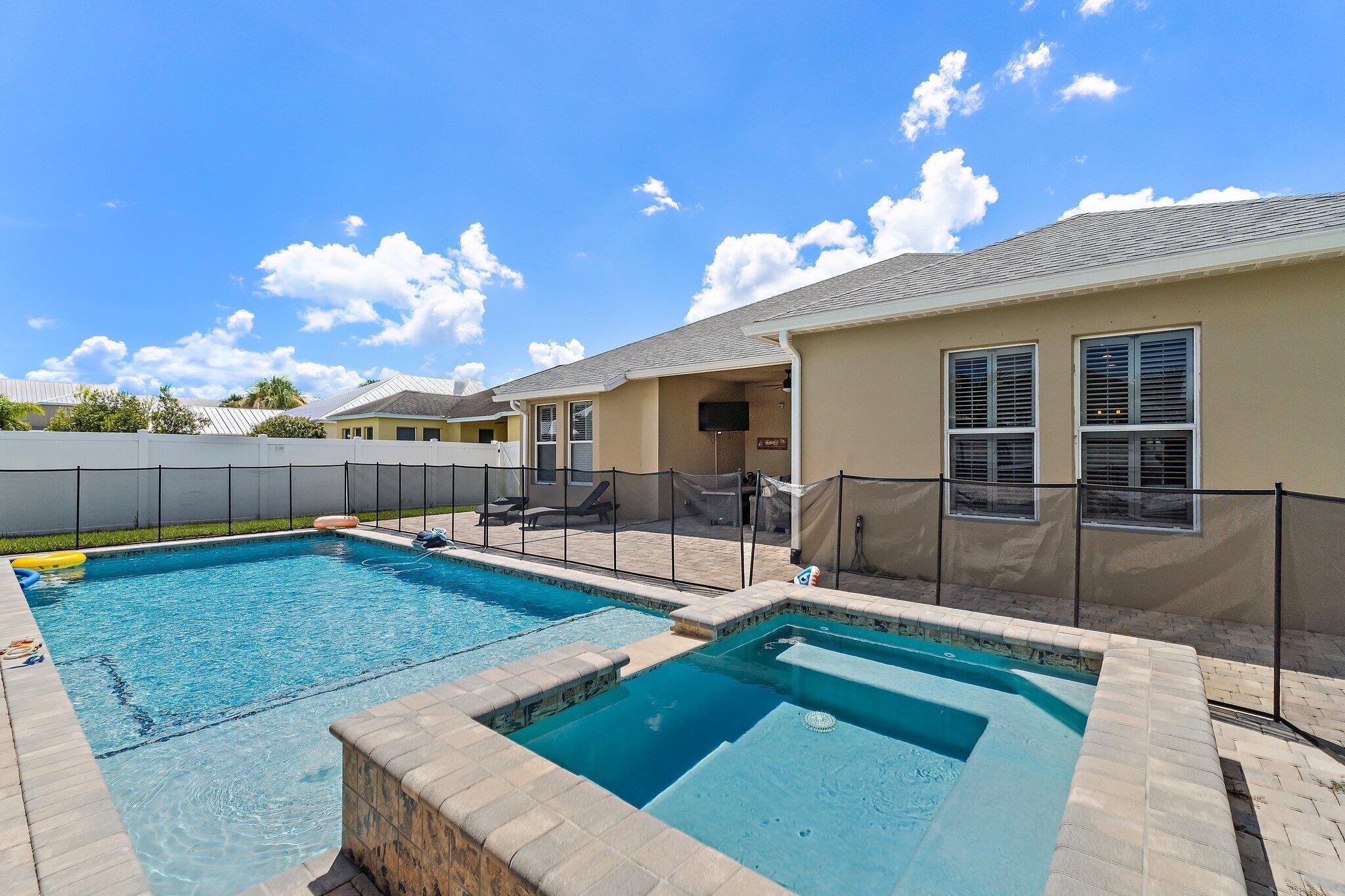 Enjoy all the perks of Tradition including parks, A-rated schools, restaurants shopping & more! Introducing this stunning 4BR, 2.5BA home with 2-car garage & metal roof. Bright open floor plan features an updated kitchen with quartz countertops, shaker soft-close cabinets, stainless steel appliances, cooktop & wall oven. LVP flooring, plantation shutters while crown molding in bedrooms add a touch of elegance. Spacious primary suite with walk-in closet & updated guest bath. Step outside to a heated saltwater pool & hot tub, paver deck with child safety gate, and fully fenced PVC yard for added privacy--perfect for relaxation & entertaining!