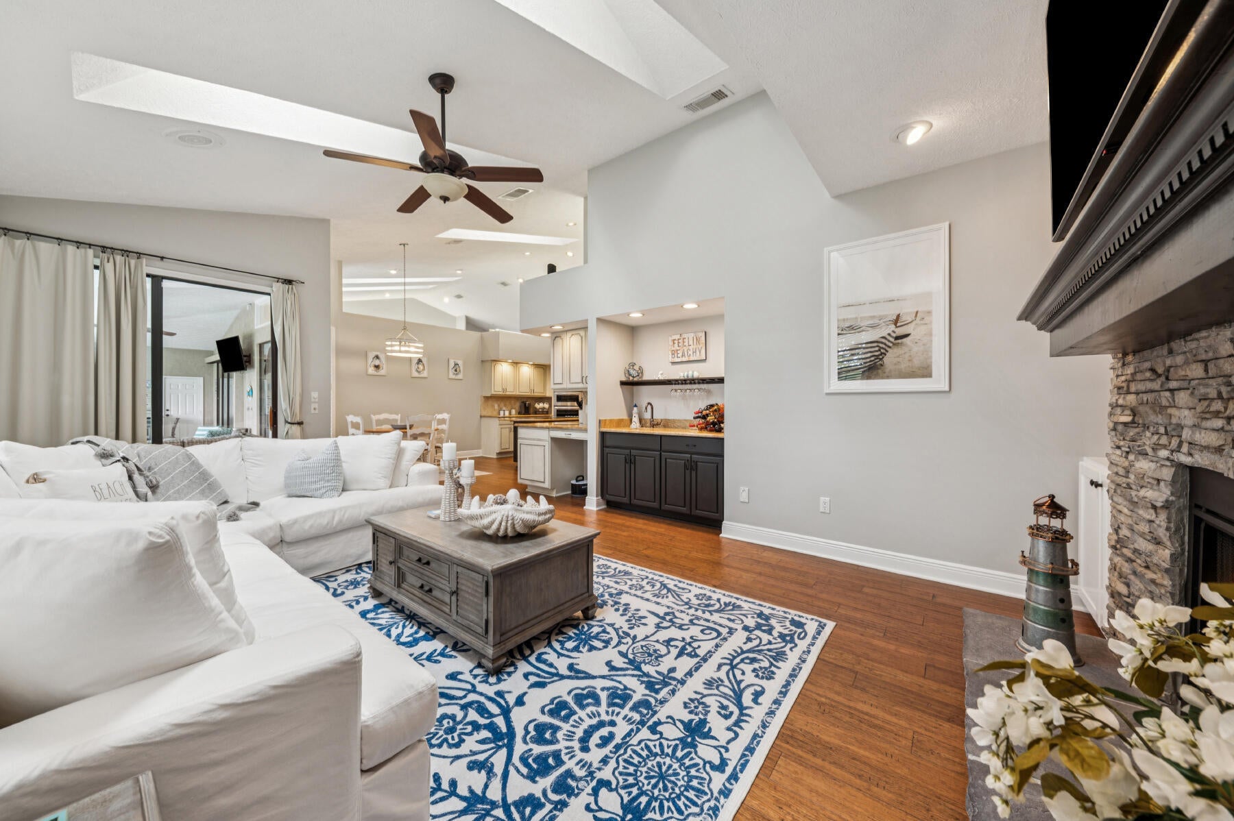 Bar, Built-in Shelves, Decorative Fireplace, Cook Island, Laundry Tub, Volume Ceiling, Walk-in Closet, Wet Bar, Sky Light(s)