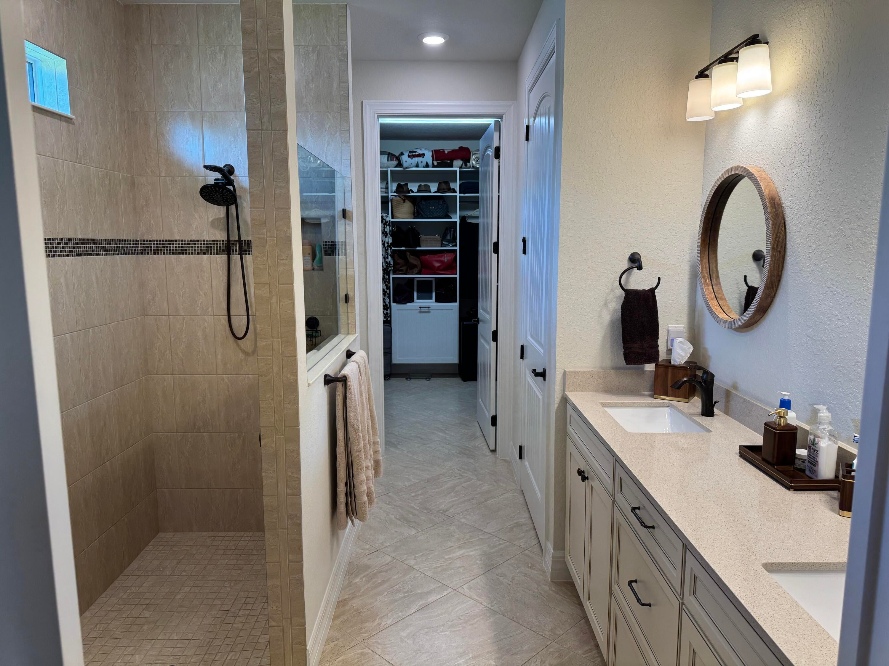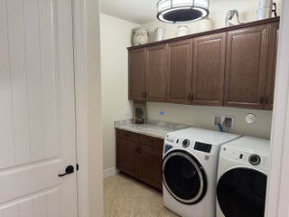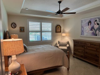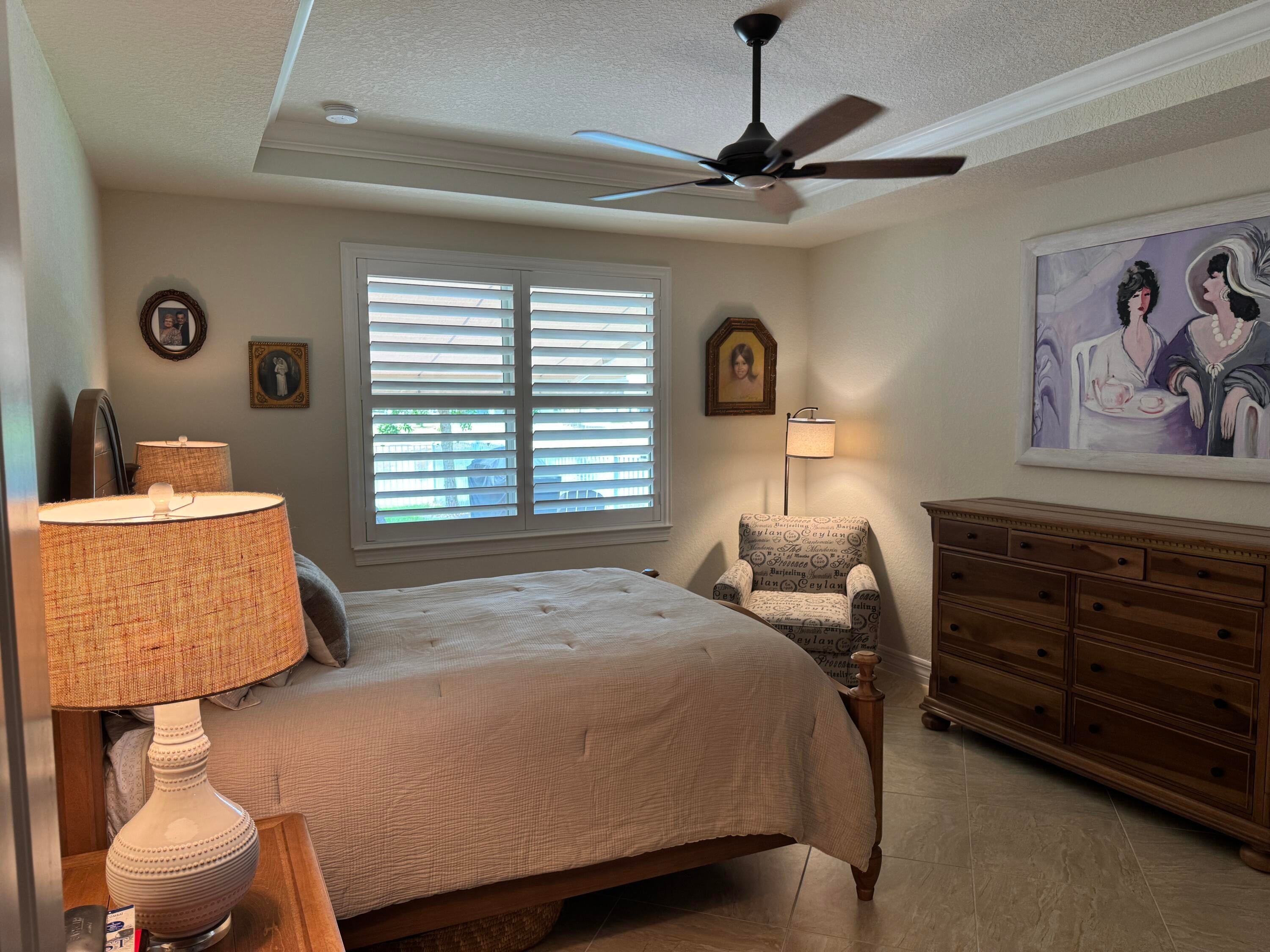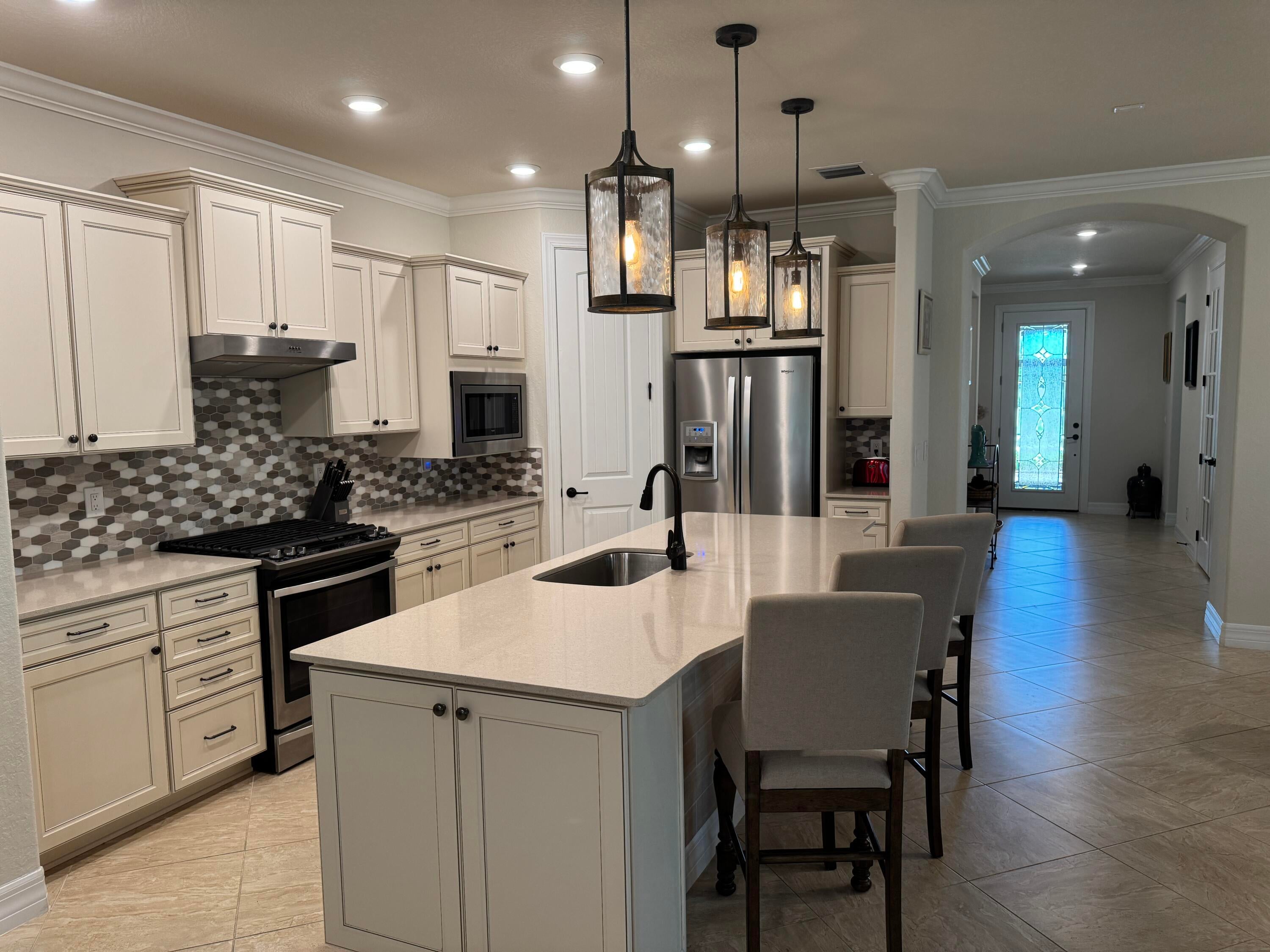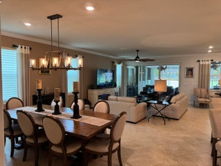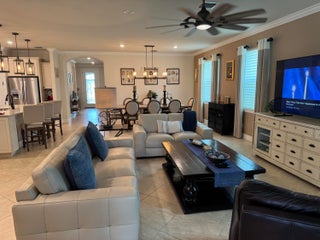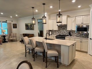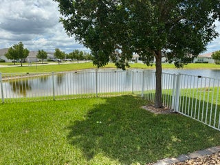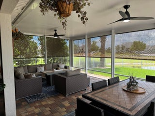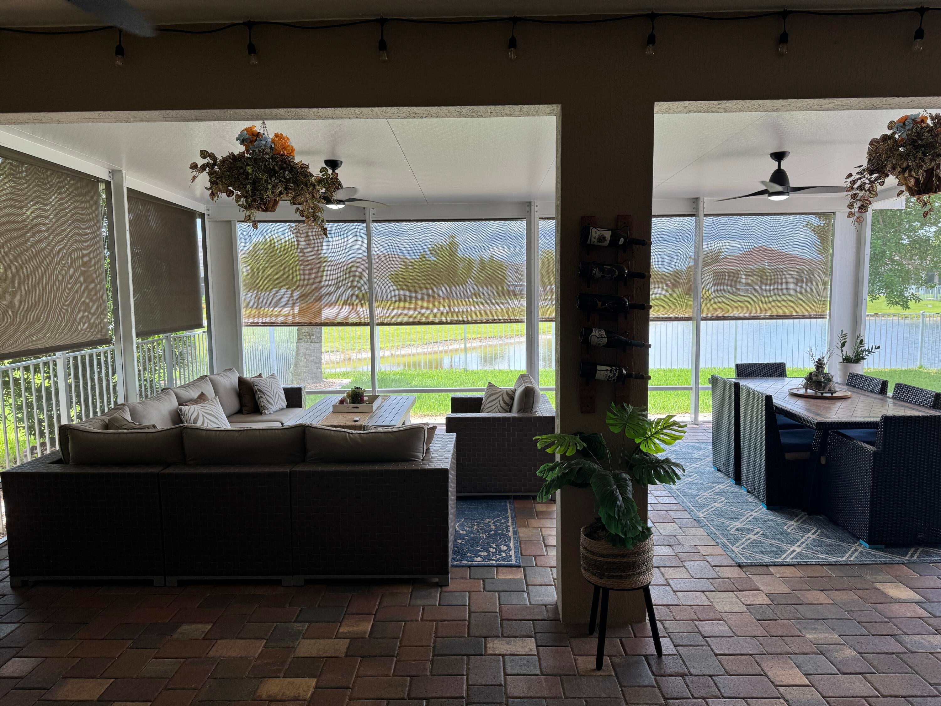 Luxurious 2/2/2 + flex room lakefront home with over 150k in upgrades. This open floor plan home features tile floors throughout. Crown molding, plantation shutters & 8' doors. Gourmet kitchen featuring quartz counters, tiled back splash, walk in pantry, 42'' cabinets & gas cooking. You truly have indoor outdoor living here with the beautiful lake view from your extended covered & screened in lanai with ceiling fans. There is an additional open area paved patio that has a retractable shade to enjoy this space. The home has a doggie dog leading to a fenced in yard for your fur babies to enjoy. Impact windows, tankless water heater & whole house generator. Amenities incl. 2 pools, 2 clubhouses, gym, pickleball, tennis, bocce & more!