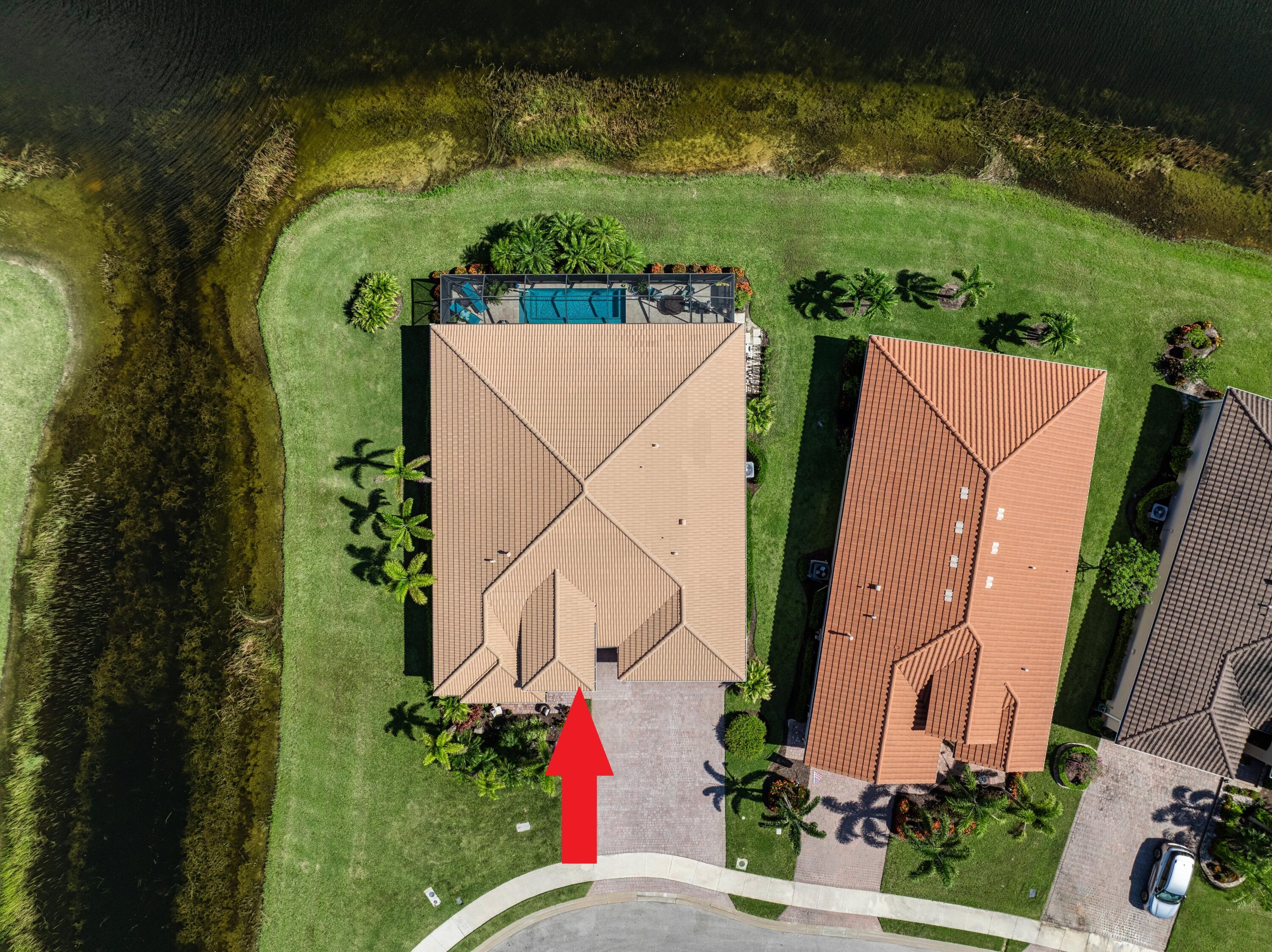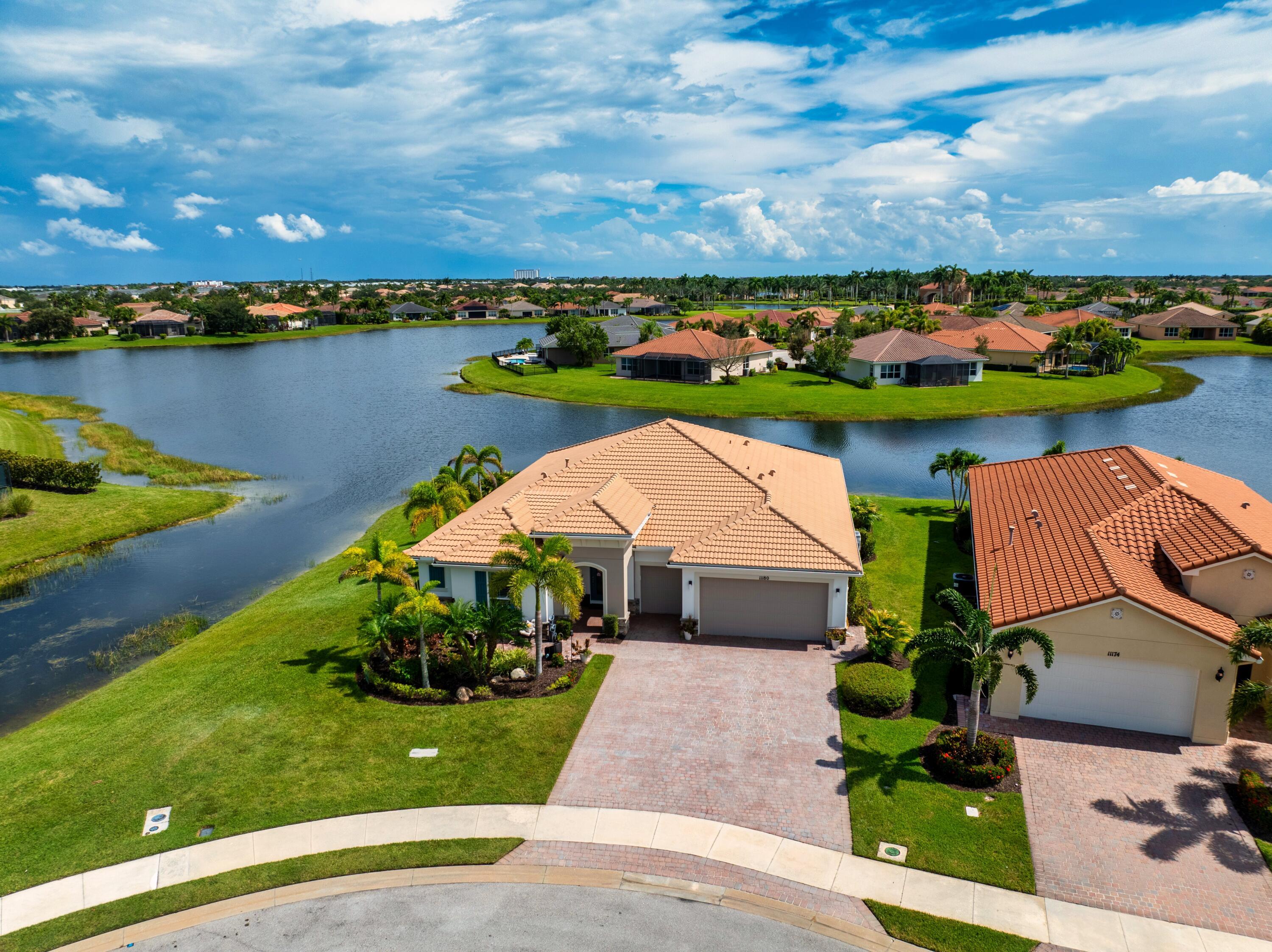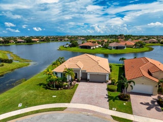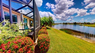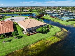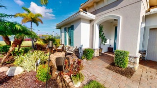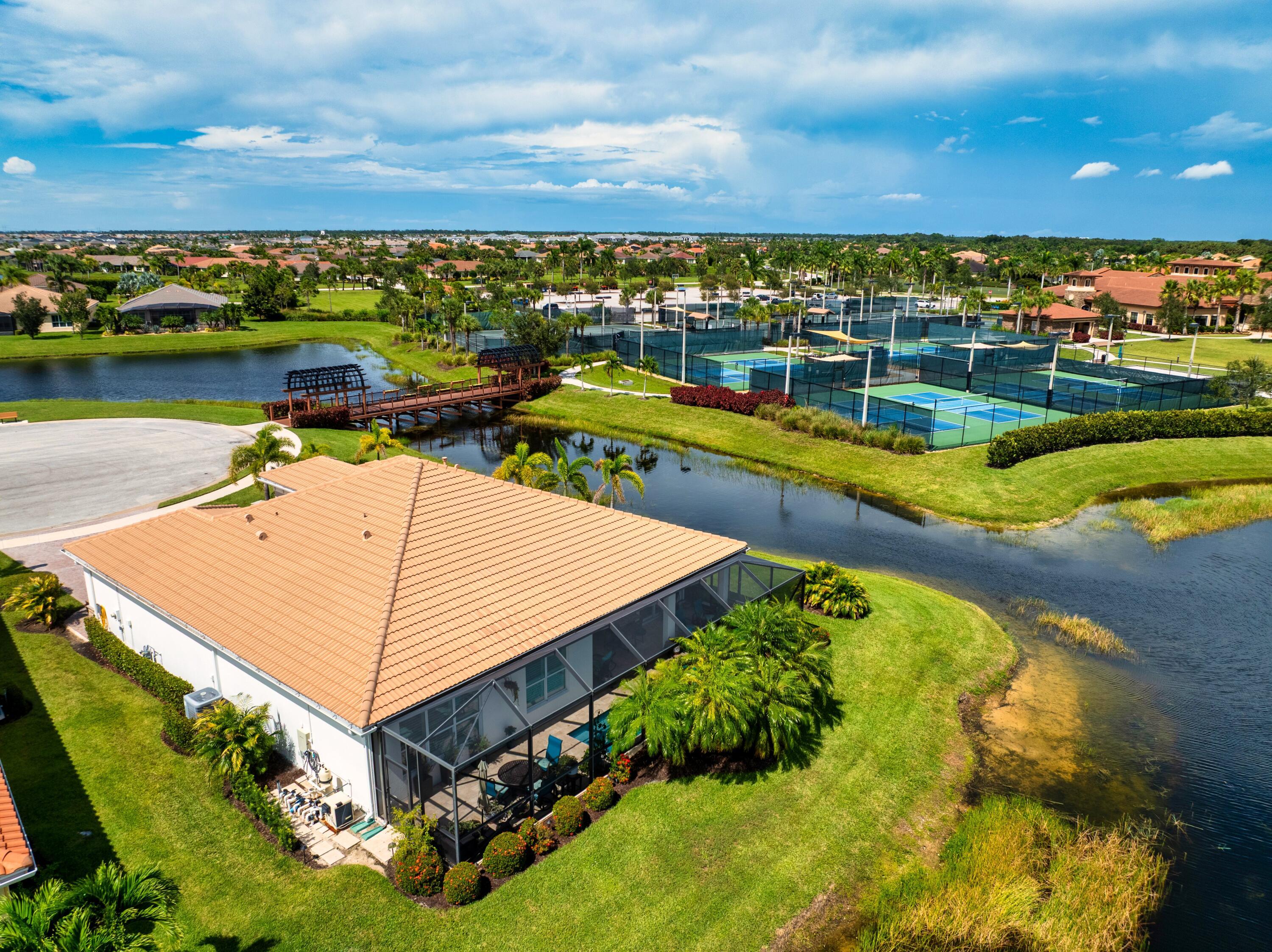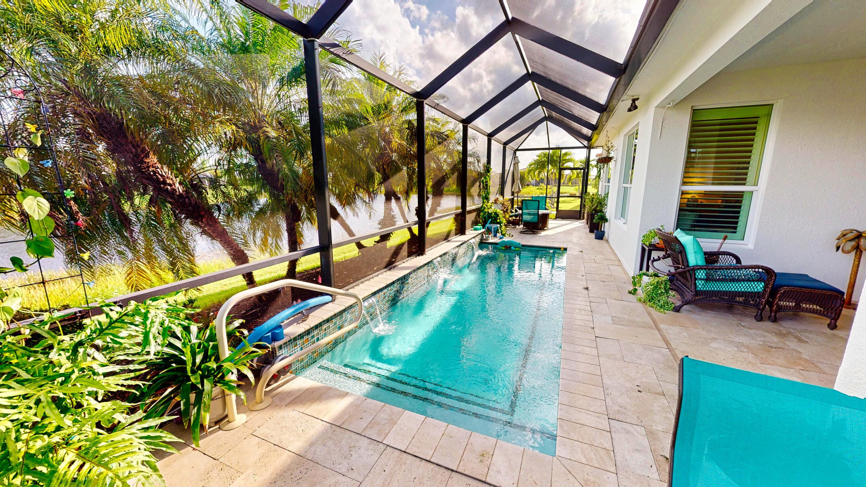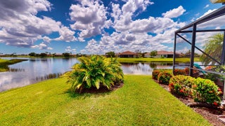 This stunning upgraded 3-bedroom, 2.5-bath home with office is set on a prime quiet cul-de-sac lot, offering over 2,400 sqft of beautifully living space. Throughout the home, you'll find crown molding, tray ceilings, upgraded lighting & fans plus built-in speakers in both the living room and lanai. The GARAGE is a standout with a 4-foot extension, golf cart garage, premium NewAge 24'' deep steel cabinets, shelving, HyLoft storage racks, & a floored attic with a elec pulley for safe access. Recent updates: new AC, dishwasher, & hot water heater, for long term use. Two guest bedrooms share a full bath, while a stylish half bath is perfect for guests. Enjoy open 180 lake views from your 24x54' travertine lanai complete with a 7x20.5' heated fountain saltwater POOL, gas firepit & BBQ. w bWelcoming guests on a FRONT PAVED PATIO the home features an oversized master suite with dual walk-in closets, sinks, and showers, providing a true retreat. The gourmet kitchen is a chef's dream with dual wall ovens, cooktop, built-in microwave, with an huge corner PANTRY and elegant finishes, opening to a dining area with double sliding doors that bring the outdoors in. Note: scheduled for repainting August 25th with approved Tuscan 7 color pallet. This homes was modified to maximize STORAGE. Within walking distance to a 28,000 sqft clubhouse, this home combines luxury, convenience, and resort-style living at its finest.