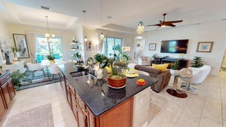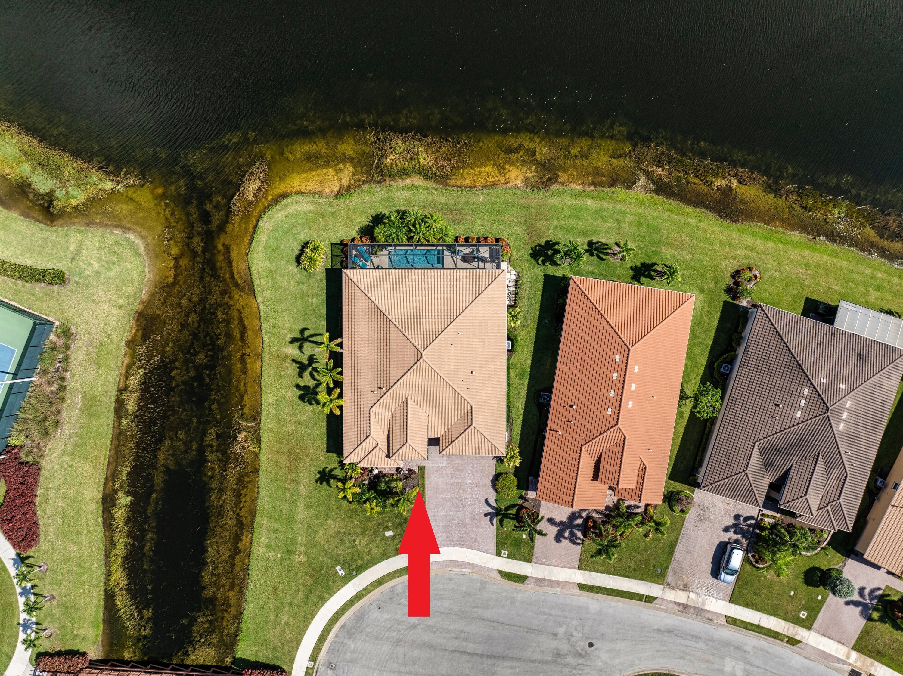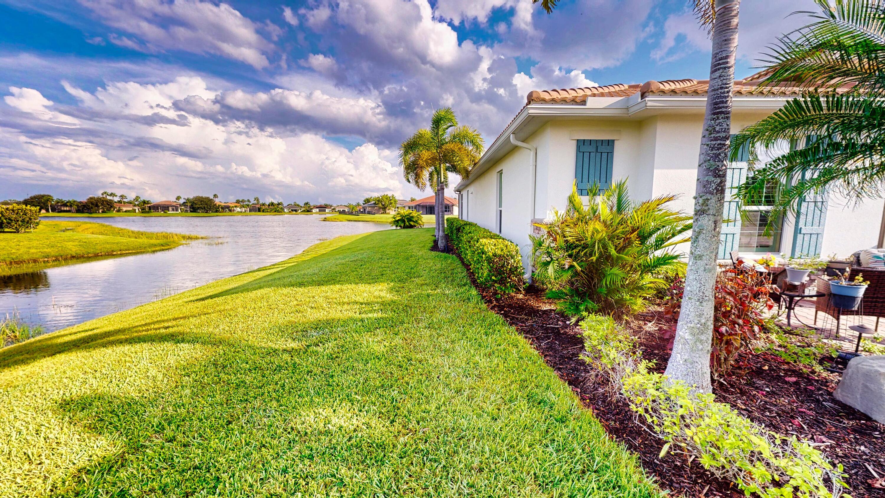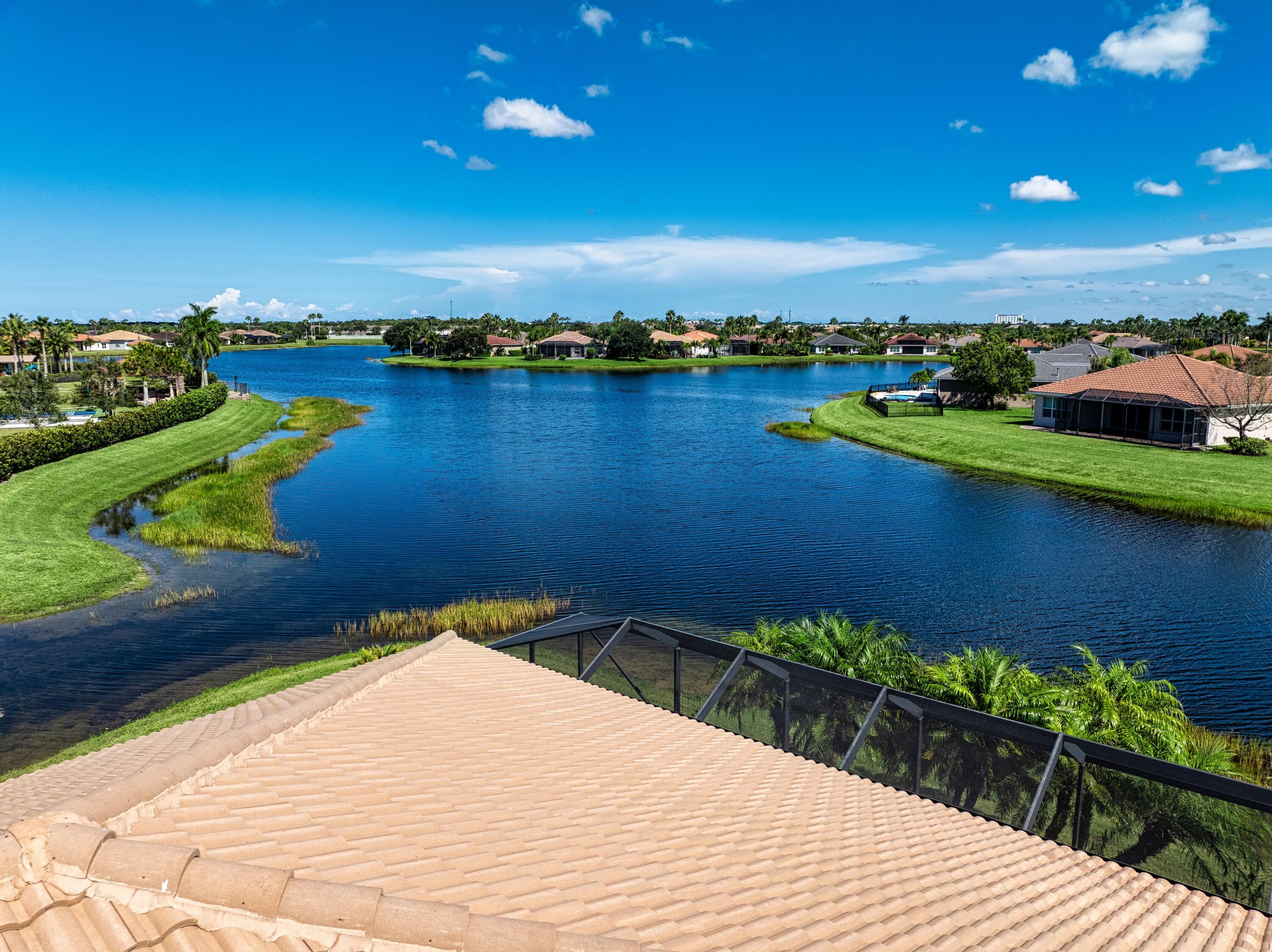 This stunning upgraded 3-bedroom, 2.5-bath home with office is set on a prime quiet cul-de-sac lot, offering over 2,400 sqft of beautifully living space. Throughout the home, you'll find crown molding, tray ceilings, upgraded lighting & fans plus built-in speakers in both the living room and lanai. The GARAGE is a standout with a 4-foot extension, golf cart garage, premium NewAge 24'' deep steel cabinets, shelving, HyLoft storage racks, & a floored attic with a elec pulley for safe access. Recent updates: new AC, dishwasher, & hot water heater, for long term use. Two guest bedrooms share a full bath, while a stylish half bath is perfect for guests. Enjoy open 180 lake views from your 24x54' travertine lanai complete with a 7x20.5' heated fountain saltwater POOL, gas firepit & BBQ. w bWelcoming guests on a FRONT PAVED PATIO the home features an oversized master suite with dual walk-in closets, sinks, and showers, providing a true retreat. The gourmet kitchen is a chef's dream with dual wall ovens, cooktop, built-in microwave, with an huge corner PANTRY and elegant finishes, opening to a dining area with double sliding doors that bring the outdoors in. Note: scheduled for repainting August 25th with approved Tuscan 7 color pallet. This homes was modified to maximize STORAGE. Within walking distance to a 28,000 sqft clubhouse, this home combines luxury, convenience, and resort-style living at its finest.