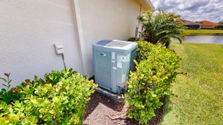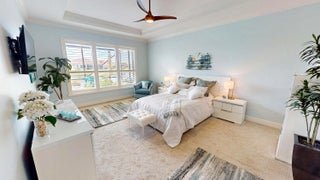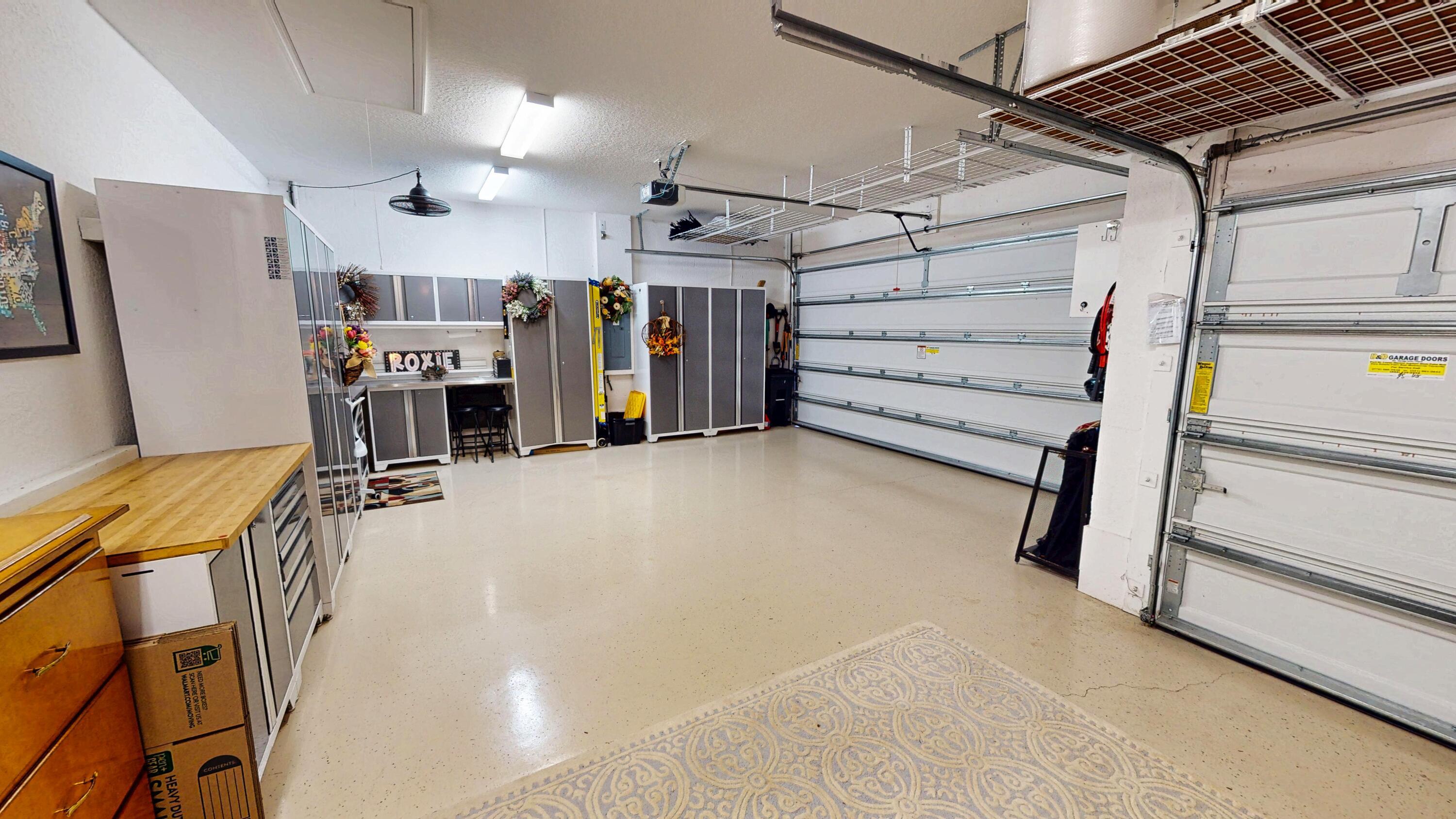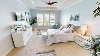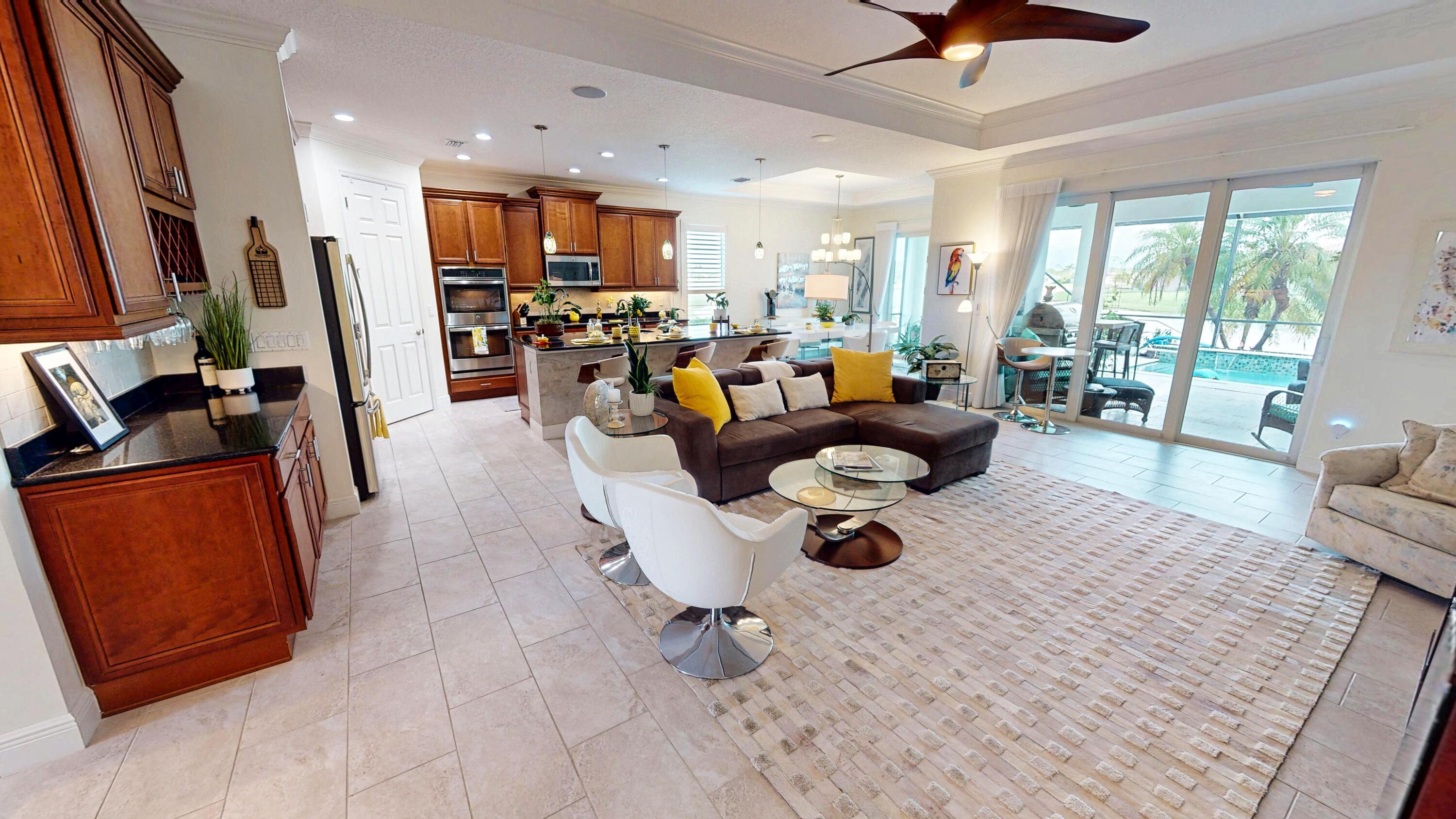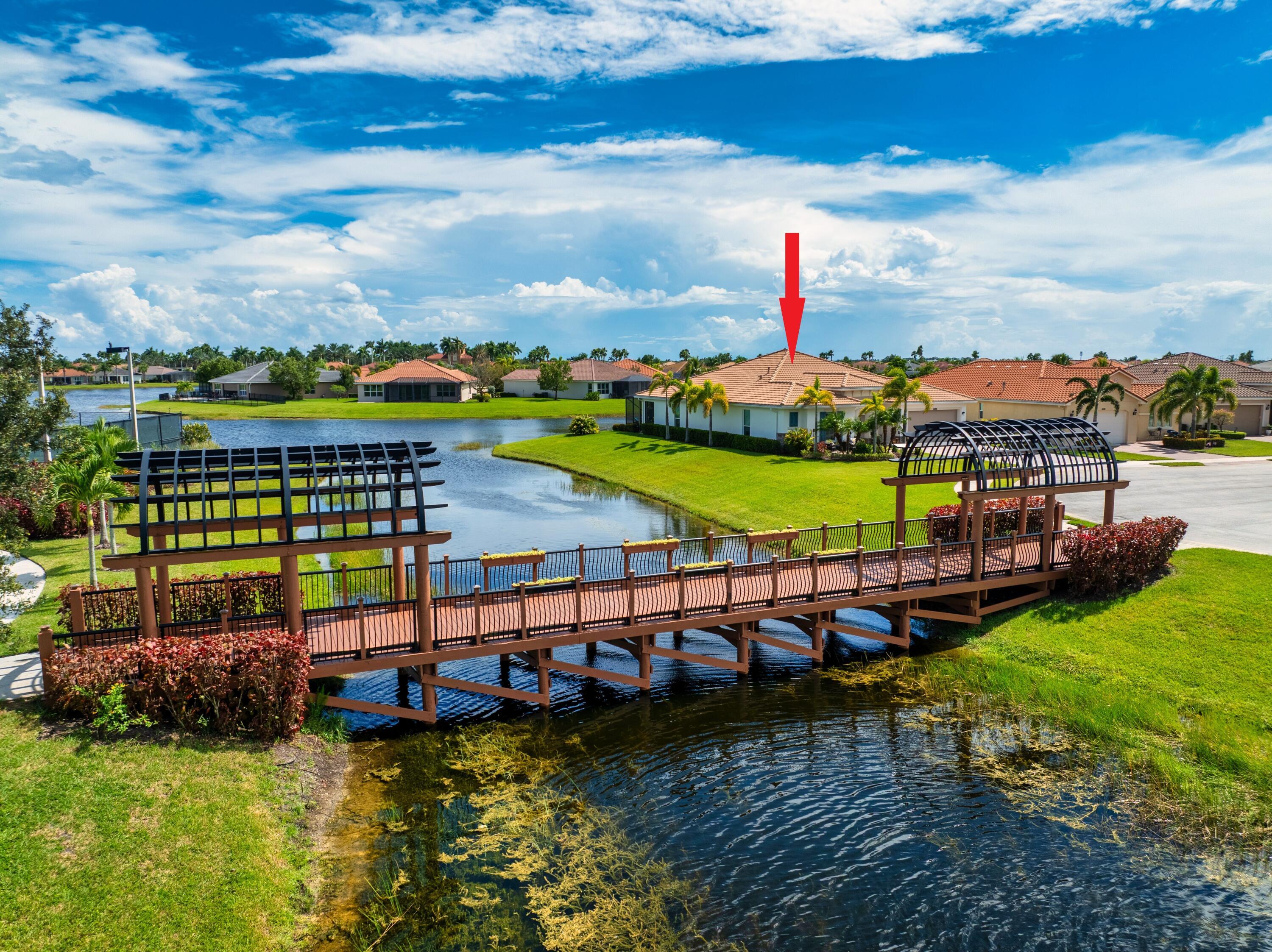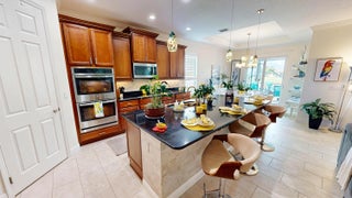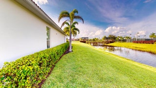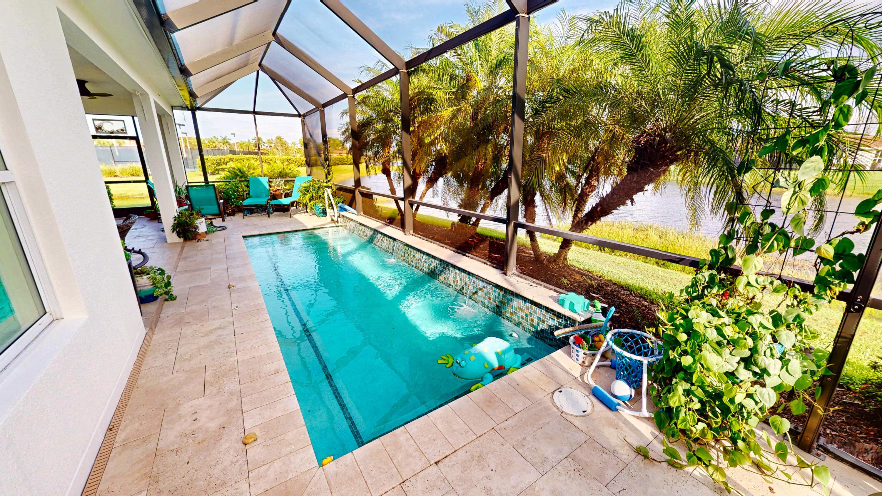 This stunning upgraded 3-bedroom, 2.5-bath home with office is set on a prime quiet cul-de-sac lot, offering over 2,400 sqft of beautifully living space. Throughout the home, you'll find crown molding, tray ceilings, upgraded lighting & fans plus built-in speakers in both the living room and lanai. The GARAGE is a standout with a 4-foot extension, golf cart garage, premium NewAge 24'' deep steel cabinets, shelving, HyLoft storage racks, & a floored attic with a elec pulley for safe access. Recent updates: new AC, dishwasher, & hot water heater, for long term use. Two guest bedrooms share a full bath, while a stylish half bath is perfect for guests. Enjoy open 180 lake views from your 24x54' travertine lanai complete with a 7x20.5' heated fountain saltwater POOL, gas firepit & BBQ. w bWelcoming guests on a FRONT PAVED PATIO the home features an oversized master suite with dual walk-in closets, sinks, and showers, providing a true retreat. The gourmet kitchen is a chef's dream with dual wall ovens, cooktop, built-in microwave, with an huge corner PANTRY and elegant finishes, opening to a dining area with double sliding doors that bring the outdoors in. Note: scheduled for repainting August 25th with approved Tuscan 7 color pallet. This homes was modified to maximize STORAGE. Within walking distance to a 28,000 sqft clubhouse, this home combines luxury, convenience, and resort-style living at its finest.