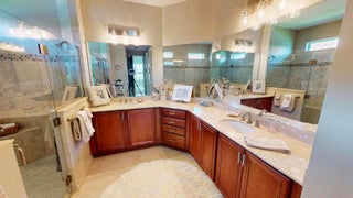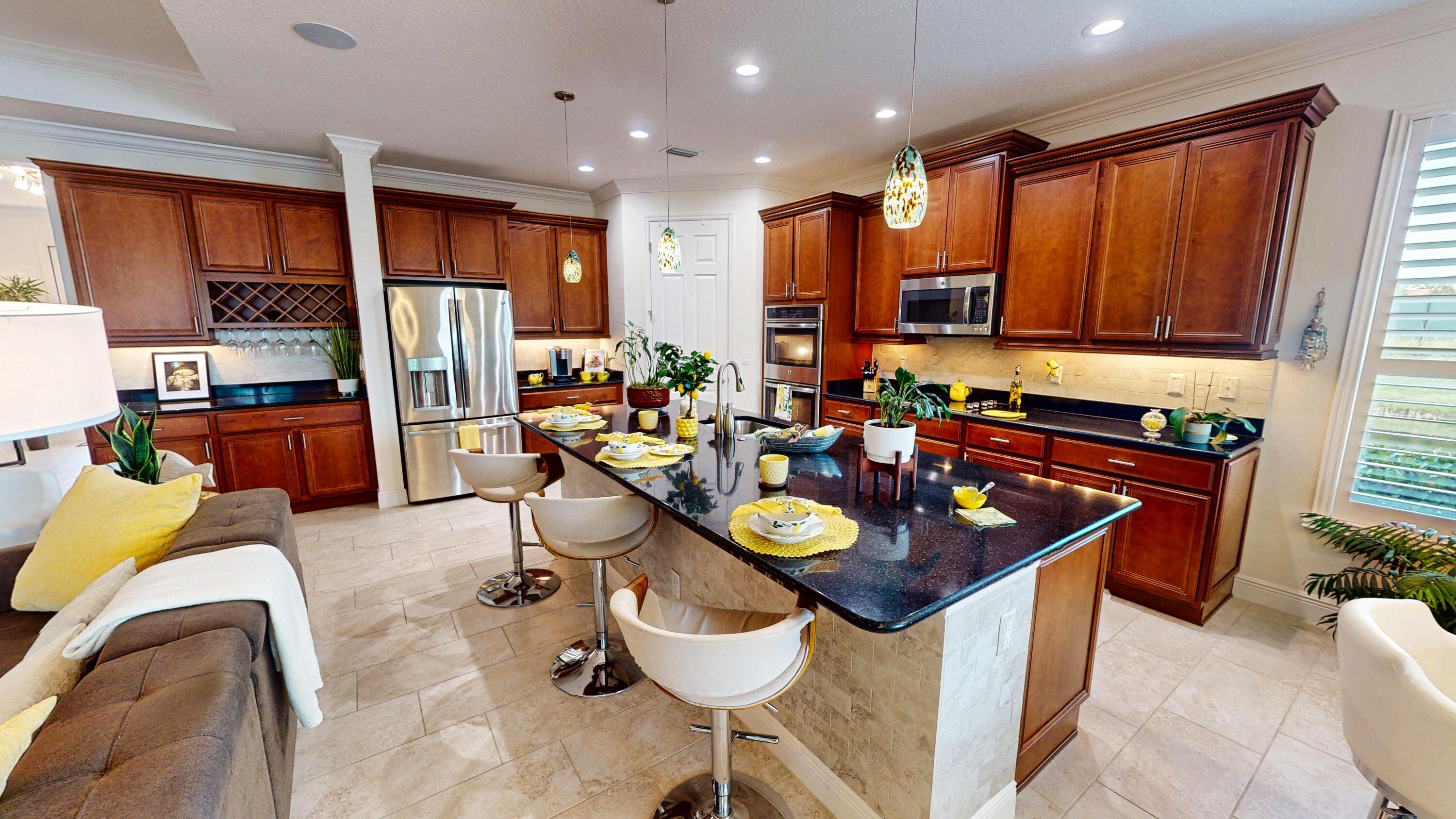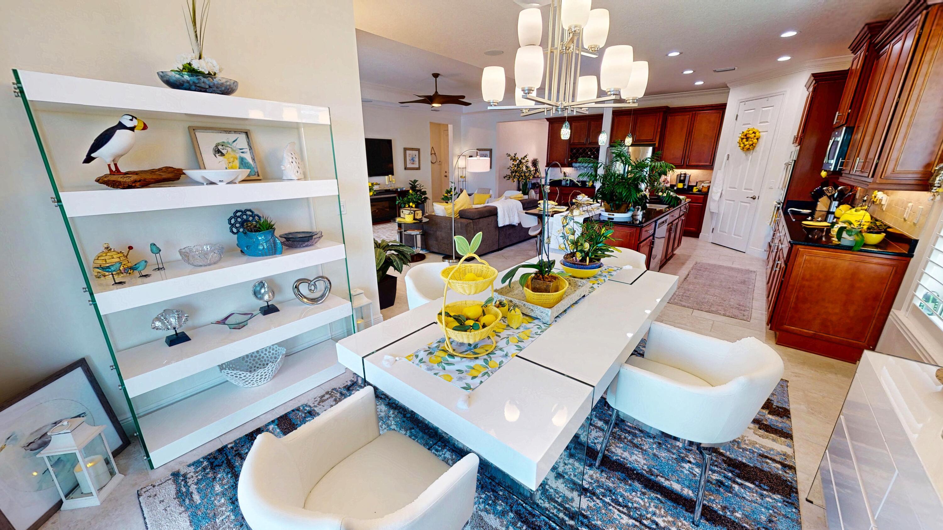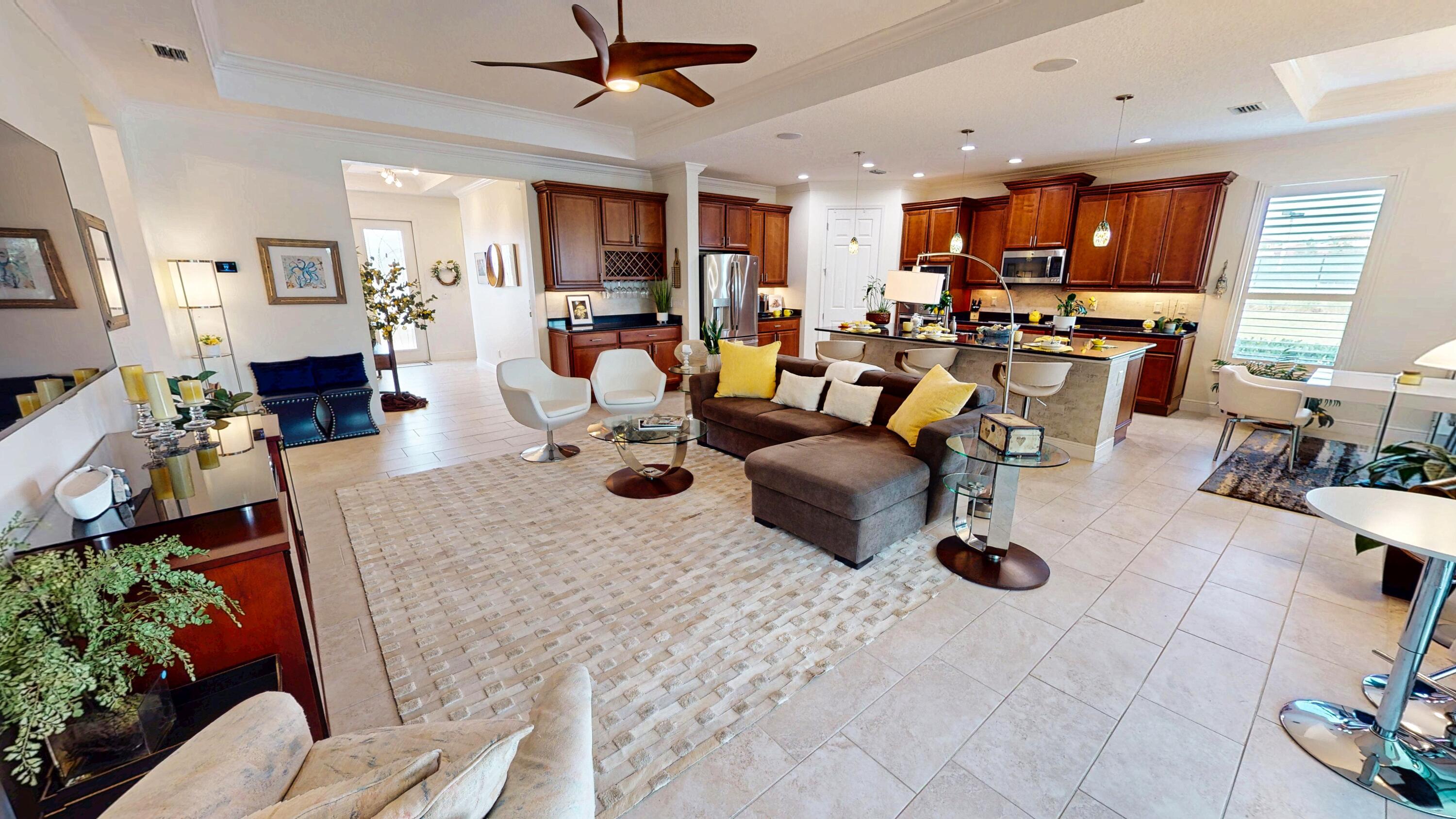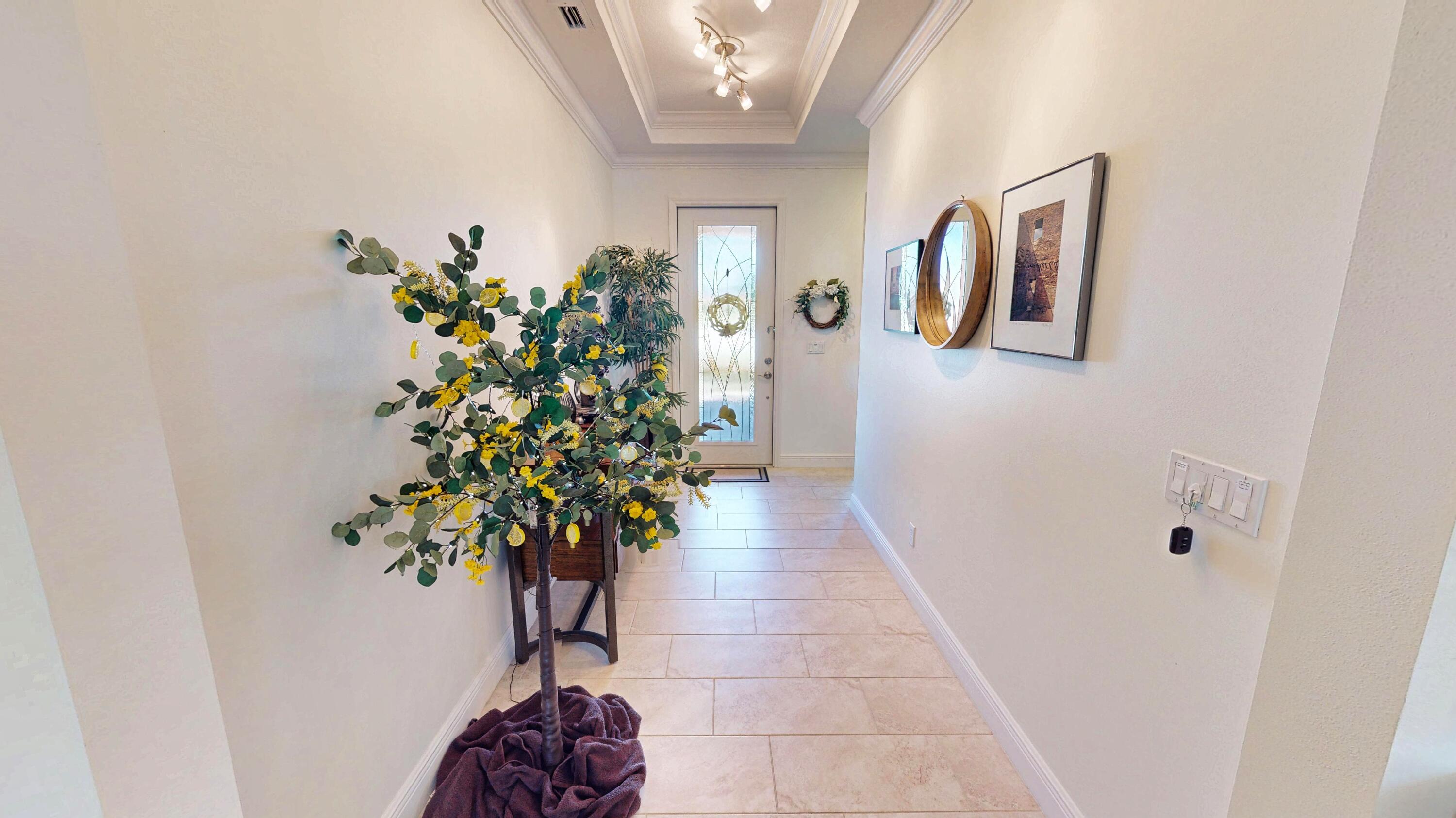 This stunning upgraded 3-bedroom, 2.5-bath home with office is set on a prime quiet cul-de-sac lot, offering over 2,400 sqft of beautifully living space. Throughout the home, you'll find crown molding, tray ceilings, upgraded lighting & fans plus built-in speakers in both the living room and lanai. The GARAGE is a standout with a 4-foot extension, golf cart garage, premium NewAge 24'' deep steel cabinets, shelving, HyLoft storage racks, & a floored attic with a elec pulley for safe access. Recent updates: new AC, dishwasher, & hot water heater, for long term use. Two guest bedrooms share a full bath, while a stylish half bath is perfect for guests. Enjoy open 180 lake views from your 24x54' travertine lanai complete with a 7x20.5' heated fountain saltwater POOL, gas firepit & BBQ. w bWelcoming guests on a FRONT PAVED PATIO the home features an oversized master suite with dual walk-in closets, sinks, and showers, providing a true retreat. The gourmet kitchen is a chef's dream with dual wall ovens, cooktop, built-in microwave, with an huge corner PANTRY and elegant finishes, opening to a dining area with double sliding doors that bring the outdoors in. Note: scheduled for repainting August 25th with approved Tuscan 7 color pallet. This homes was modified to maximize STORAGE. Within walking distance to a 28,000 sqft clubhouse, this home combines luxury, convenience, and resort-style living at its finest.