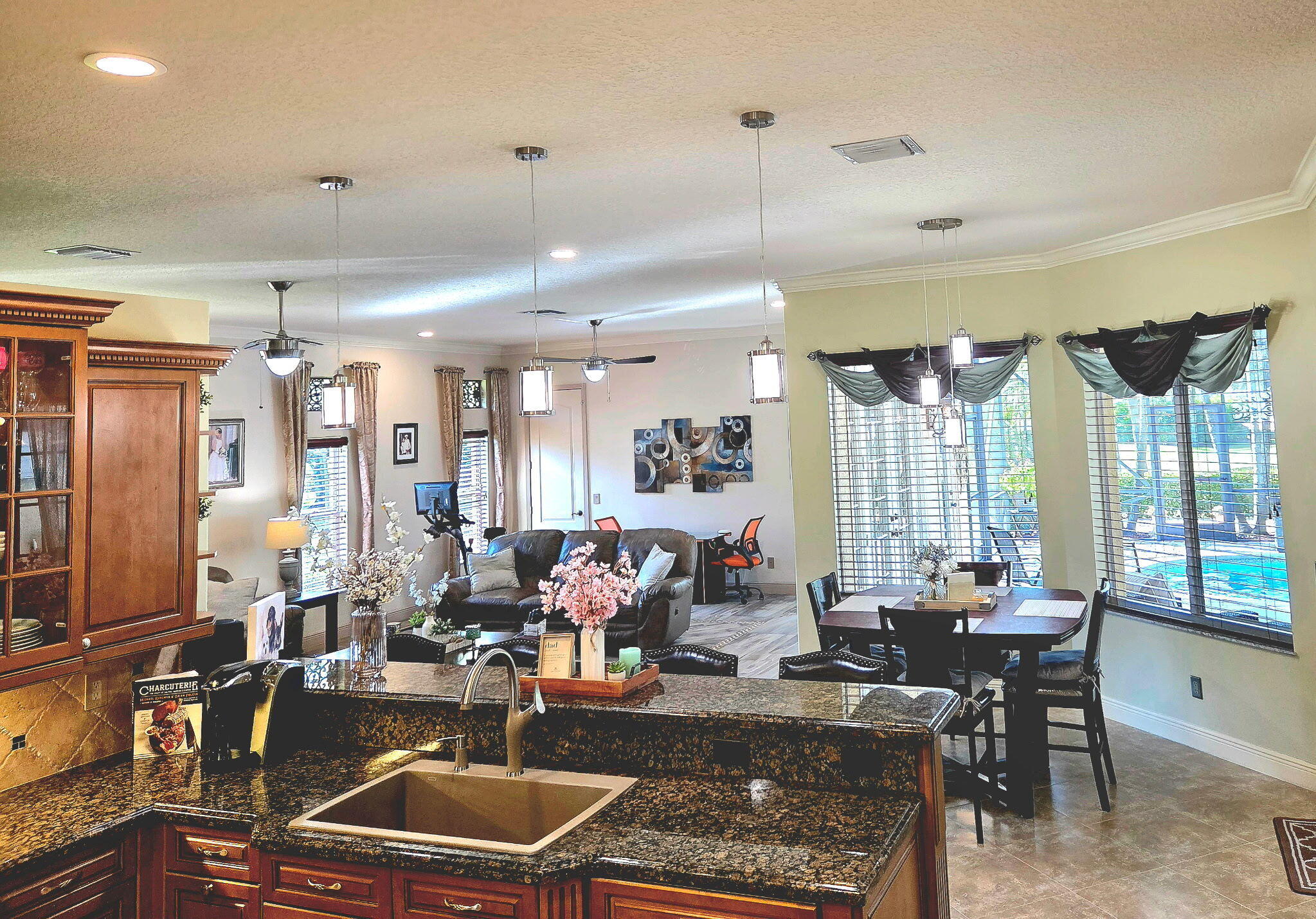 A Tuscan style CBS TURNKEY home featuring 3 beds, 3 bath,+ den, spanning 2639 sqft, complete with a 3 car garage, & situated on .62 acres. The backyard oasis is perfect for entertaining, featuring a stunning saltwater pool, serene waterfall, sundeck, covered patio,& lake views.The chef's kitchen is a dream with 42-inch cabinets, granite countertops, large center island,& new appliances.Upgrades include newer A/C, new HW heater, epoxy garage floors w/ shelving, extended paver driveway/walkway, remote irrigation & landscape lighting. All in the highly desirable Orchid Bay of Palm City. Amenities include tennis, pickleball, basketball, playground, & volleyball court. Close to A+ schools, dining, shopping, beaches, 95/turnpike This home truly combines elegance, functionality, & comfort.Step inside custom wood front doors into an elegant interior showcasing soaring 10 and 12 foot ceilings, exquisite crown molding throughout, and extensive attention to detail. The expansive primary suite, privately located in its own wing of the home, features a spa-like bathroom with a double-sink vanity, double shower, and a walk-in closet with custom shelving. The generously sized additional bedrooms share a beautifully appointed second bath, while the large den provides an ideal space for a home office or an easy conversion to a 4th bedroom. Additional outdoor features include a screened patio with plumbing ready for a future summer kitchen, extended sun patio, city water, Miami Dade approved fabric window coverings, & hurricane shutters for peace of mind.list of upgrades and features please see documents section of MLS.This Home has had a recent 4 point inspection report done with outstanding results.