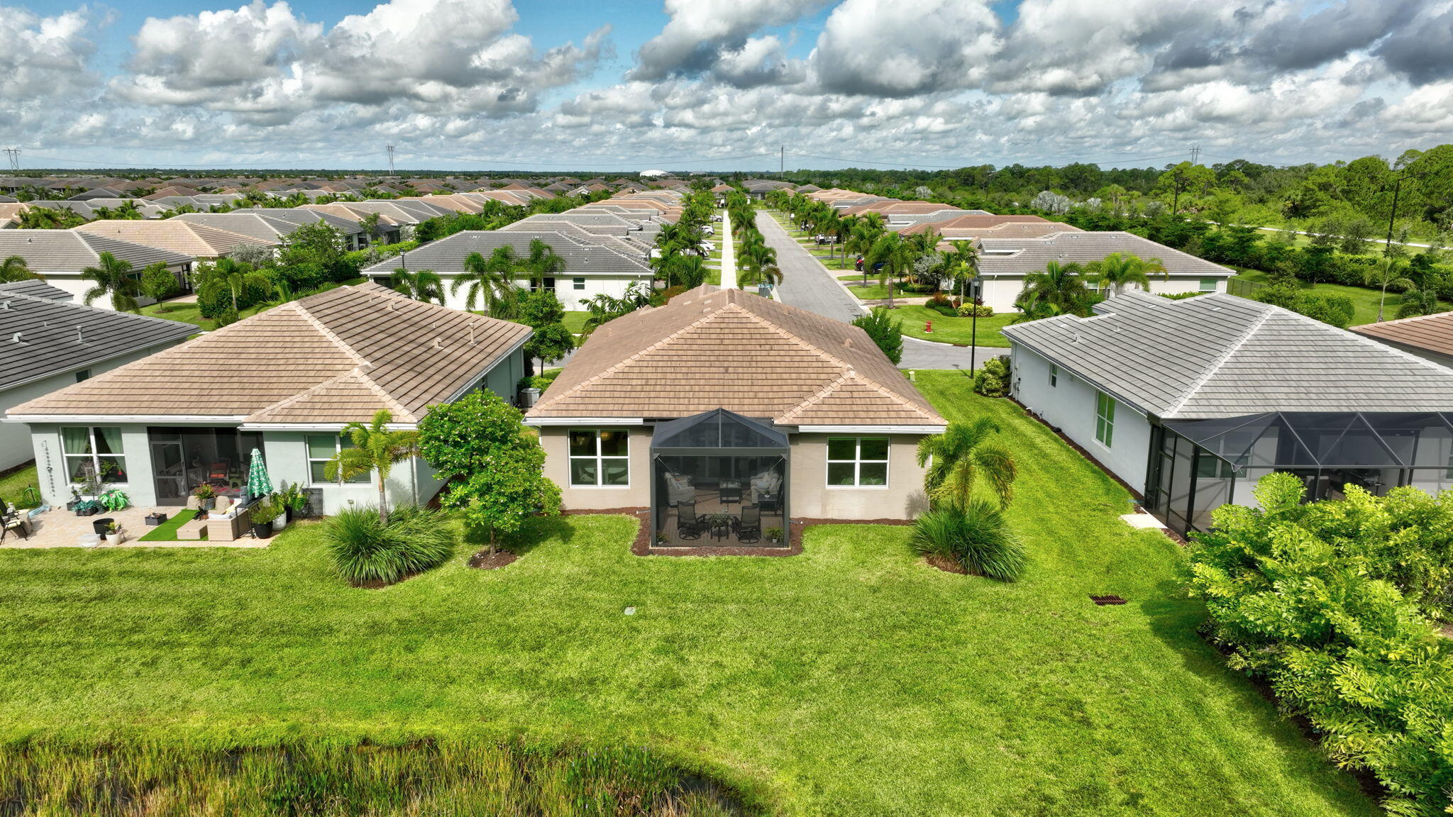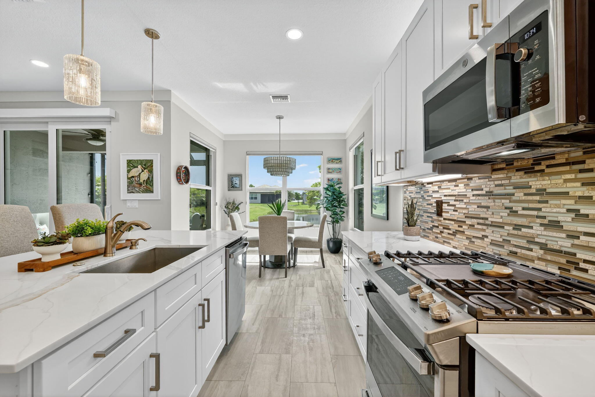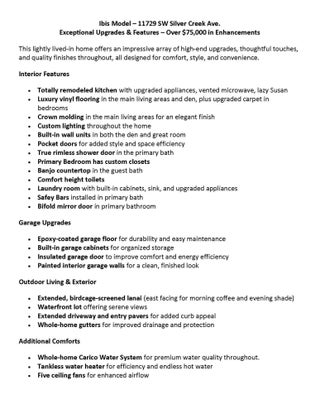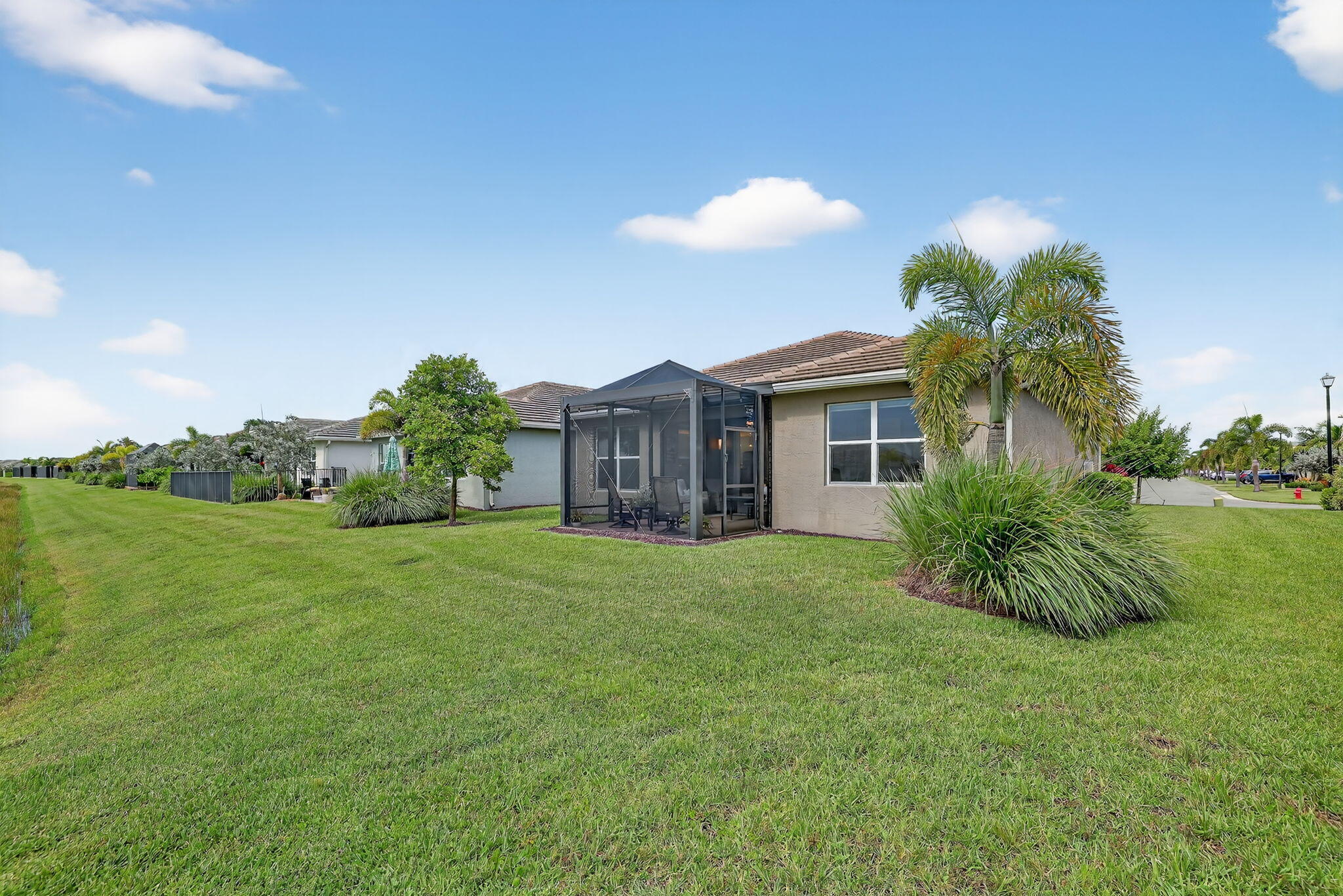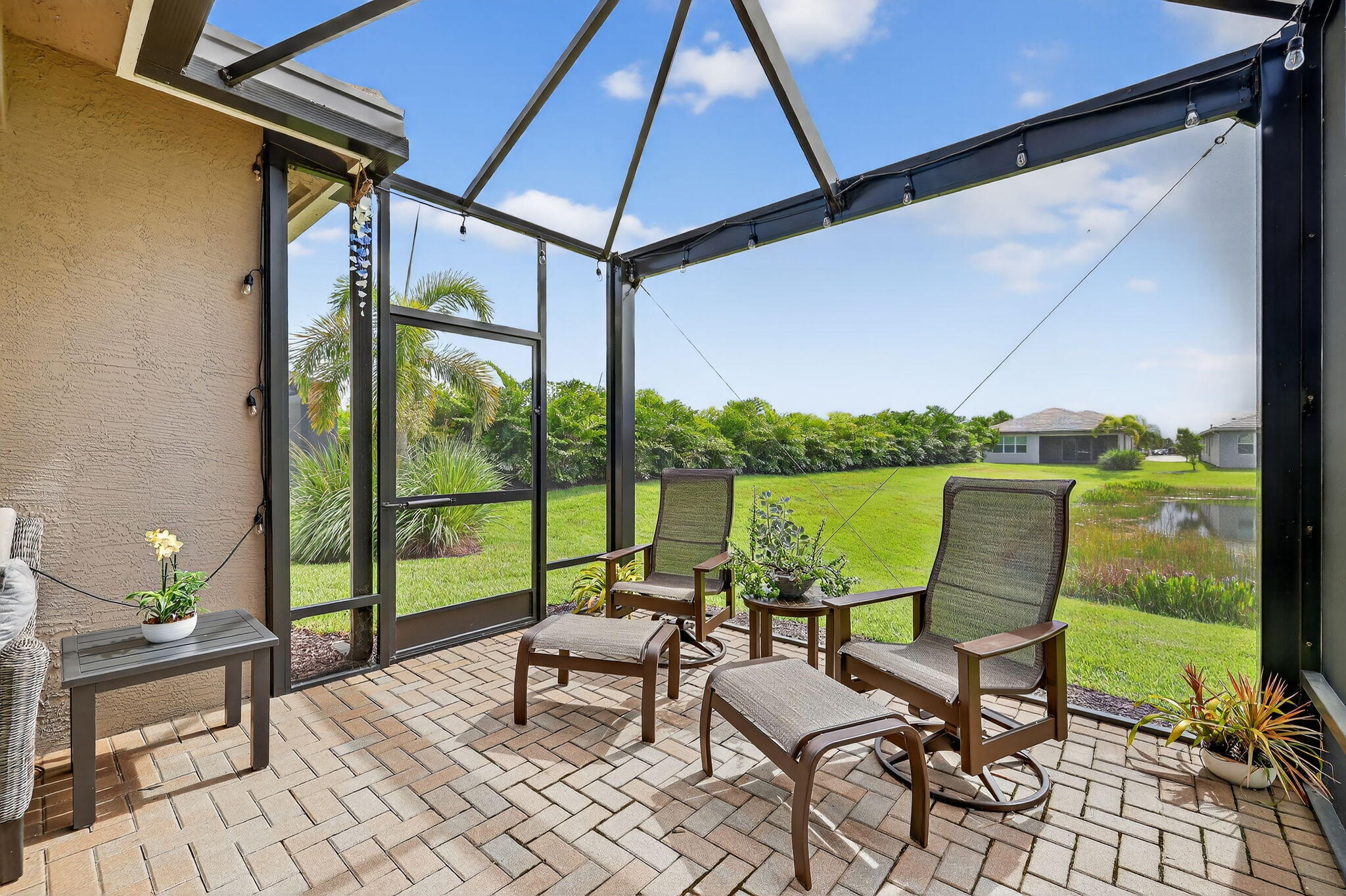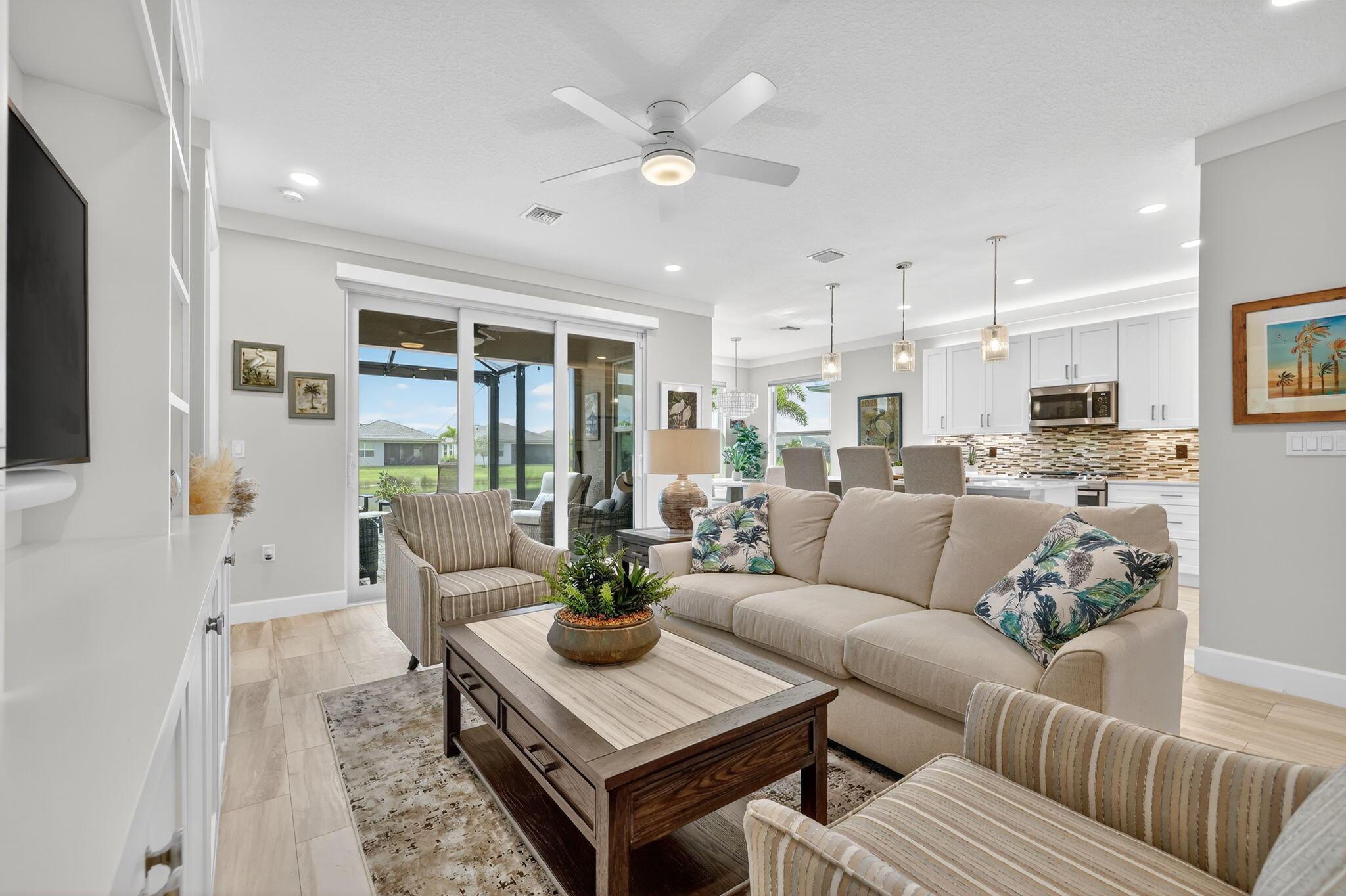 Beautifully Upgraded Ibis Model - Waterfront - $75K+ in EnhancementsDiscover this stunning Ibis model with 2 bedrooms plus den (or 3rd bedroom) and 1,599 SF under air in GL Homes' highly desirable 55+ community of Valencia Grove at Riverland. Lightly lived in and loaded with over $75,000 in thoughtful upgrades, this home offers the perfect blend of modern elegance, comfort, and functionality.The totally remodeled kitchen features upgraded appliances, a vented microwave, and a lazy Susan, while luxury vinyl flooring flows through the main living areas and den, complemented by upgraded carpet in the bedrooms. Enjoy custom lighting, crown molding in the main living areas, built-in wall units in the great room and den, and pocket doors for added style. The primary suite boasts a truerimless shower door, and the guest bath includes a stylish banjo countertop. The laundry room offers upgraded appliances, cabinets, and a sink. The garage impresses with an epoxy-coated floor, built-in cabinets, insulated door, and painted walls. A whole-home Carico Water System ensures premium water quality throughout. Outdoor living shines with an extended, birdcage-screened lanai that is east facingperfect for peaceful morning coffee and relaxing in the shade each eveningwhile overlooking a serene waterfront lot. Additional upgrades include widened driveway and entry pavers, whole-home gutters, five ceiling fans, and a tankless water heater. Ideally located near Tradition's shopping and dining, Cleveland Clinic Hospital, and Mets spring training, this home offers a beautifully upgraded lifestyle in a vibrant, amenity-rich community.