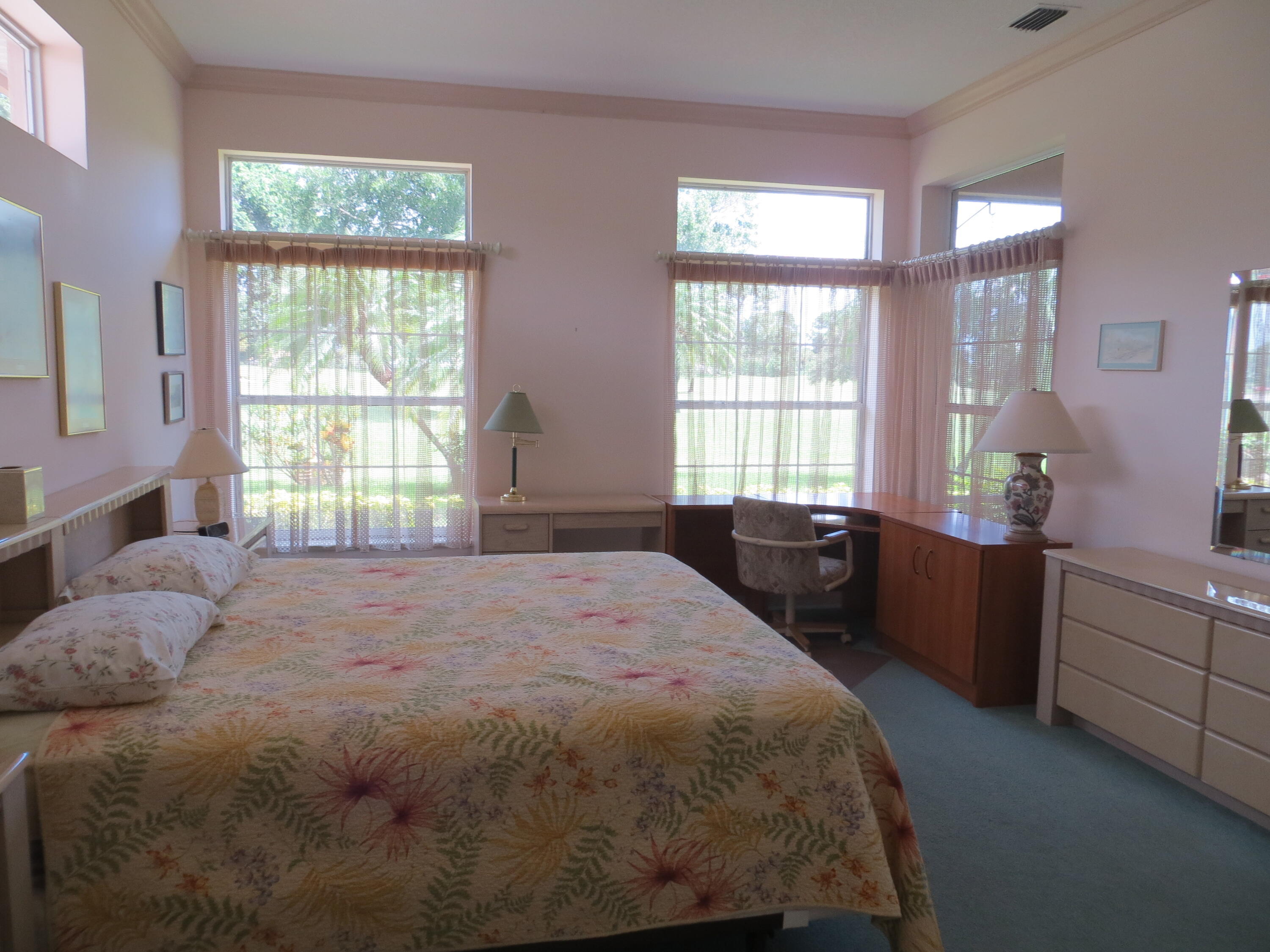 Gorgeous Meadowood Golf Community! On the golf course. Expanded floor plan with high ceilings, clerestory windows and incredible golf course views. Have you been dreaming about relocating to sunny Florida? This home feels super spacious with an open floor plan and tons of natural light. With a huge master bedroom with large ensuite bath, large closets in every bedroom and the most peaceful setting you could ever imagine, this could be the one. The kitchen opens to a lovely eat in area overlooking the golf course and even includes a pantry closet with loads of shelves for ample storage. Roof 2021, HVAC 2024. HOA provides excellent value with a manned security gate, cable, wifi and water included. The enormous, screened lanai provides plenty of space for grilling and outdoor enjoyment.