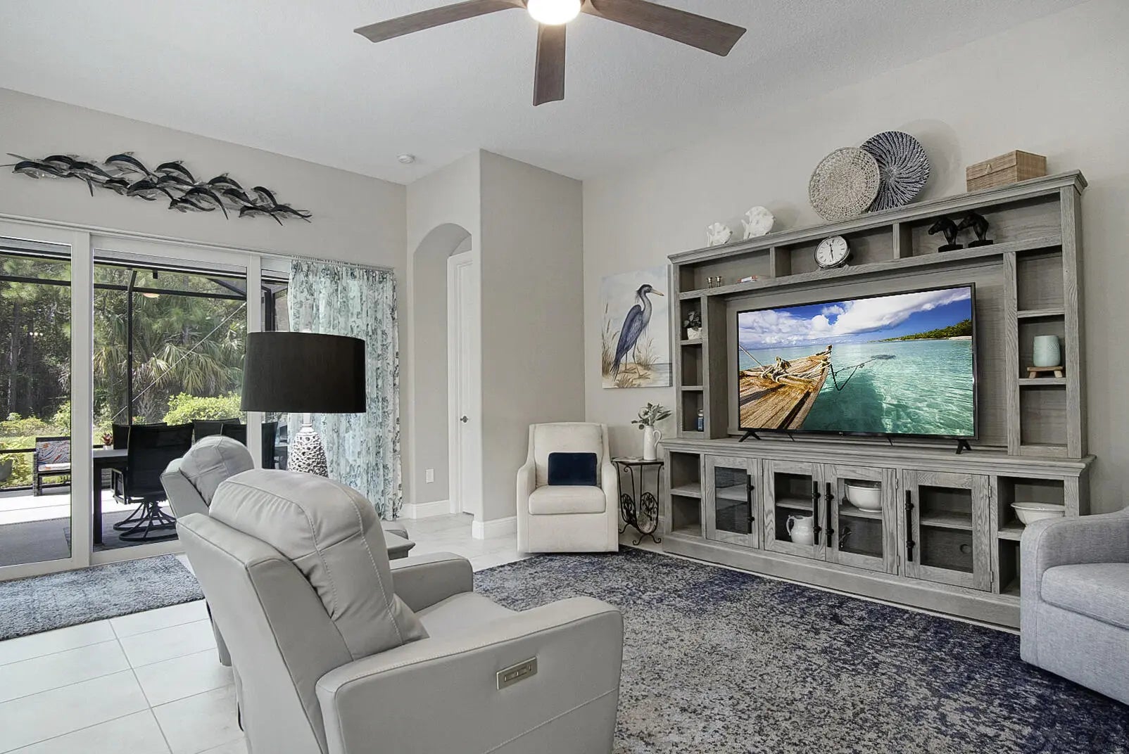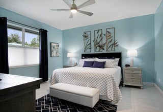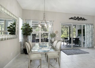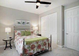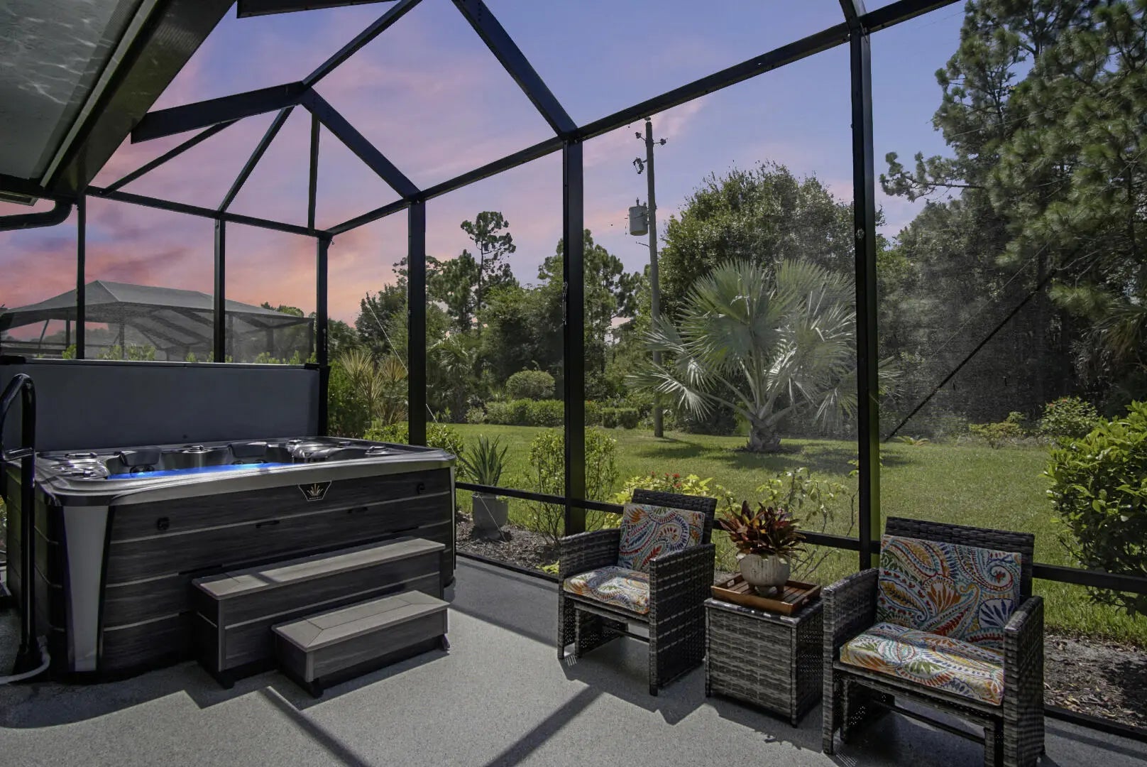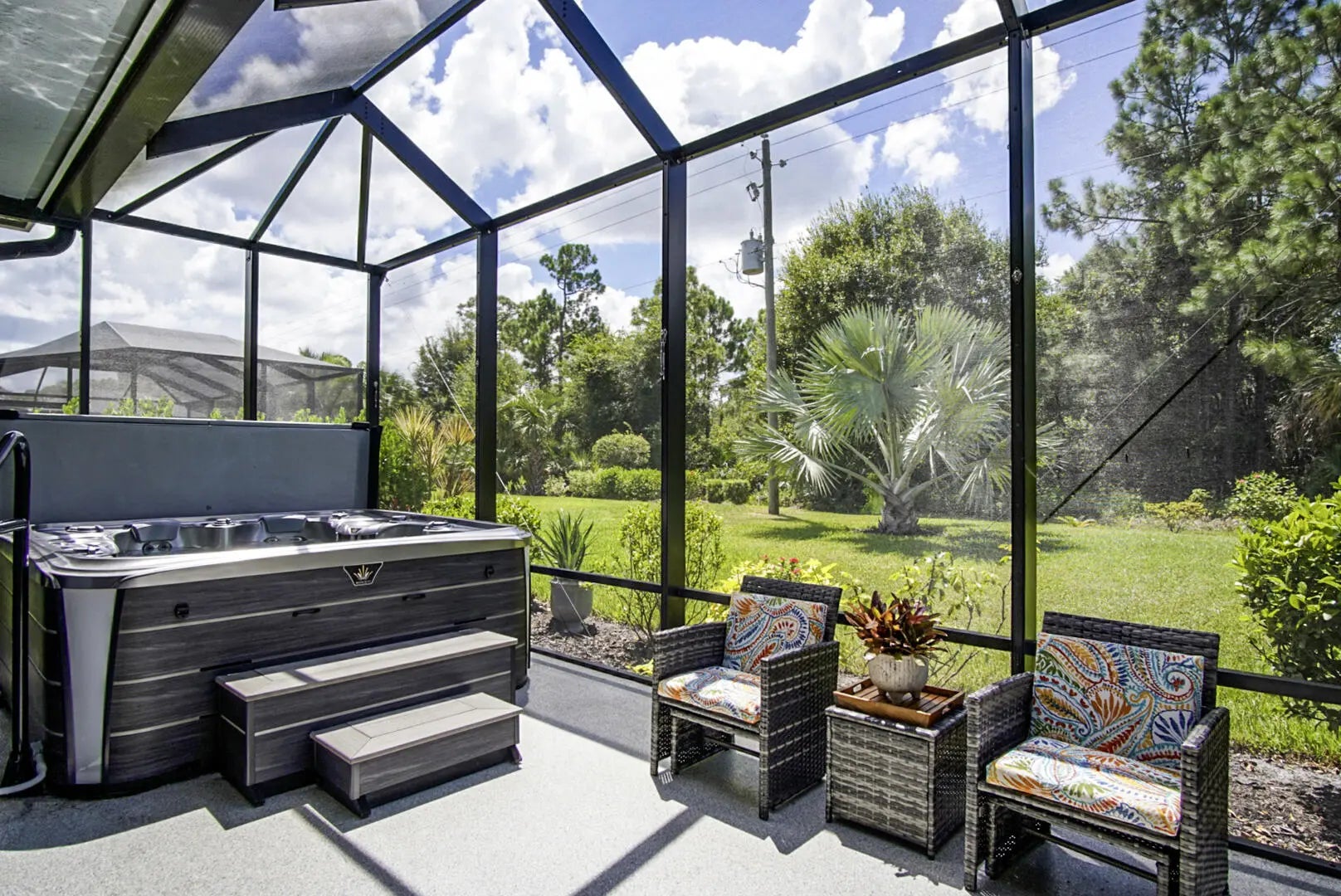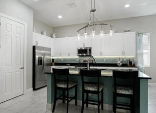 Beautifully appointed 2/2/2 home with a large den that can easily be converted into a 3rd bedroom. Pristine white kitchen cabinets, large island, granite countertops, tile backsplash and upgraded stainless steel appliances. Large welcoming master suite, two closets the walk-in closet has a California closet system. Large master bath has dual sinks, oversized shower and private toilet. Tile throughout the bright open floor plan's main living area. There is carpet in the guest bedroom and den. The living area leads out to a large extended screened Lani with a beautiful micro silk hot tub. There is an additional paved patio for enhanced outdoor living. Oversized 2 car garage with a golf cart door, epoxy floor and extra storage in the spray foam insulated attic. Feel safe with high impact