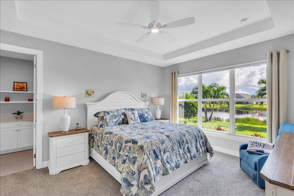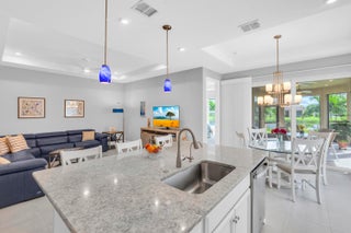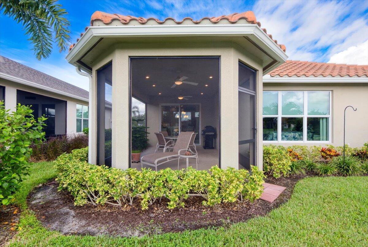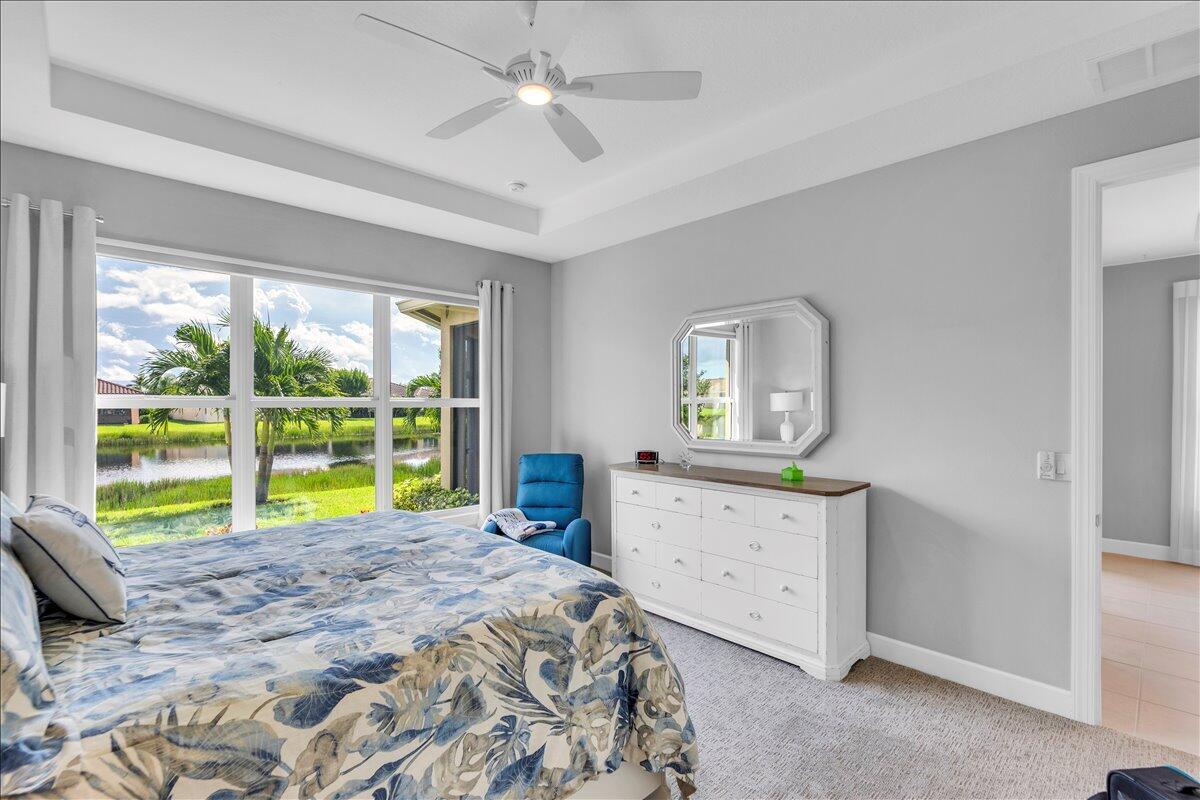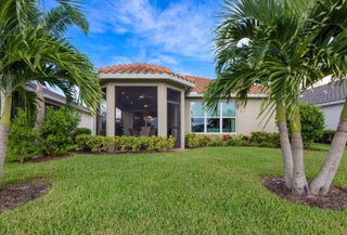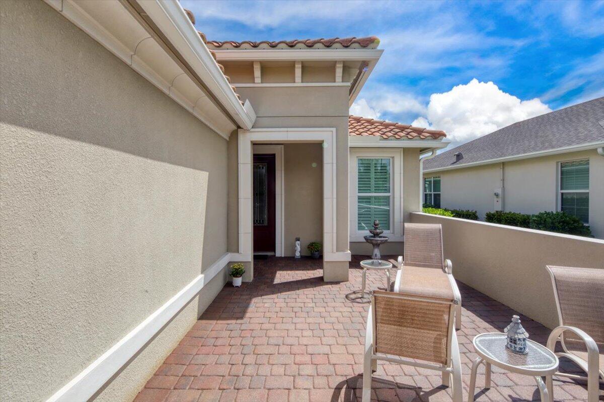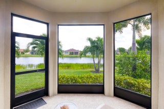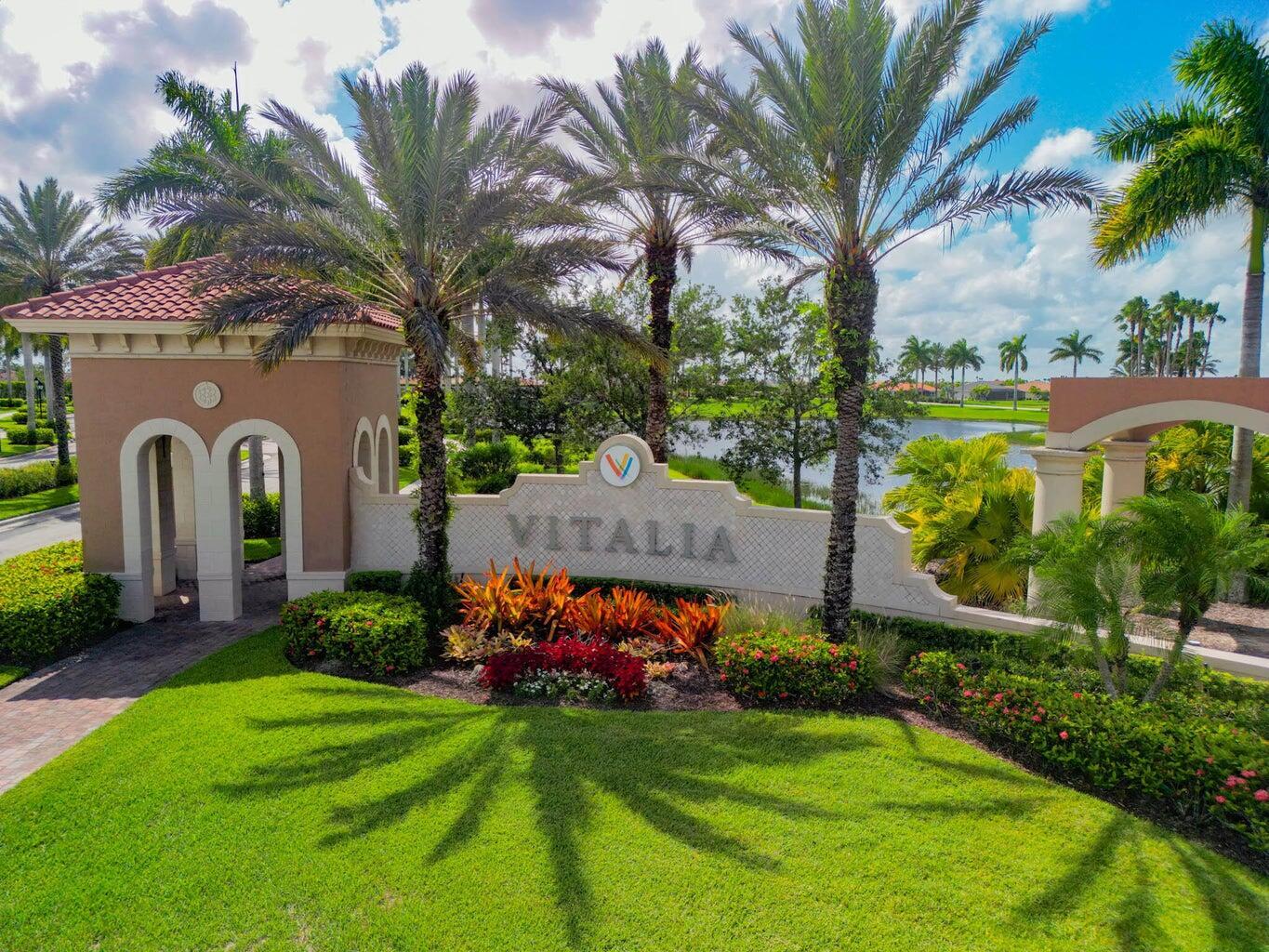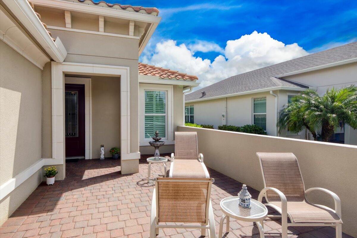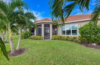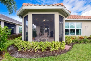 Nestled within the secure, gated community of Vitalia in Tradition, this exquisite CBS built 2-bedroom PLUS den offers a luxurious lifestyle. Offered fully furnished (or unfurnished) w/ high end furniture. Situated on a PREMIUM lakefront lot, enhanced with numerous upgrades, including IMPACT windows & doors, tile flooring in living areas and den, custom Hunter Douglas remote controlled window treatments, crown molding and a gorgeous custom master bedroom walk-in closet. The interior is bathed in natural light from the courtyard entry, beamingonto the professional neutral paint with many expanded windows throughout the home. The gourmet kitchen delights with a gas range, upgraded cabinets, large walk-in pantry, SS appliances, quartz countertops, a spacious island and under cabinet lightsRelax in the spacious master bedroom, featuring brand new carpet, a tray ceiling and a large window to enjoy your serene backyard lake views. Entertain on your expanded, covered and screened lanai overlooking the calming lake surrounded by tropical landscaping. One owner custom built home with numerous upgrades -24,000 sq ft luxury clubhouse- Captiva Club by Vitalia is state of the art with a resort style pool, gym, demo kitchen, pickleball courts, shuffleboard, tennis and monthly social events -The Vitalia lifestyle is a secure community with a 24/7 manned guard gate, very well maintained with minimal maintenance for each homeowner which includes lawn care and trimming included in your low HOA fee. Conveniently located in the heart of Tradition with just a bike ride or golf cart away from the Tradition square events, concerts, farmers market, food trucks, shops, restaurants and more. Five minutes to the Cleveland Clinic hospital and 35 minutes to the local beach. Come live the Traditon lifestyle where you can enjoy as much or as little as your heart desires.