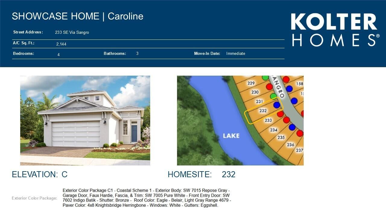 **New Construction** This Lake view Coastal Elevation Caroline floorplan offers 3 Bedrooms + Flex Room & Bonus Room, 3 Baths, and an open-concept design. The kitchen features upgraded cabinets, second tier cabinets, crown molding, Quartz countertops, and GE Profile appliances. Enjoy breathtaking views with no homes behind, this homesite offers peaceful surroundings, perfect for quiet living or relaxing outdoor moments.