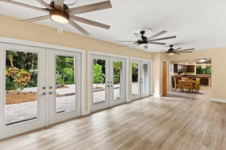 Welcome to your dream home! This beautifully updated 4-bedroom, 2-bath home located in a serene and highly sought-after gated community. Enjoy the peace of mind that comes with security and privacy, along with the option for voluntary membership to three prestigious golf courses.This bright, open home features vaulted ceilings, a cozy wood-burning fireplace, and a spacious modern kitchen with stone countertops and newer stainless steel appliances. Major upgrades include a new roof (2022) on both the home and detached garage (30-year warranty), newer gutters, 3 brand new sets of impact French doors along with brand new flooring being installed throughout, updated bathrooms, and a 6-foot privacy fence.Relax in the tranquil backyard oasis with new pavers (2023) and lush