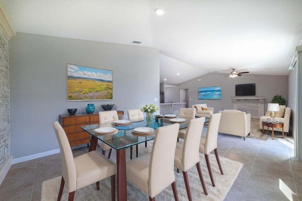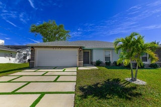 Experience modern elegance with this Newest Construction. From the moment you arrive, you're greeted by a recently upgraded driveway showcasing sophisticated stone pavers that extend to the home's facade. Thoughtful details include a custom stone mailbox and two entrance columns, while the front of the house is adorned with high-end stone accents. This quality home, featuring numerous upgrades, offers 4 bedrooms, 2 baths, and two 2-car garages. Inside, you'll find an open split floor plan filled with natural light, modern finishes, and a spacious layout designed for comfort and style.The kitchen features stainless steel appliances, plenty of storage, and so much more! Highlights include an indoor laundry room and a huge backyard, perfect for relaxing or entertaining on those breezy Florida days. Ideally located close to the beach, shopping, and local attractions, this home truly has it all a must-see!