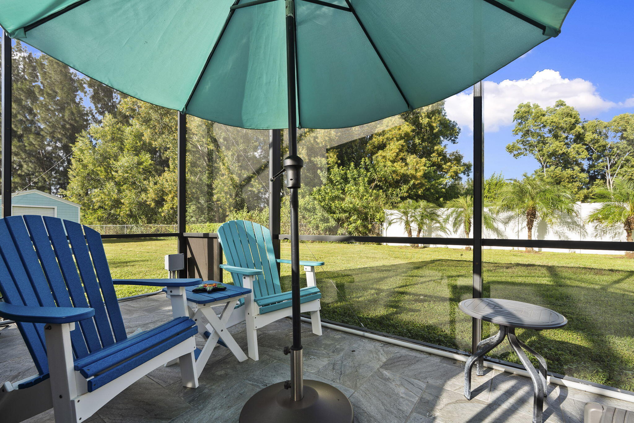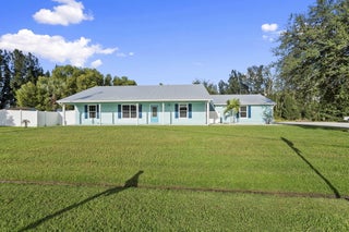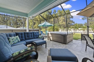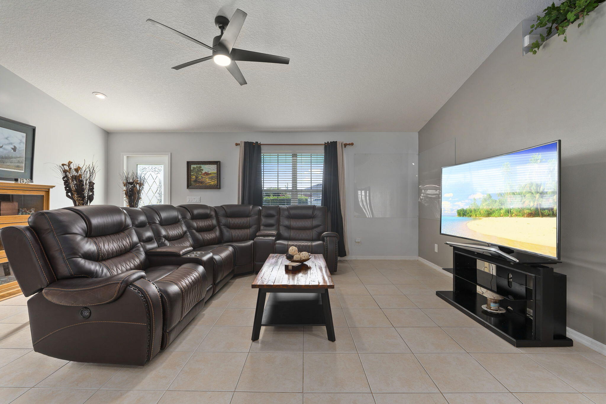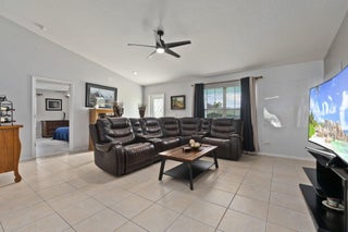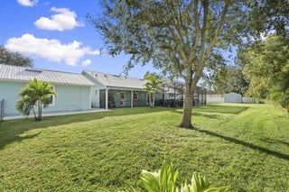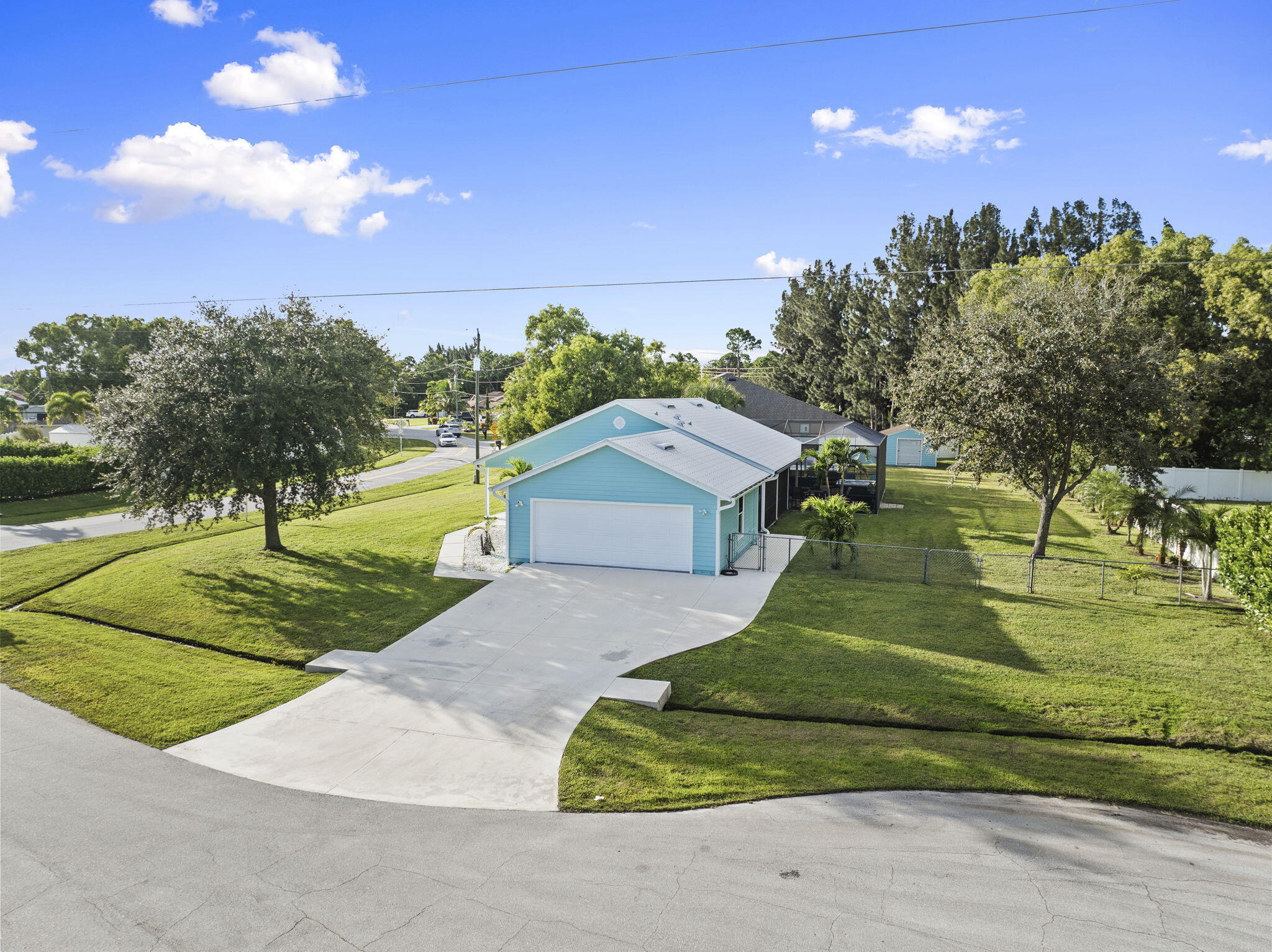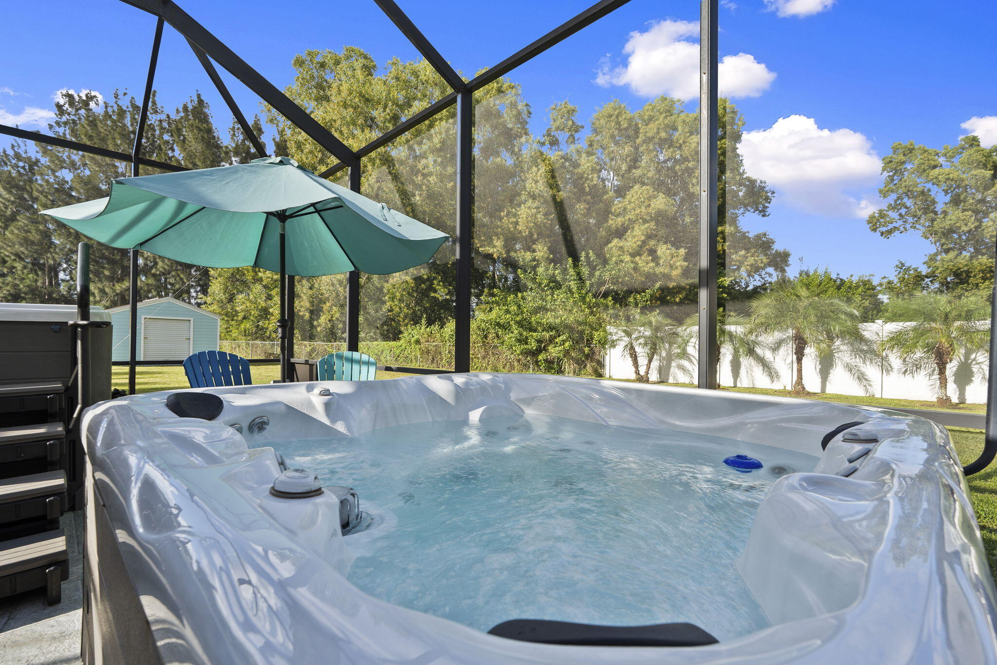 Welcome to a home that blends Florida charm with thoughtful upgrades and a ranch-style retreat set on a rare 0.57-acre double lot with, Hardie board siding, and a metal roof, this home was designed for both energy efficiency and lasting quality.Step inside to vaulted ceilings and a bright, open floor plan. Tile flows throughout the main living spaces, and primary bedroom, while two guest bedrooms feature carpet. The kitchen offers dark wood cabinetry, granite countertops, a breakfast bar with seating for three, and stainless Samsung appliances perfectly designed for cooking, entertaining, or gathering with family.The primary bedroom includes a spacious walk-in closet, a large vanity, and an walk-in shower. The two additional bedrooms provide flexibility for guests, a home office, or creative space. The air-conditioned garage is more than parking. with epoxy floors and a built-in bar, it doubles as an entertainment hub or flex hangout while still accommodating cars. Outdoors, the oversized lot is fully cleared and fenced with a mix of white privacy fencing and chain link where it counts, accented by oak, willow, and palm trees. A French door off the dining area leads to the expansive screened patio, where a swim spa and hot tub (included) create your own private retreat. Positioned at the entry to a cul-de-sac, the property offers both accessibility and privacy while keeping you close to schools, shopping, dining, I-95, and the Turnpike. This isn't just a house it's a lifestyle property that combines space, upgrades, and Florida living.