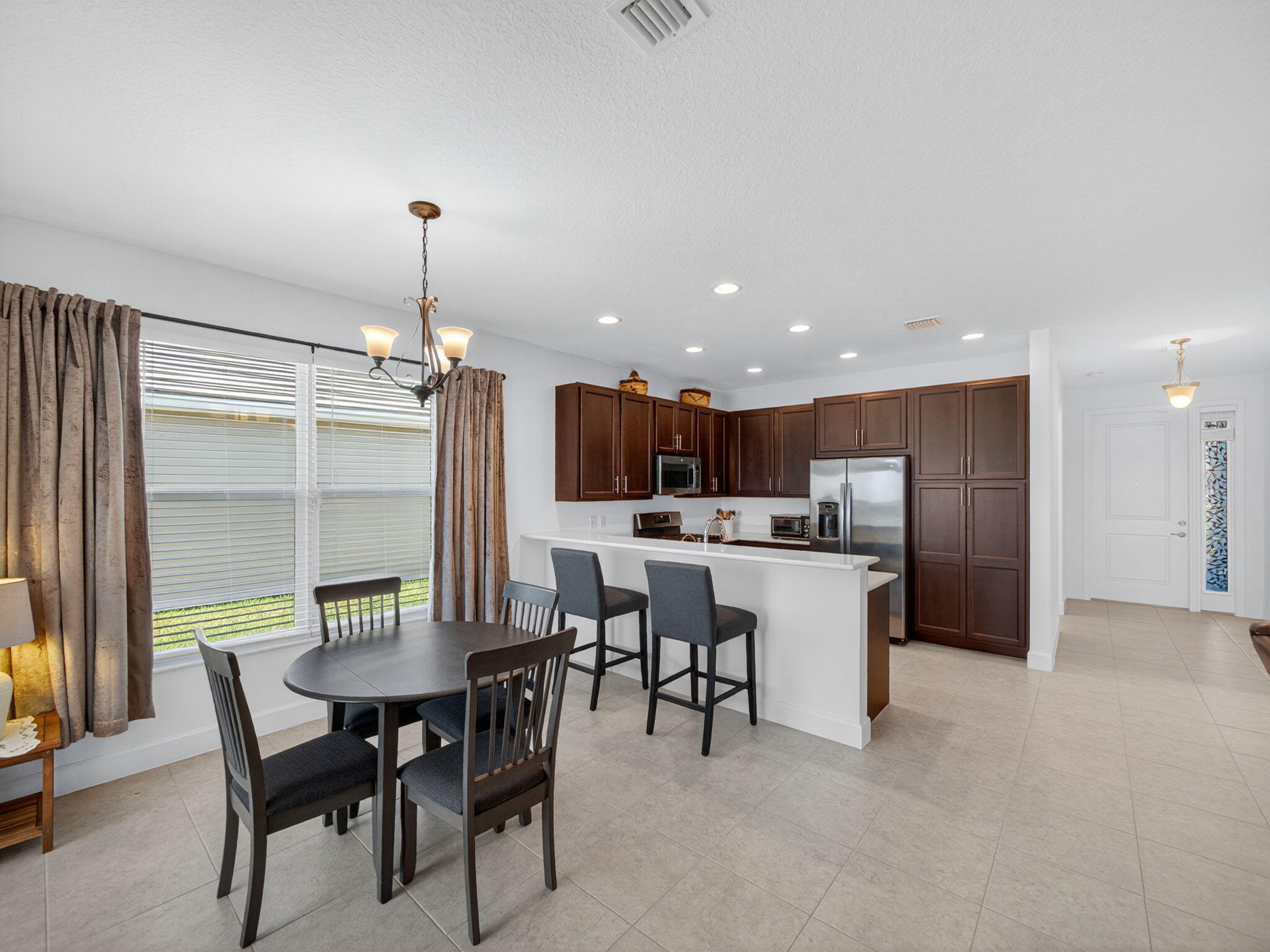 Welcome to this stunning 2-bedroom + den, 2-bathroom home perfectly situated on a premium lakefront lot in the desirable 55+ community of Valencia Grove at Riverland. Enjoy peaceful water views, modern finishes, and a low-maintenance lifestyle in this move-in-ready residence. The open-concept floor plan features tile flooring throughout and complete impact windows for safety and energy efficiency. The gourmet kitchen boasts a gas range, sleek cabinetry, and a spacious layout ideal for both everyday living and entertaining. The den offers flexible space--perfect for a home office, guest room, or hobby area. Throughout the home, you'll find custom window treatments that add a touch of style and comfort, along with a RainSoft water softener system providing premium water quality throughoutLocated within Valencia Grove at Riverland, residents enjoy resort-style amenities, scenic walking and biking trails, and an active 55+ lifestyle. With its modern upgrades, serene lakefront setting, and exceptional attention to detail, this home is the perfect combination of luxury and comfort.