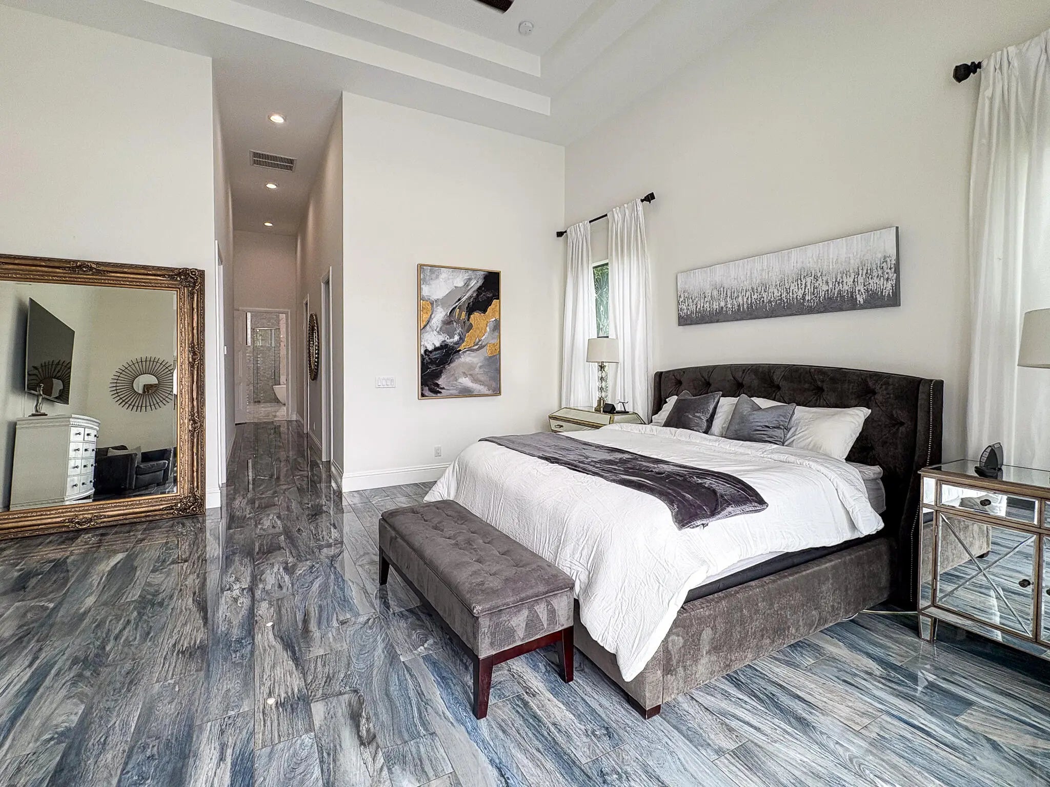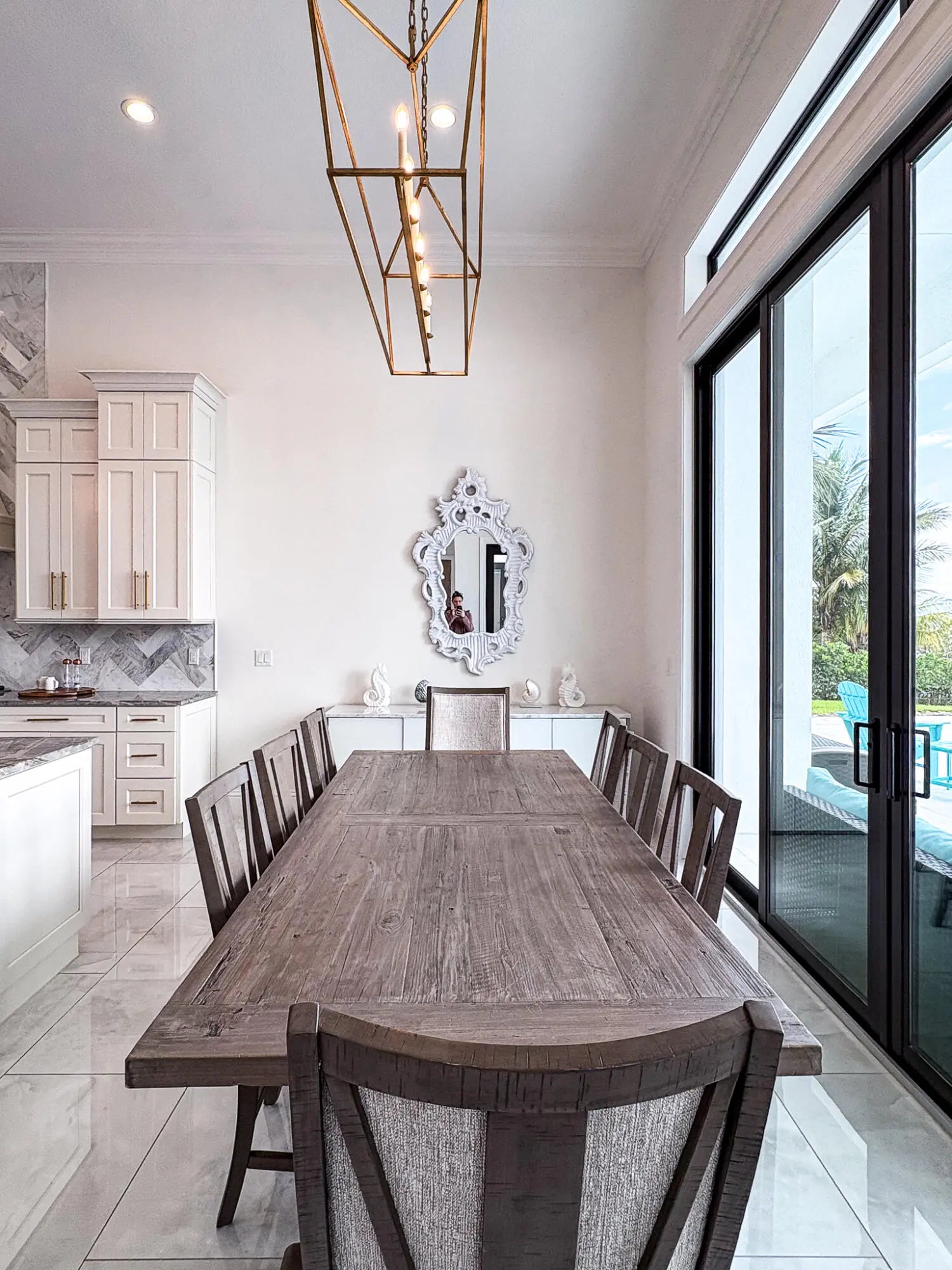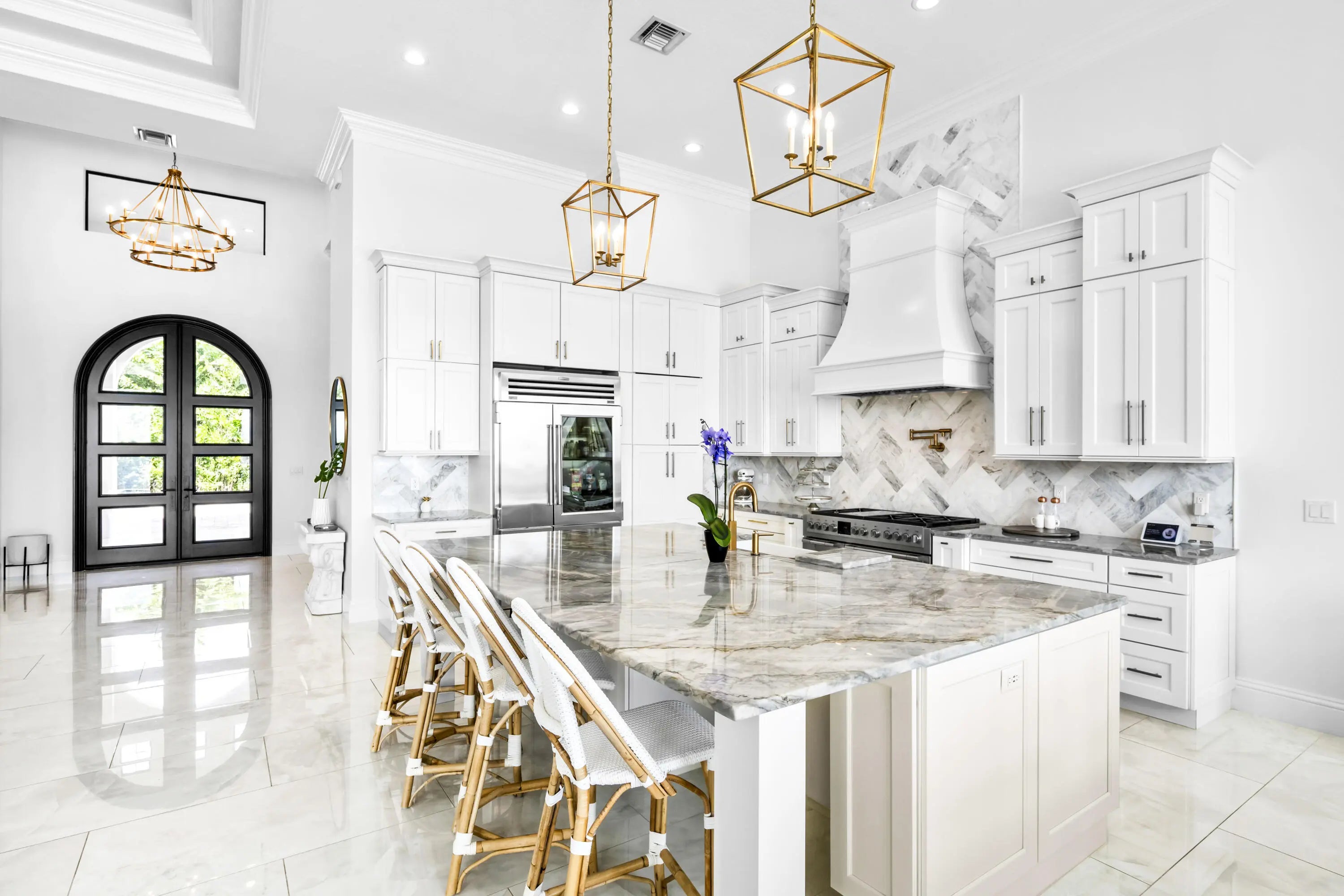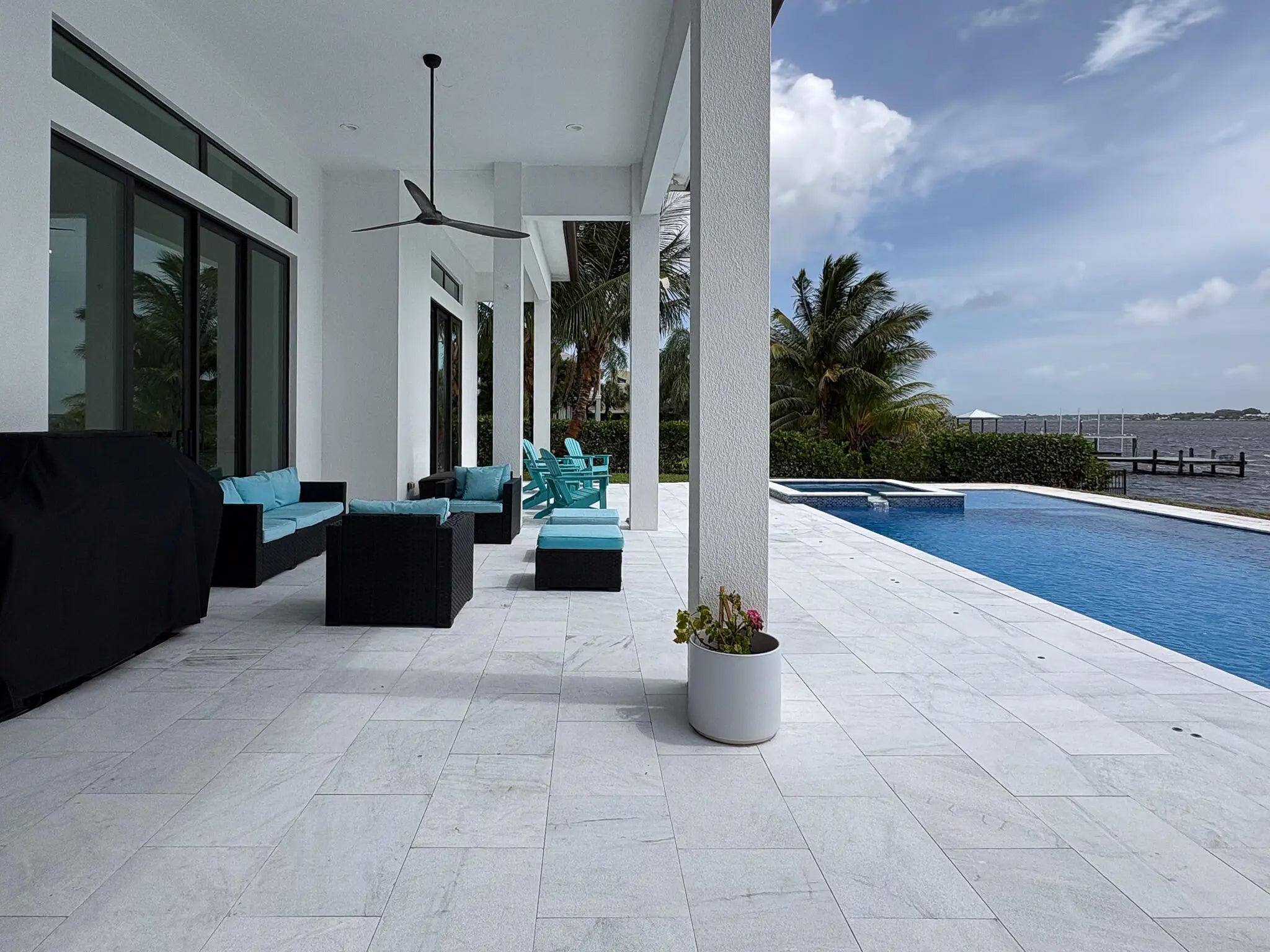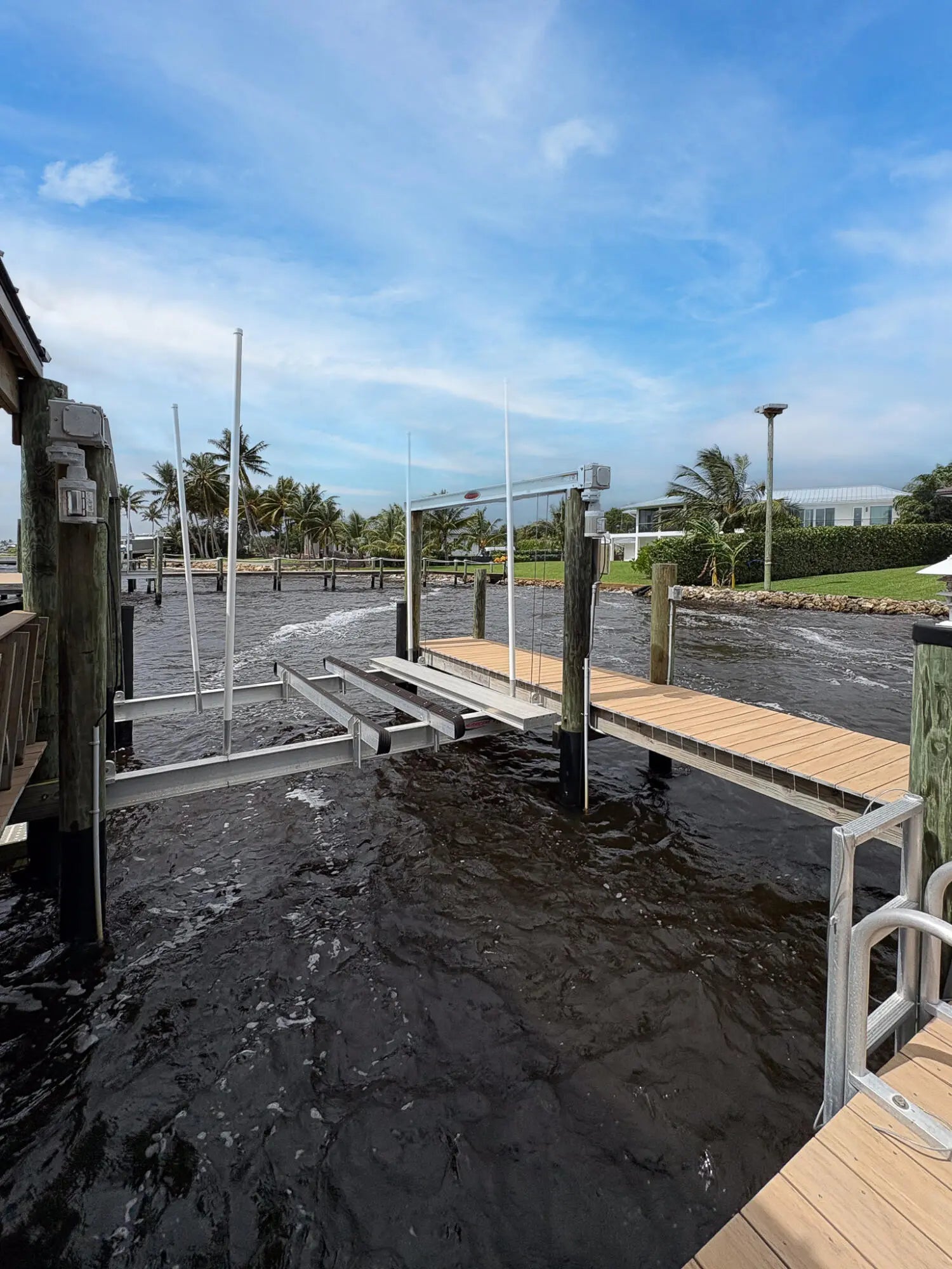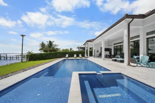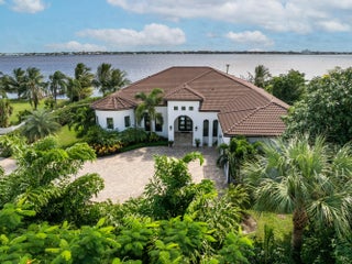 FIRST TIME ON MARKET! Premier waterfront location built in 2020. Modern-Mediterranean home close to downtown Jensen Beach and Stuart. Spectacular southern exposure and wide-water view. Direct ocean access minutes from the St. Lucie Inlet. No low bridges - a boater's dream. High coffered ceilings, four spacious bedrooms plus a den, four full baths, and a cabana bath designed for everyday comfort and effortless entertaining. Gourmet chef's kitchen, top notch appliances, quartzite counters, custom cabinetry, walk-in pantry. Private waterfront with covered dock, two high-speed boat lifts, personal watercraft lift, and lowered platform for kayaks and paddle boards. Room for your yacht or sport-fish. Heated saltwater pool, spa tub, sun shelf, and iridescent glass tile.