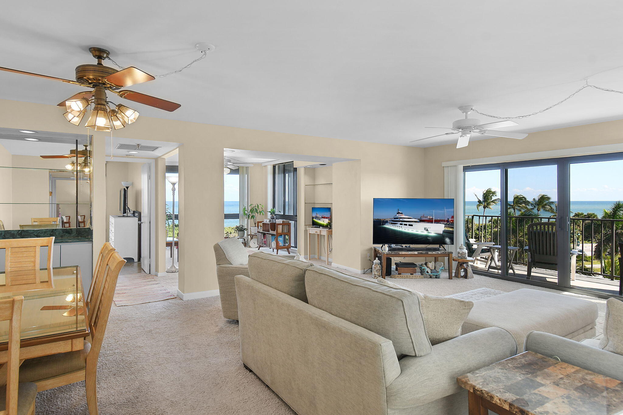 Experience true coastal living in this bright & airy, 2-bedroom, 2-bath condo at Sea Pointe Towers, ideally positioned between the Indian River and the Atlantic Ocean. This 5th-floor, SE end unit offers an open, airy layout with ocean views from nearly every window. The large updated, hurricane-rated slider leads from the living room to a large private balcony overlooking the ocean. The 1,704 sq ft interior features updated stainless sink and modern lighting in the kitchen, and a LG All in One wash-dry combo. Split-bedroom design, two HVAC units, 2 water heaters, 2 exterior storage closets, and storm panels add comfort and convenience. Step outside to a public beach just across the street or relax on the community's private private fishing/kayaking dock on the Indian River LagoonAmenities include a heated pool, fitness center, tennis/pickleball, game room, library, billiards, and a community room with kitchen. Sea Pointe Towers is meticulously maintained with strong financials, reasonable Condo fees, a recent 40-year inspection completion, new roof, and fresh exterior paint. Located minutes from the Fort Pierce Inlet, jetty, restaurants, and nightlife. This condo offers the best of island living on Hutchinson Island.