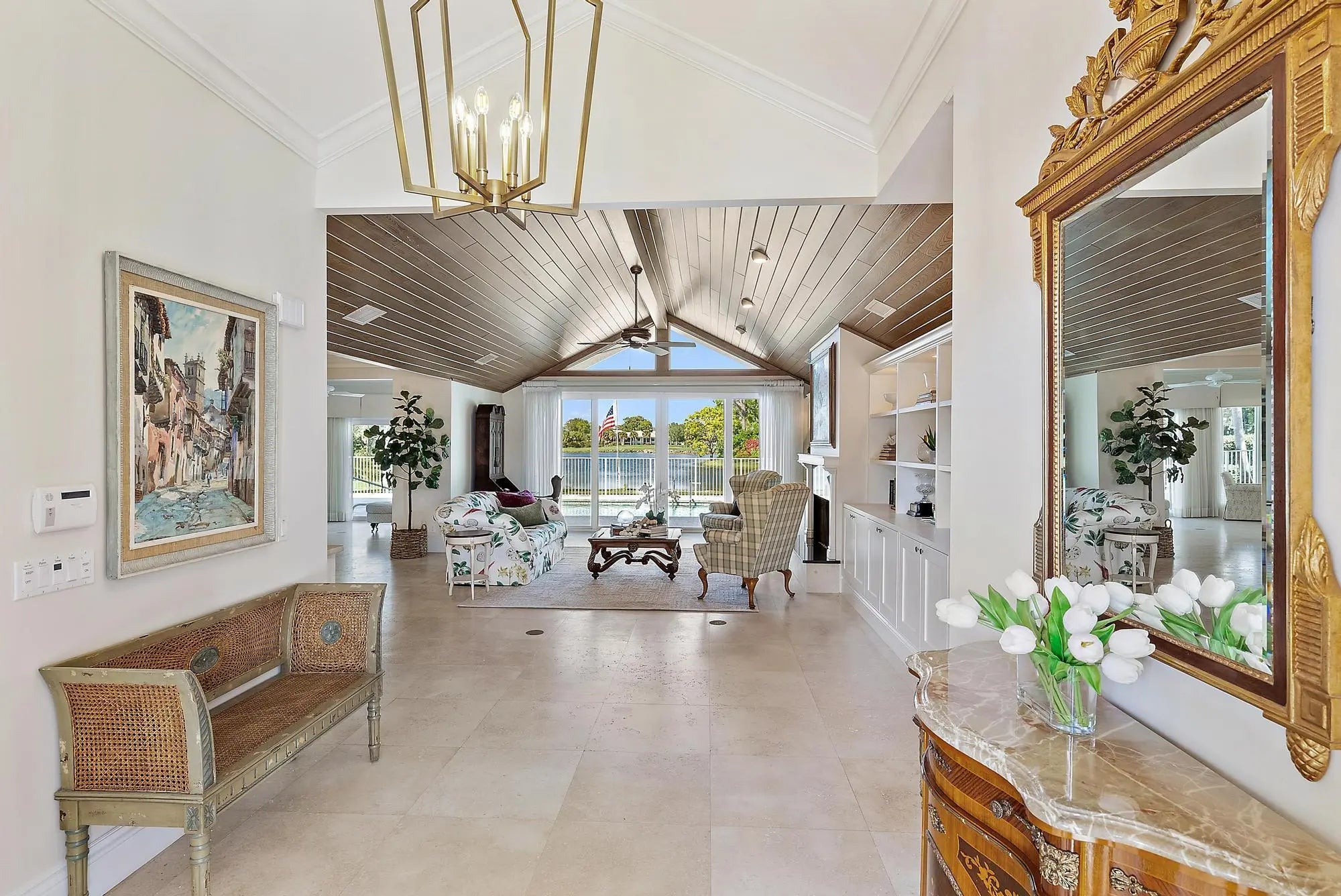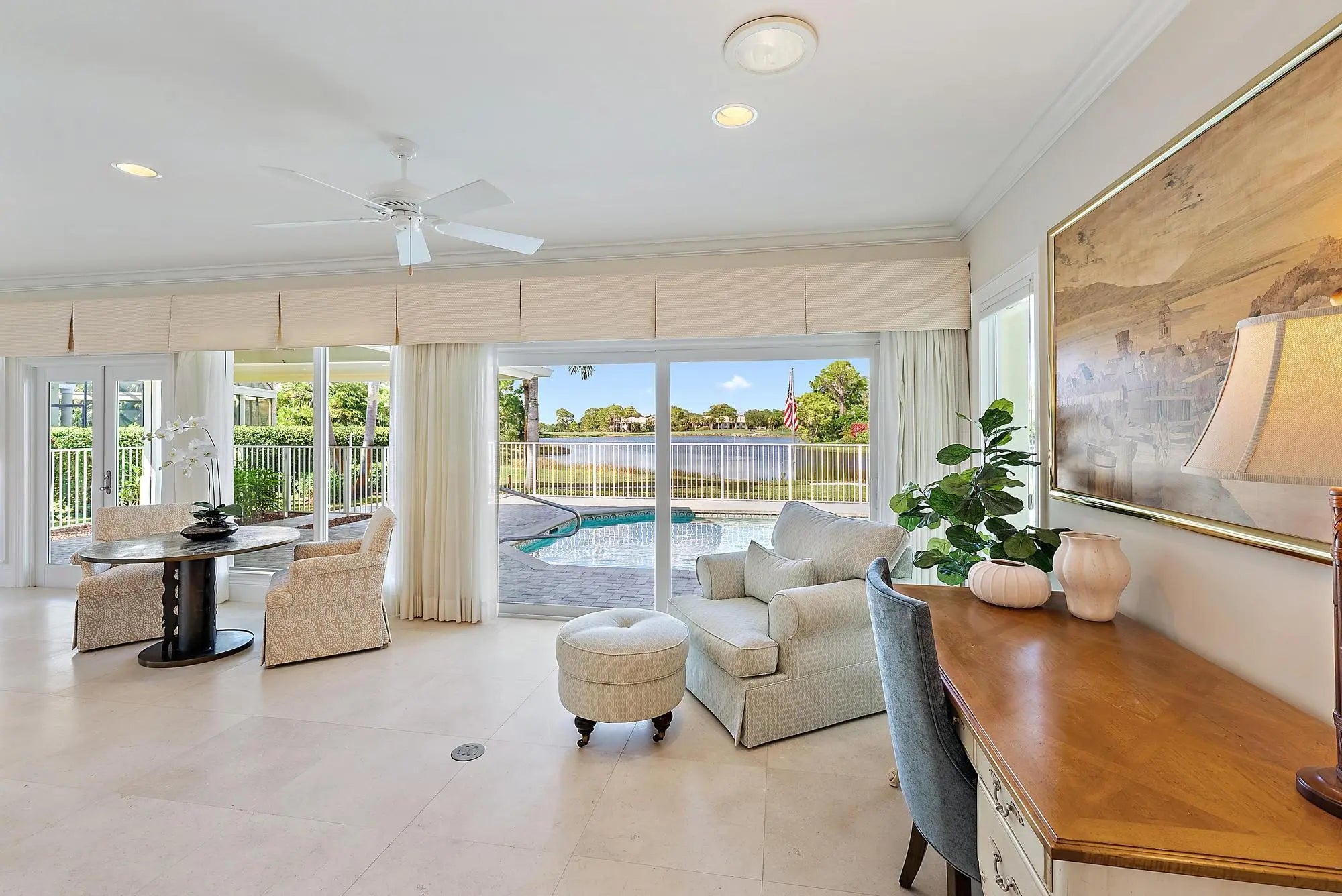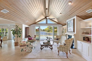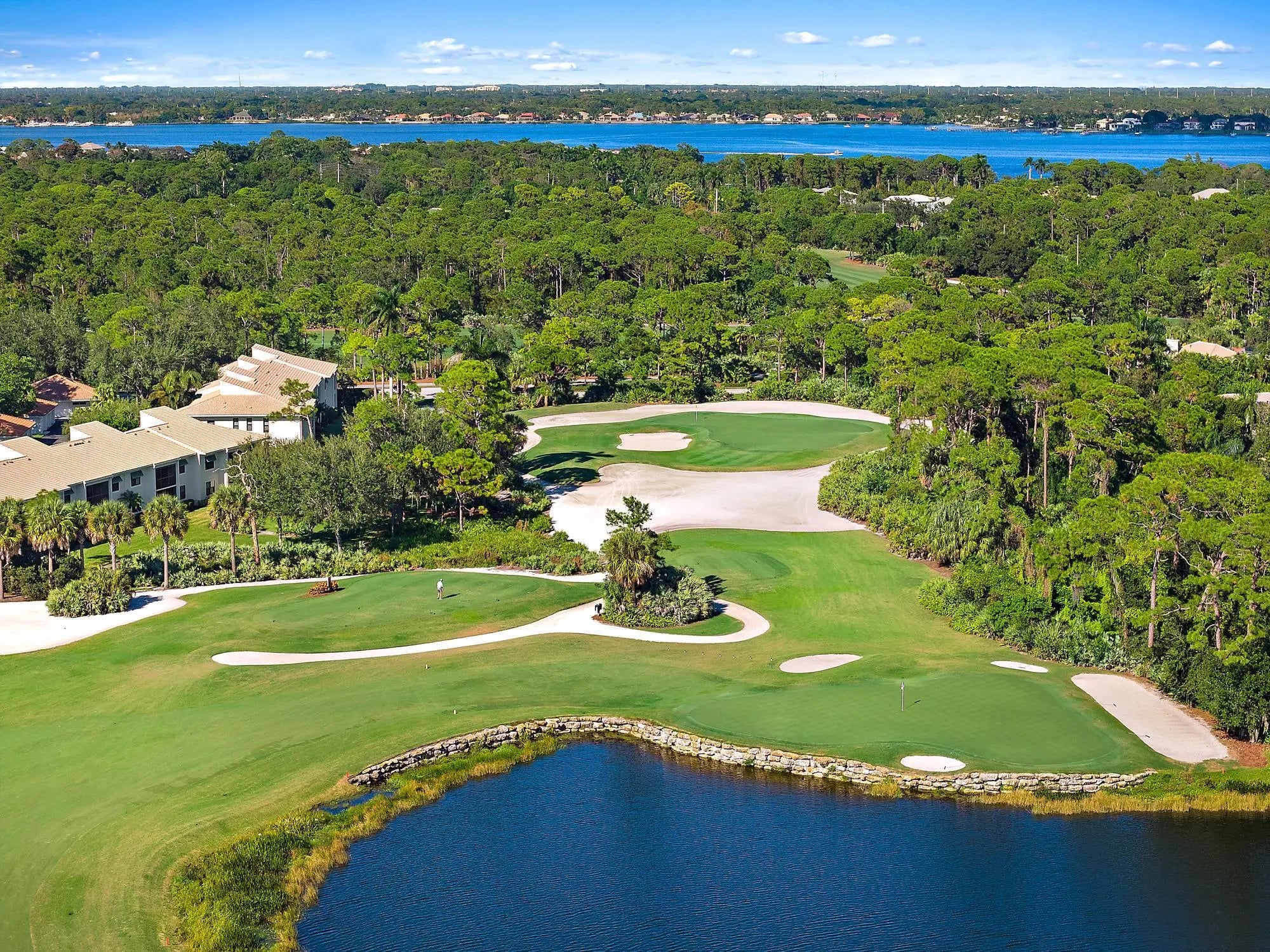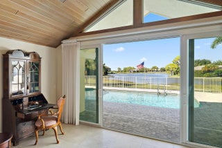 Stunning Harbour Village custom home with panoramic lake and golf course views. Recent updates, including whole house interior paint, fresh landscaping, new lighting, hurricane-code impact windows and sliders, reimagined spa-like primary bathroom, and a whole-house generator with 1,000-gallon propane tank. Main home features an open floor plan with 2 bedrooms, including a spacious primary suite, guest bedroom with en suite bath, and office/5th bedroom. The kitchen boasts stainless steel appliances, granite countertops, gas range, double ovens, and new stacked tile backsplash. A private 2BR/2BA guest house sits beside the pool. Additional highlights include Phantom screens, SWAT bug system, and a 3+ car garage with golf cart space. Turnkey elegance with unparalleled country club living.