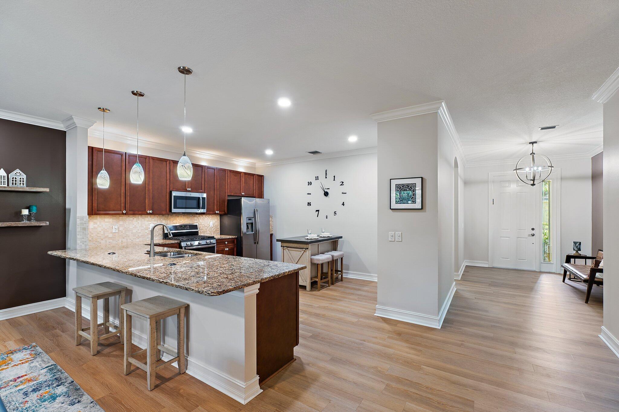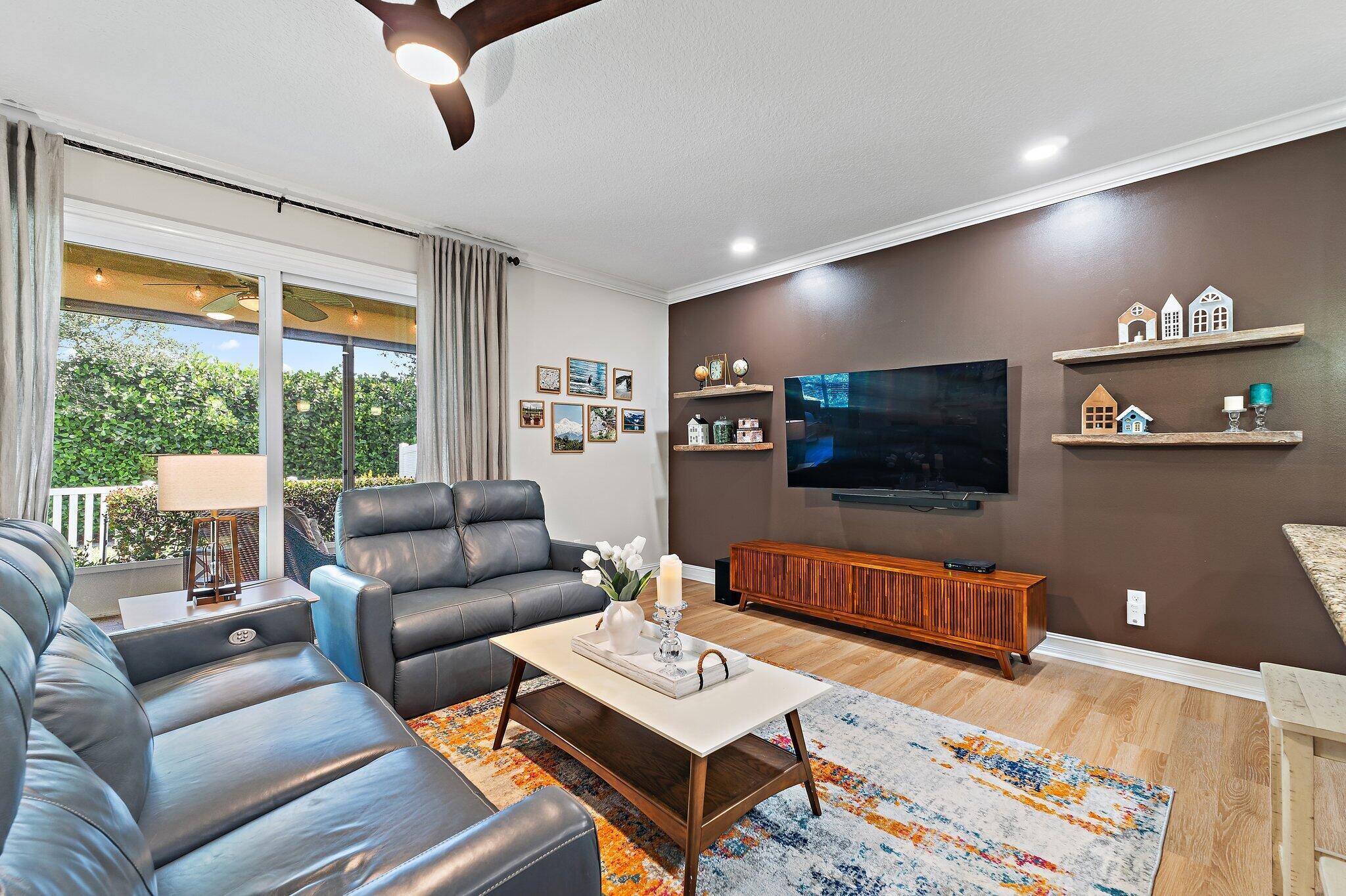 Professionally Decorated & Beautifully appointed 3 Bedroom 2 Bath 2 Car Garage Villa! Features: Luxury Vinyl Wood Plank Flooring thru-out, Crown Molding, Tray Ceilings, Freshly Painted Interior, Designer Window Treatments, Upgraded Lighting/ Fans & Custom Closets in Primary Bedroom & Guest Bedroom. Enjoy Peace of Mind w/Newer Built Solid CBS Construction, Hurricane Impact Windows & Doors, Concrete Tile Roof & Generac Generator on Natural Gas. Gorgeous Granite Kitchen w/42'' Cabinetry, Under Cabinet & Accent Lighting, updated S/S Appliances, Gas Cooktop, Upgraded Bosch Dishwasher, Pantry & Custom Island. Primary Suite w/2 walk in Closets w/Built-ins, Sitting Area & Luxurious Bath. 2 Spacious Guest Bedrooms & Custom Painted Guest Bath w/Granite Vanity. Covered & Screened Patio w/stone flooroverlooking lush private Fenced Rear Yard. NEW: Garage Door Opener, Garbage Disposal, Hot Water Heater, Toilets & ALL faucets. Gated Entry, Tropical Oasis, Community Pool/Spa Fitness Center & More.Wow
