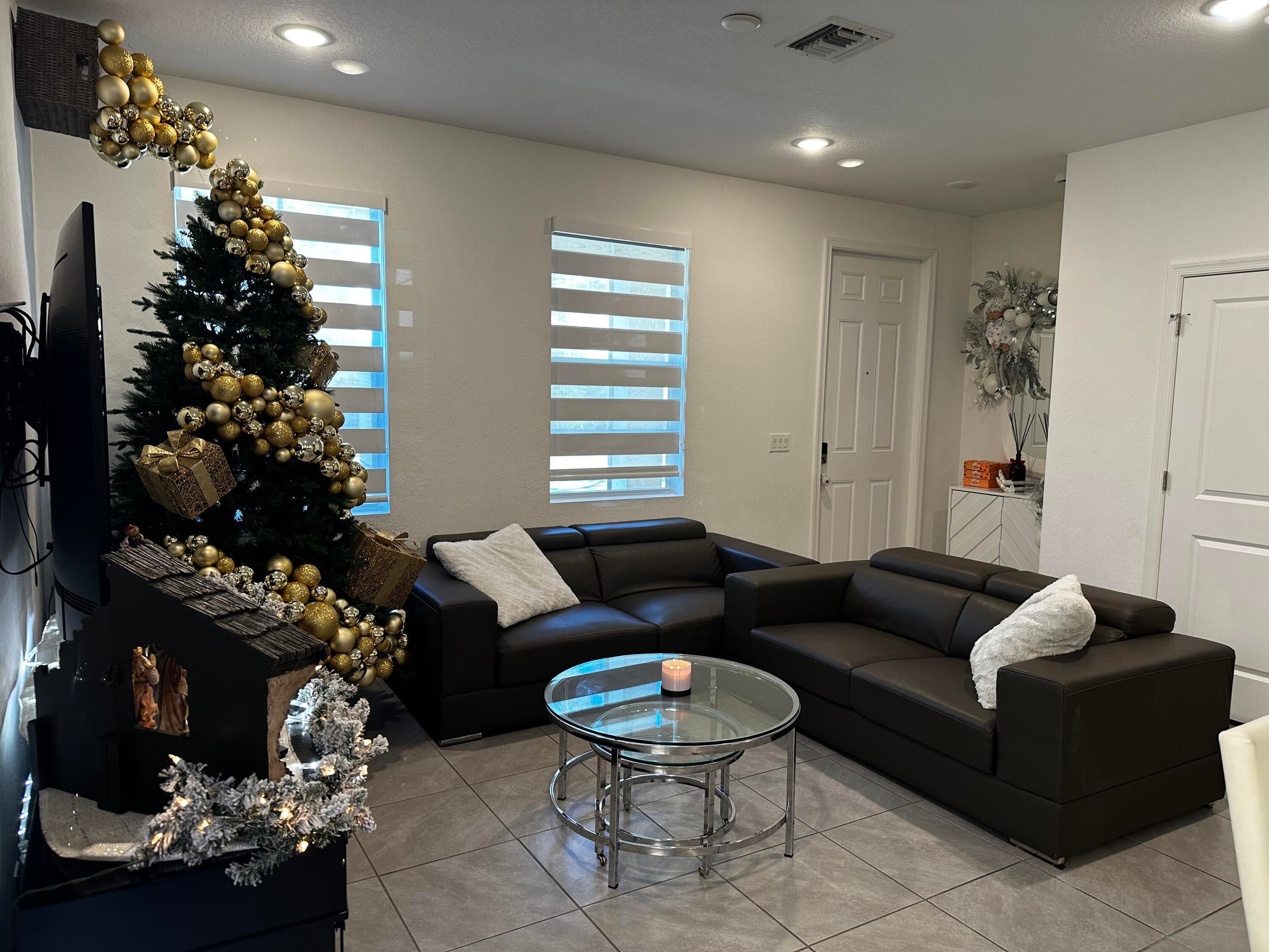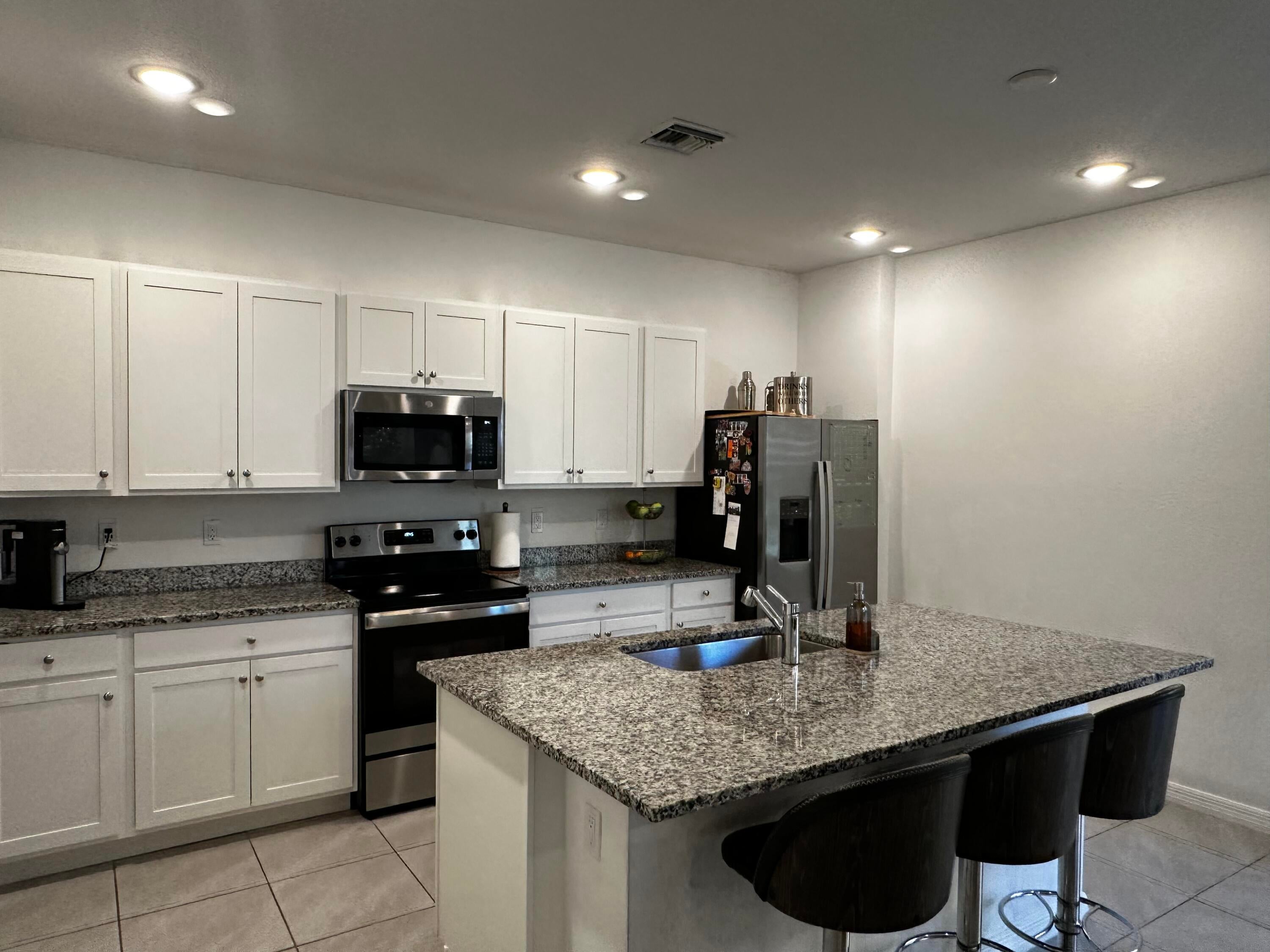 Two-year-old 2-story home. Carpet and ceramic tile flooring. Washer and dryer. Impact glass windows. Dual sinks in the master bathroom. Kitchen island. Still like new.