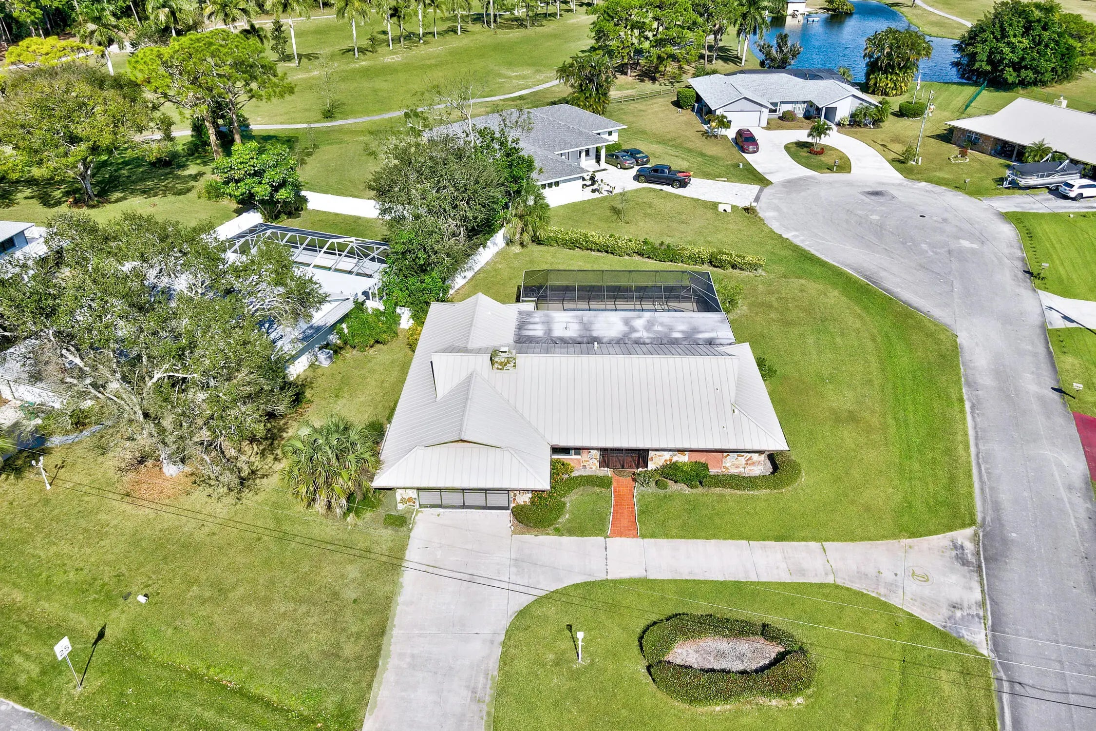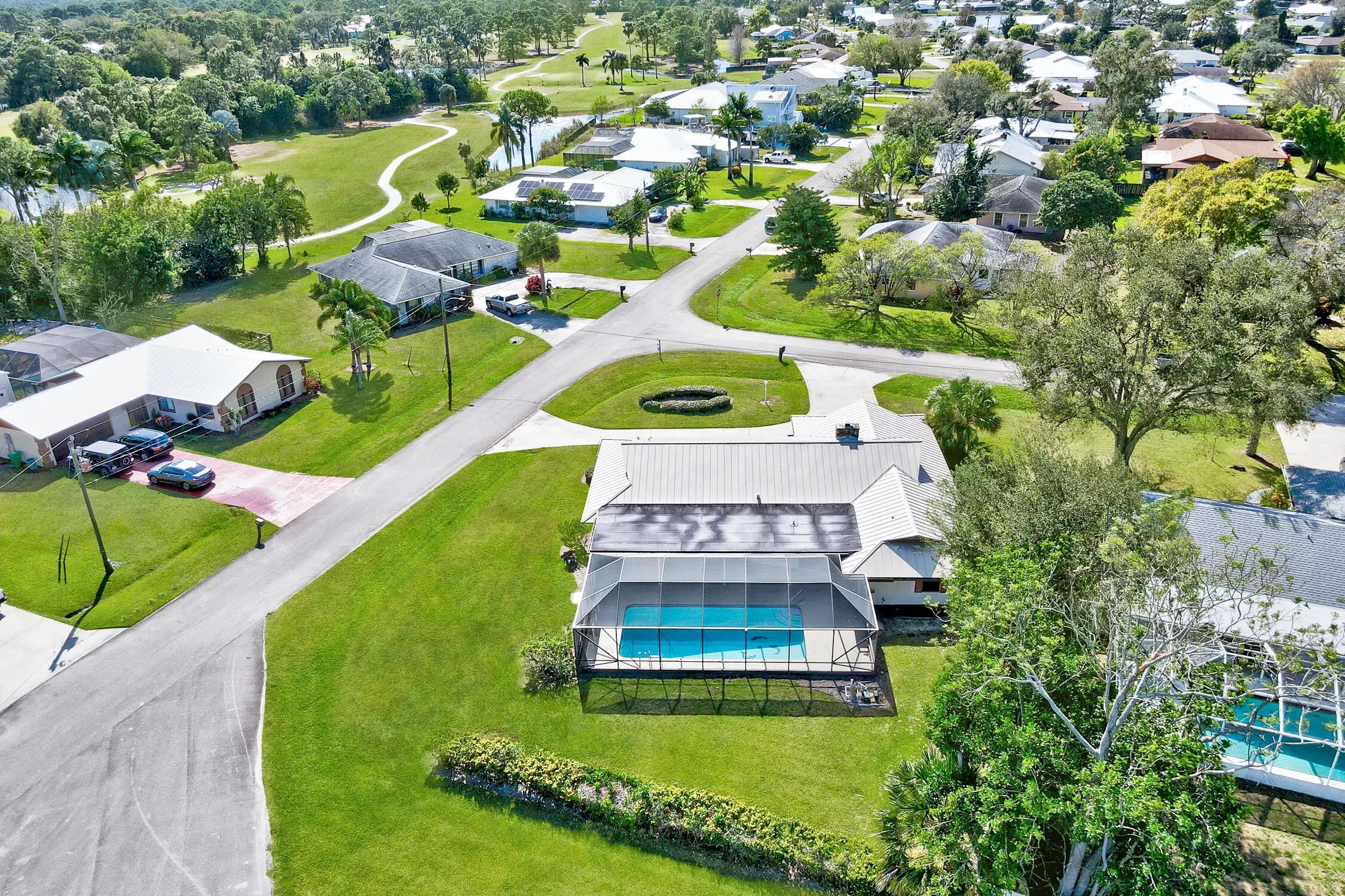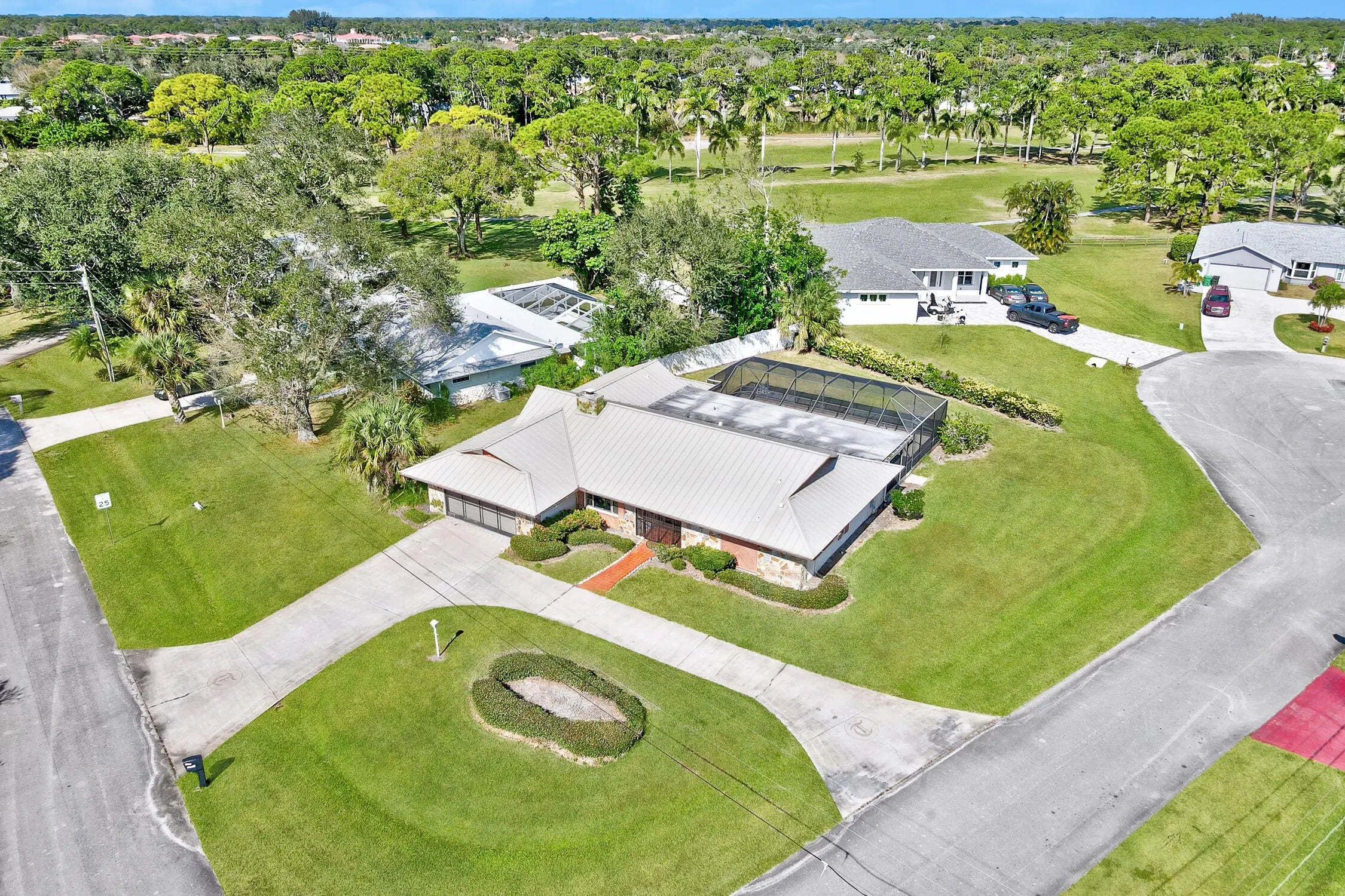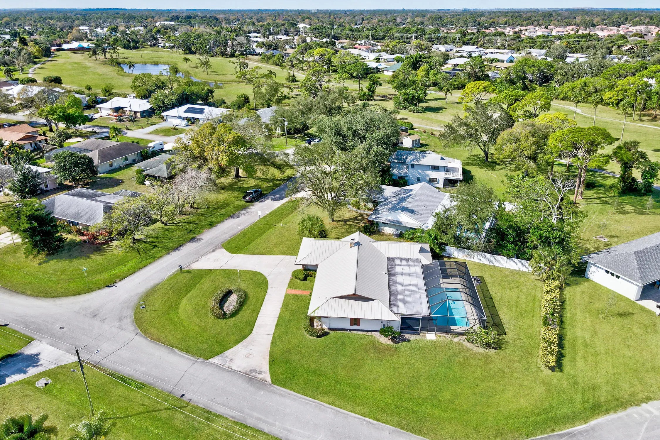 Discover the epitome of family living in this charming 3-bedroom, 2-bathroom single-family residence nestled in a serene, well-established neighborhood, perfect for those seeking tranquility and convenience. This home stands out with its robust construction featuring a 2021 metal roof and a spacious 2156 sq/ft living area, all on a generous .32-acre corner lot with a welcoming circular driveway.Boasting a split floor plan that promotes privacy, the masterful design integrates a sizable living room with sliders that lead out to a screen-enclosed, freshly refinished inground pool--your private oasis for relaxation or entertaining. The family room, warmed by a cozy fireplace, flows seamlessly into a kitchen equipped with ample cabinets, vast countertop space, and a convenient recipe/