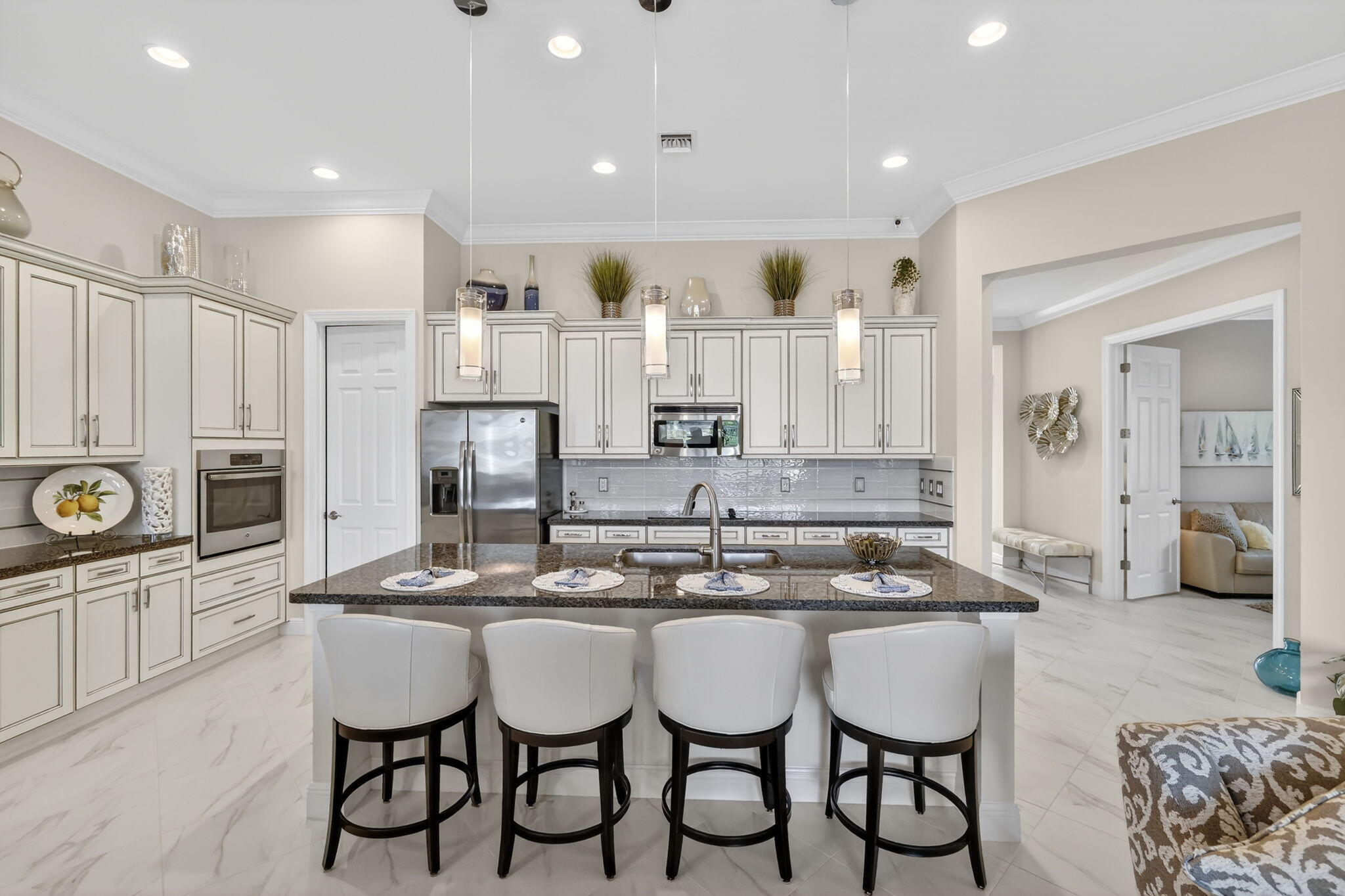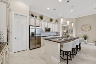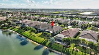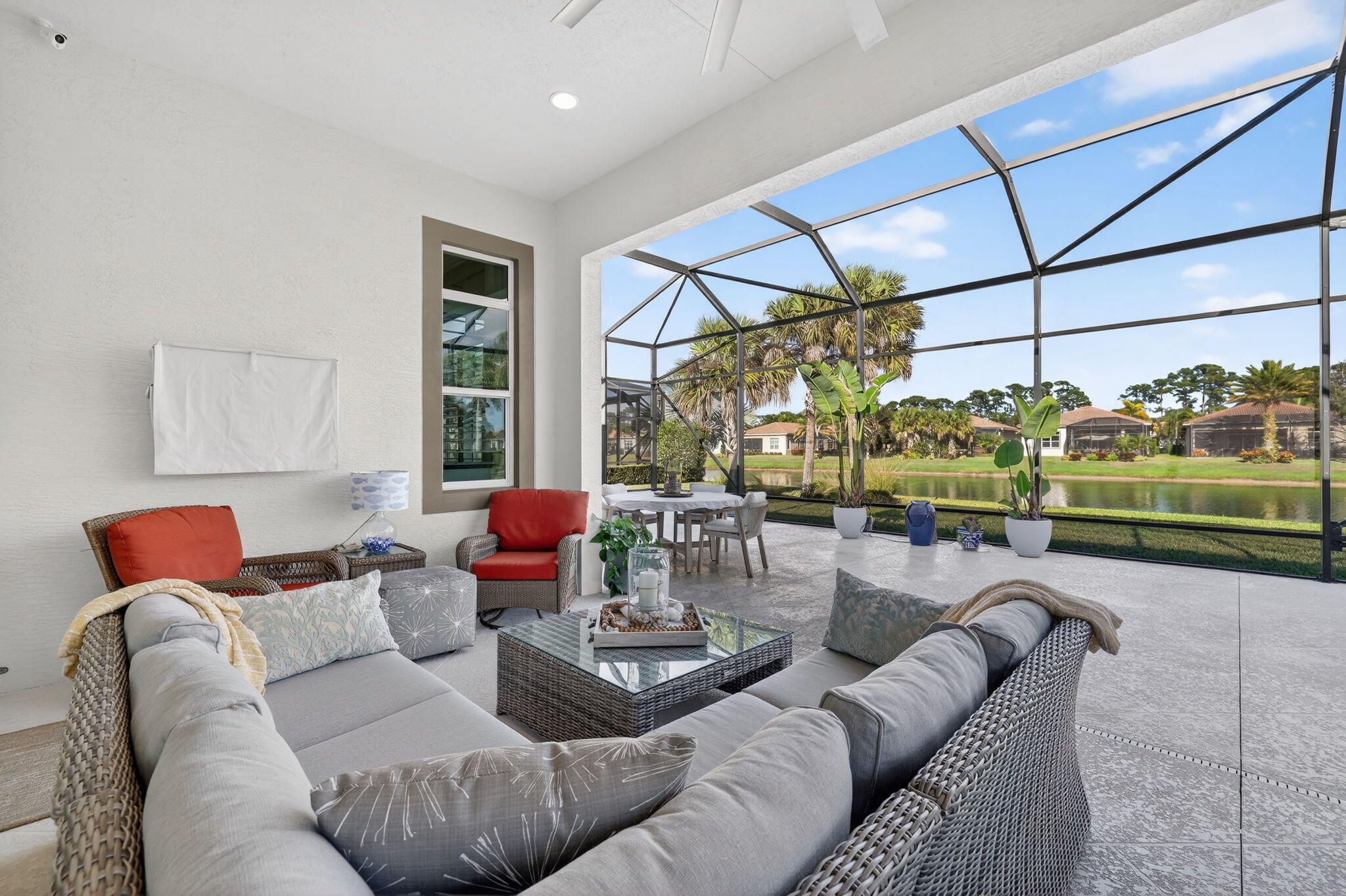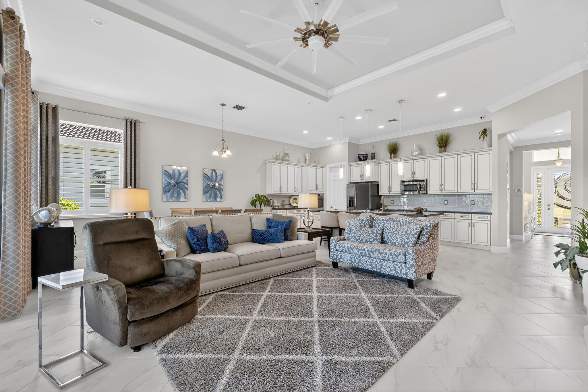 One of the best locations in PGA Verano. This waterfront Lago model is 2 bed,2 bath plus a flex room on the Island of Capraia which is surrounded by water & on dead end street with cul-de-sac, so next to no traffic. Home sits on large water lot with room for a pool. Inside of home is spotless with Carrara porcelain tile everywhere but bedrooms. block construction, impact window & doors so no shutters to deal with. Split bedrooms plus a flex room & open floor plan. Custom kitchen with Blue Pearl Granite countertops & walk in pantry. Large kitchen island to entertain overlooking great room with cathedral ceilings & custom molding and cabinetry. All windows have plantation shutters, motorizes shade on sliding doors, All doorways are 8 ft high with 11 ft ceilings with fans in every room.Large primary suite with 12ft tray ceiling and primary bath includes custom tile finishes.Ample laundry room with plenty of cabinets & wet sink.New A/C system in 2023 & water heater 2025. Outside enjoy a 25X12 covered lanai with cool deck & outdoor kitchen.In addition the owners extended the rear patio to additional 18x40 all screened in overlooking the water. HOA fee includes a manned guard gate, fast internet,alarm monitoring,phone & cable w HBO, lawn care, shrubs & fertilizer. Amenities include Talavera clubhouse with tennis courts,indoor & outdoor pools, cafe, gym,pool room & more.A separate pickle ball center w E-Gym & resistance pool. Also private golf cart access road to PGA Golf club just a block from this home as well as 1/2 mile to Publix & I 95 just 60 minutes to WPB. Come make it yours.