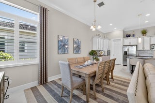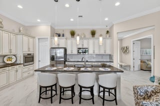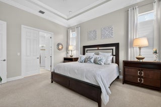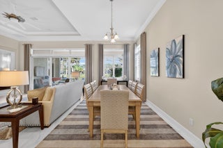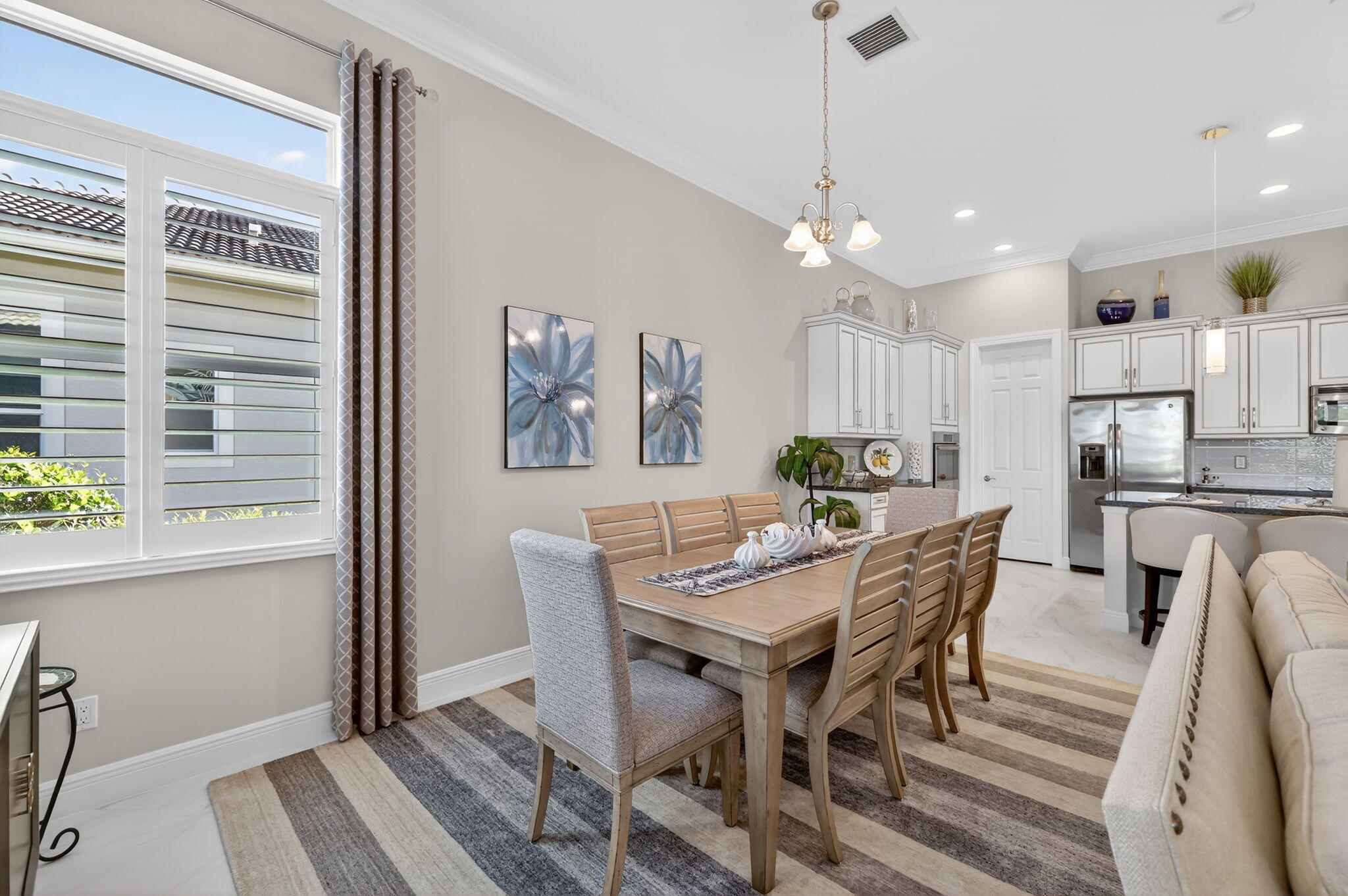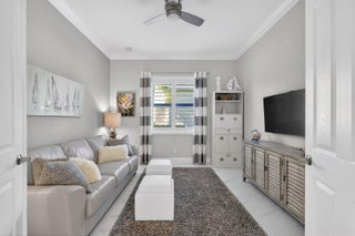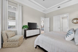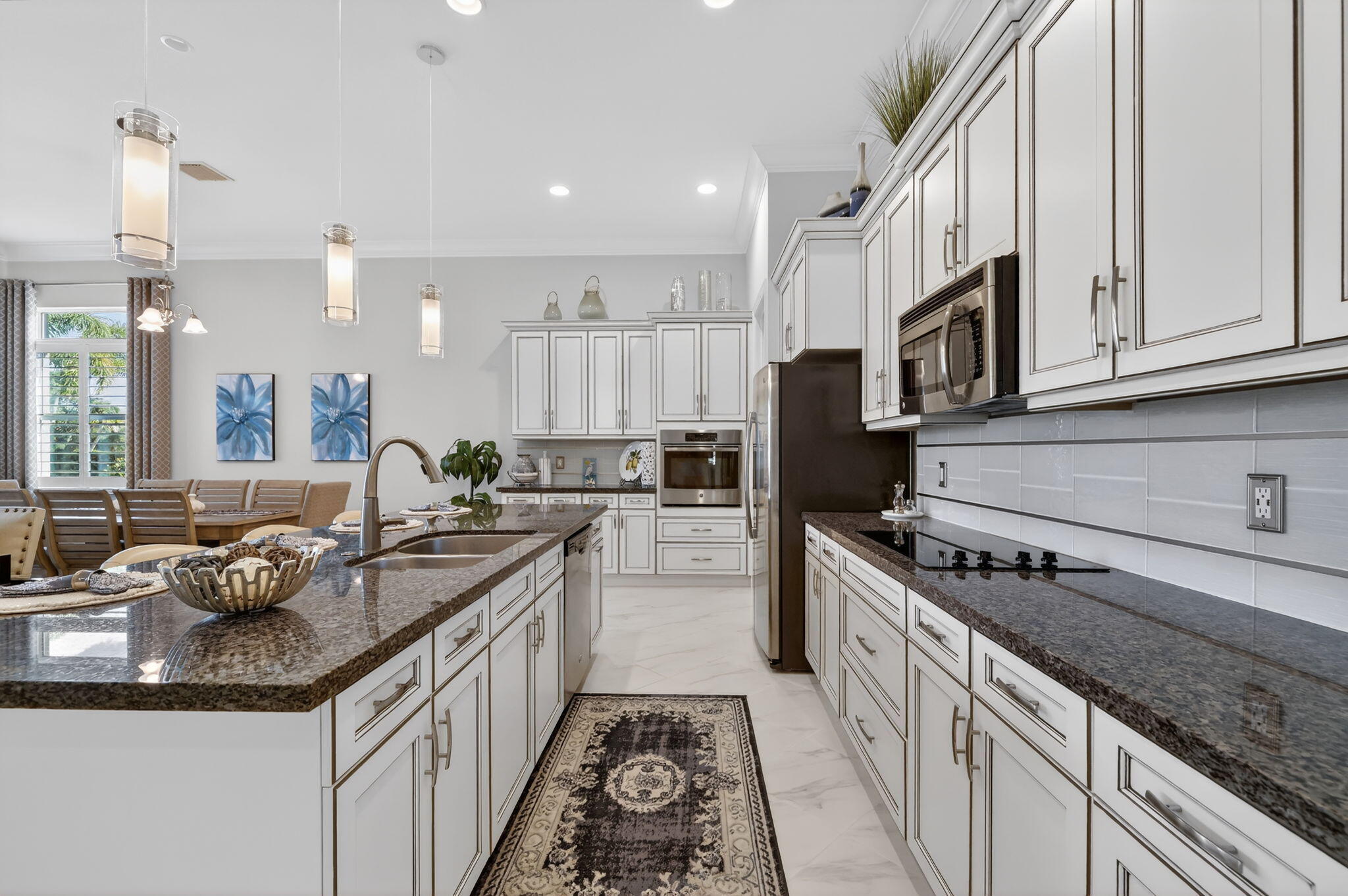 One of the best locations in PGA Verano. This waterfront Lago model is 2 bed,2 bath plus a flex room on the Island of Capraia which is surrounded by water & on dead end street with cul-de-sac, so next to no traffic. Home sits on large water lot with room for a pool. Inside of home is spotless with Carrara porcelain tile everywhere but bedrooms. block construction, impact window & doors so no shutters to deal with. Split bedrooms plus a flex room & open floor plan. Custom kitchen with Blue Pearl Granite countertops & walk in pantry. Large kitchen island to entertain overlooking great room with cathedral ceilings & custom molding and cabinetry. All windows have plantation shutters, motorizes shade on sliding doors, All doorways are 8 ft high with 11 ft ceilings with fans in every room.Large primary suite with 12ft tray ceiling and primary bath includes custom tile finishes.Ample laundry room with plenty of cabinets & wet sink.New A/C system in 2023 & water heater 2025. Outside enjoy a 25X12 covered lanai with cool deck & outdoor kitchen.In addition the owners extended the rear patio to additional 18x40 all screened in overlooking the water. HOA fee includes a manned guard gate, fast internet,alarm monitoring,phone & cable w HBO, lawn care, shrubs & fertilizer. Amenities include Talavera clubhouse with tennis courts,indoor & outdoor pools, cafe, gym,pool room & more.A separate pickle ball center w E-Gym & resistance pool. Also private golf cart access road to PGA Golf club just a block from this home as well as 1/2 mile to Publix & I 95 just 60 minutes to WPB. Come make it yours.