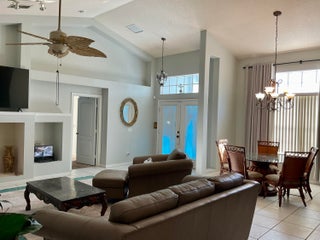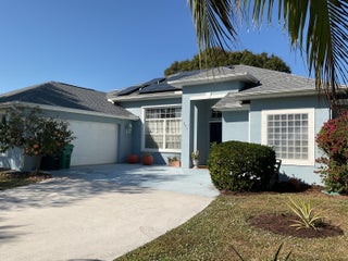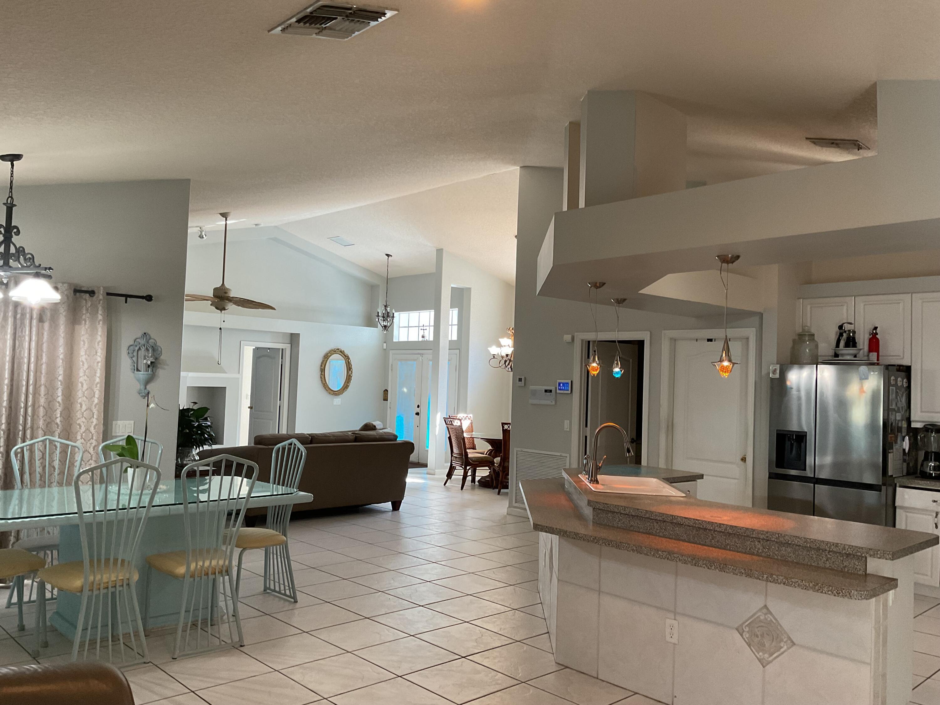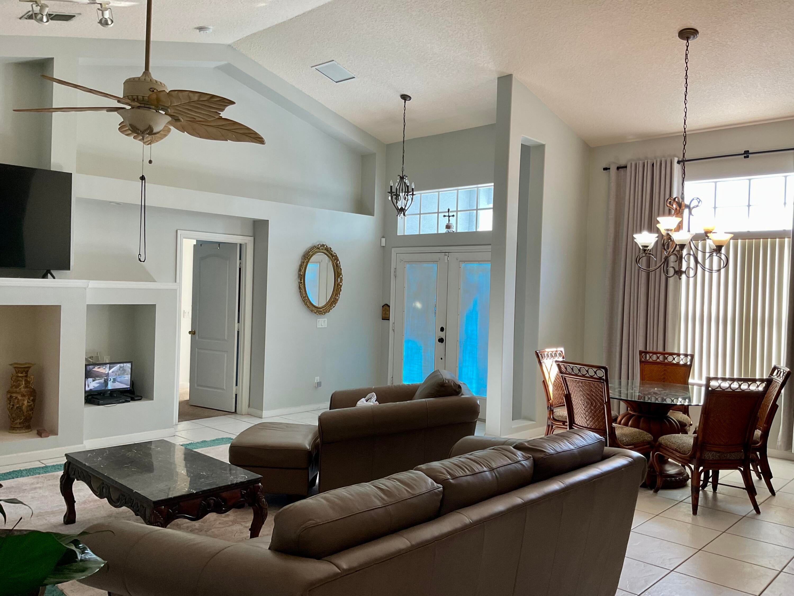 Spacious and flexible floor plan featuring 3 bedrooms plus a 4th bedroom/den, 2 full bathrooms, and a side-entry 2-car garage. This home offers a split floor plan, vaulted ceilings, and multiple living spaces including a living room, family room, dining room, and a kitchen with eat-in area and breakfast bar. All appliances are included. The primary suite is a private retreat with two walk-in closets and a well-appointed bathroom featuring separate vanities, a walk-in shower, and a Roman tub. Sliding glass doors from both the primary bedroom and living area lead to a screened, under-roof porch, ideal for indoor-outdoor living and entertaining along with an additional screened in porch. Bedroom three also features sliding doors to the screened porch, cabana bath leads to porch also.The laundry room is conveniently located off the garage, with a front-load washer and dryer, a utility sink, and a closet for added storage. Additional highlights include a roof replaced in 2022 and solar panels, keeping the electric bill approximately $30 per month. A well-designed home offering space, comfort, and efficiency, ready to fit a variety of lifestyles. Close to shopping, medical facilities, I-95 and the Turnpike.