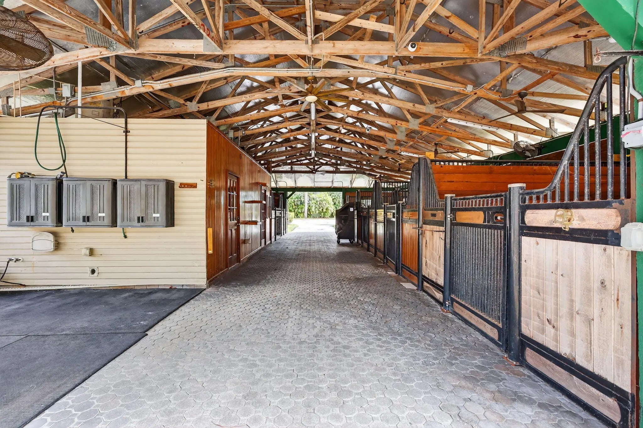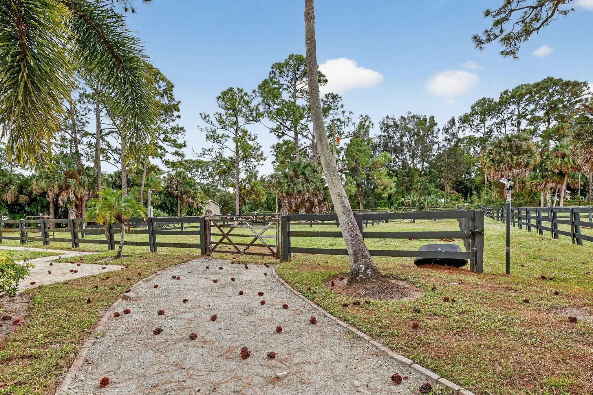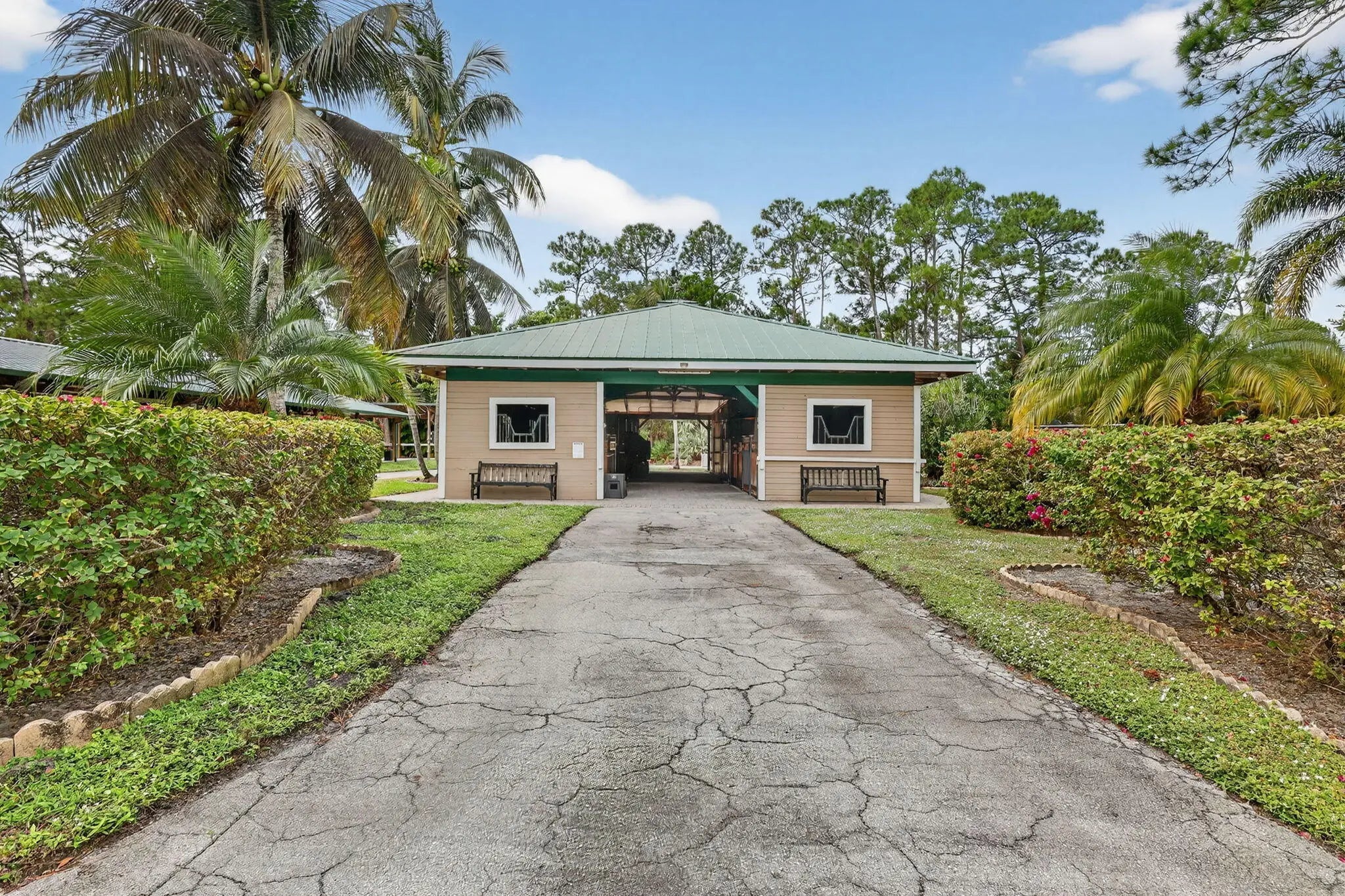 Beautiful Equestrian property with 11.72 gated acres in Palm City. There are 4 large paddocks on the front 5 acres to the main home with 3 bdrms, 2.5 baths & resort style pool with hot tub as well as Brazilian style covered cooking area. Just past the pool you will find your private 100'x220' covered arena & riding track with mirrors & ESI footing. There are 2 barns with 14 stalls, 4 wash racks, 2 tack rooms / office, feed room. Separate hay and shavings building & maintenance building with washer & Dryer & room for equipment.There are an additional 6 fenced paddocks behind the barns. The property has 2 ponds, pump for filling when necessary, irrigation system, camera system, fly system, 2 gazebos and a lunging area. This is a perfect property for full time or seasonal equestrian.