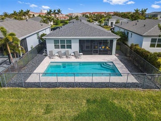 AMAZING sunsets to view from floating in your salt water-heated pool & screened back porch & fenced yard. This 3/2 w/laundry room & primary walk-in closet along w/spacious open concept w/stainless appliances & gas stove w/island area. Updated lighting - European custom curtains & blinds in bedrooms. HOA monthly payments include, Cable, Alarm, Internet, Lawn Care, and Sprinklers. GAS hot water heater and dryer and impact windows are more energy efficient. Garage epoxy floor-Furniture negotiable. Over $100K of upgrades. Amenity Center w/gym, tennis courts, dog park. Tradition shuttle to Tradition Square for dining & entertainment & Tradition Heart within walking distance for shopping & eating area. Cleveland Hospital close. New Tradition Regional Park and Stars & Stripe Park to open soon.