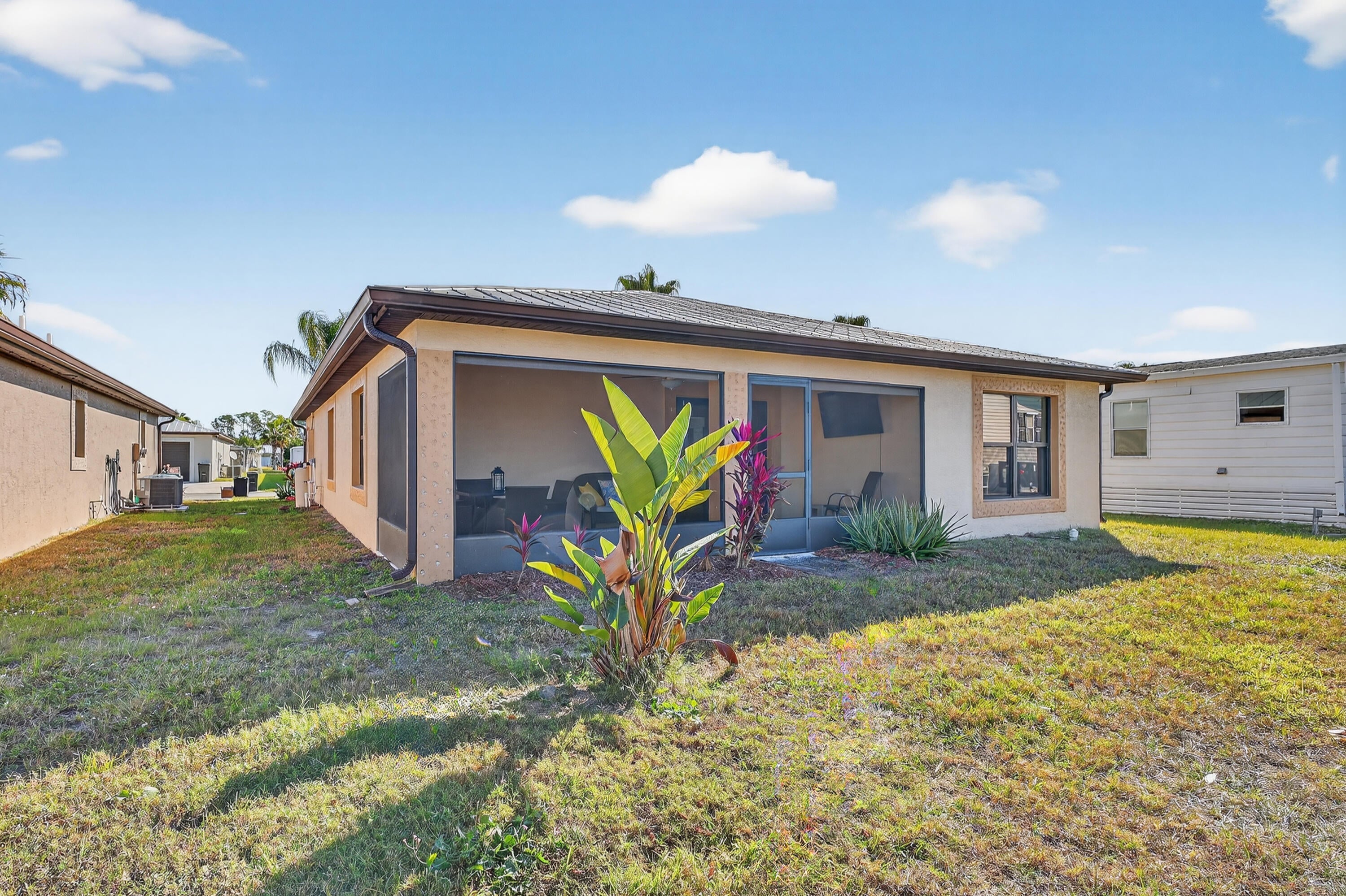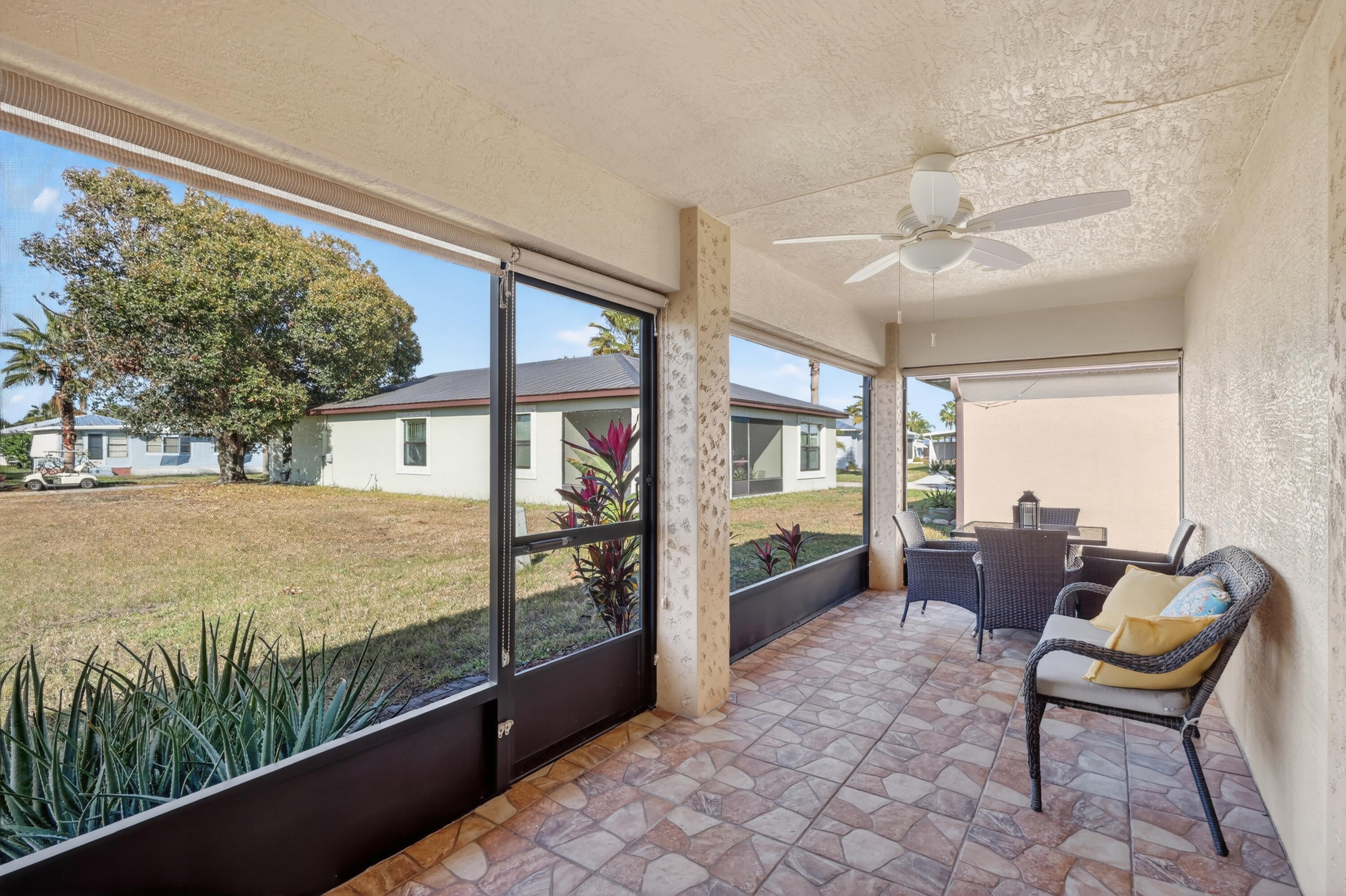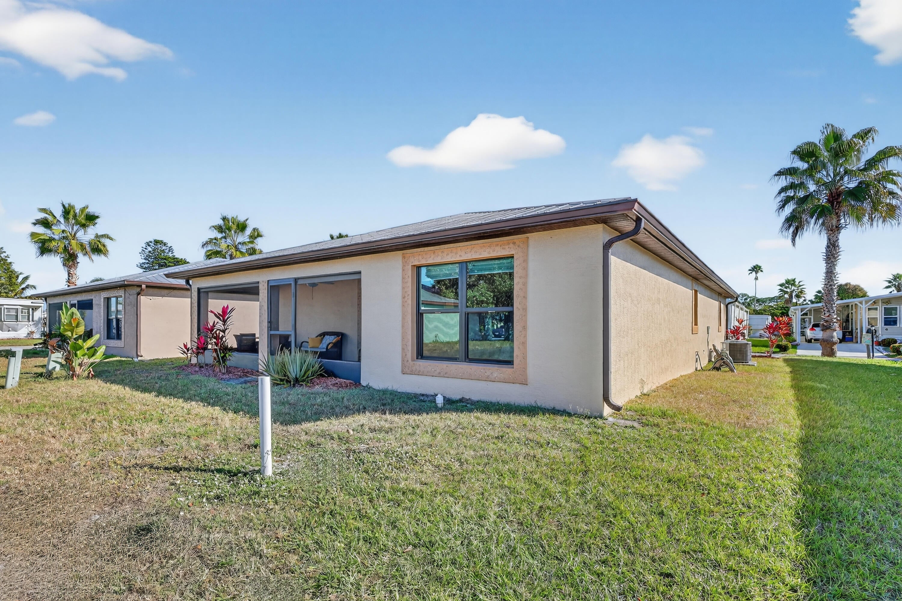 ELEGANT, DURABLE, SAFE & AFFORDABLE this 2018 2bed/2bath home w/ Only 1 owner is BUILT to LAST w/ Concrete Block Construction, IMPACT WINDOWS & a Metal Roof built over 5/8'' Plywood for maxstrength. KeyPadEntry, OpenConcept, Vaulted Ceilings,H20 Purify System throughout,LED Recessed Lights,Ceiling Fans,GRANITE Counters,Custom Window Treatmnts, StainlessSteel, Appl, 2024 Wash/Dryer, Master w/ walk-in closet & en-suite.Tiled & Shaded Front Porch & Lrg Screened, Tiled Lanai w/ Privacy Shades. Driveway coated w/ 24hour floor. PRIME LOCATION; beach, shopping,mall,grocery, bank,hospital,postal & more! Lot lease 646.36 includes trash, lawn care, Clubhouse w/Activities, Private FREE Golf,Heated Pool,Spa,Fitness,Pickleball,Tennis, Shuffleboard,Bocce,Library, Bingo,Parades, MahJong,Workshop & more!