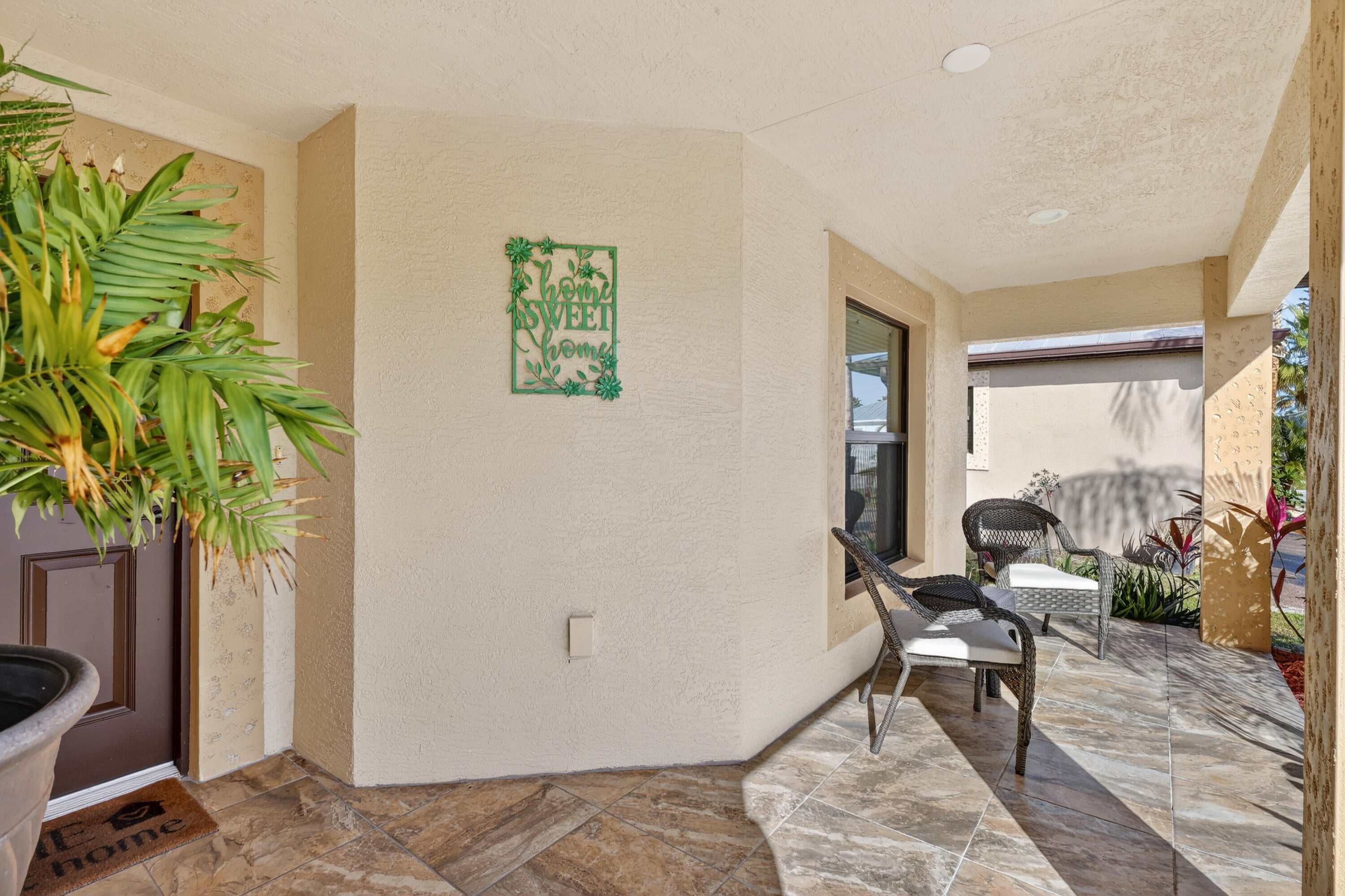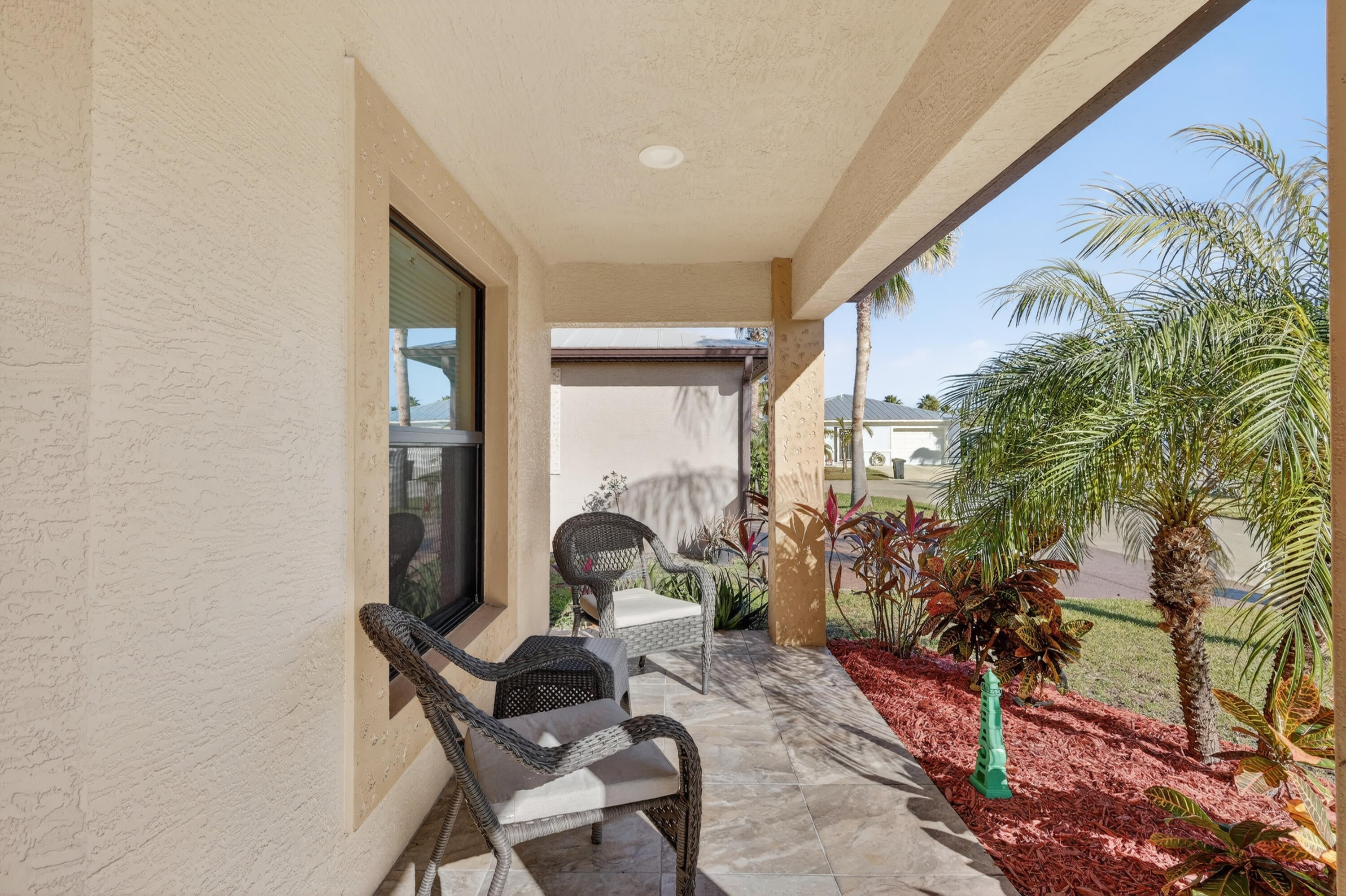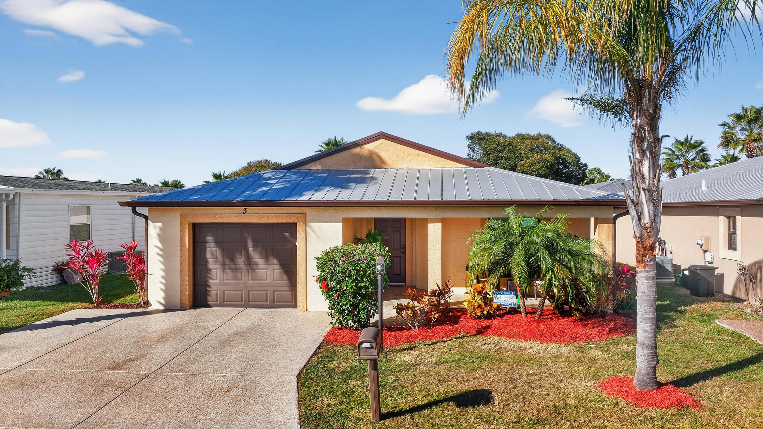 ELEGANT, DURABLE, SAFE & AFFORDABLE this 2018 2bed/2bath home w/ Only 1 owner is BUILT to LAST w/ Concrete Block Construction, IMPACT WINDOWS & a Metal Roof built over 5/8'' Plywood for maxstrength. KeyPadEntry, OpenConcept, Vaulted Ceilings,H20 Purify System throughout,LED Recessed Lights,Ceiling Fans,GRANITE Counters,Custom Window Treatmnts, StainlessSteel, Appl, 2024 Wash/Dryer, Master w/ walk-in closet & en-suite.Tiled & Shaded Front Porch & Lrg Screened, Tiled Lanai w/ Privacy Shades. Driveway coated w/ 24hour floor. PRIME LOCATION; beach, shopping,mall,grocery, bank,hospital,postal & more! Lot lease 646.36 includes trash, lawn care, Clubhouse w/Activities, Private FREE Golf,Heated Pool,Spa,Fitness,Pickleball,Tennis, Shuffleboard,Bocce,Library, Bingo,Parades, MahJong,Workshop & more!