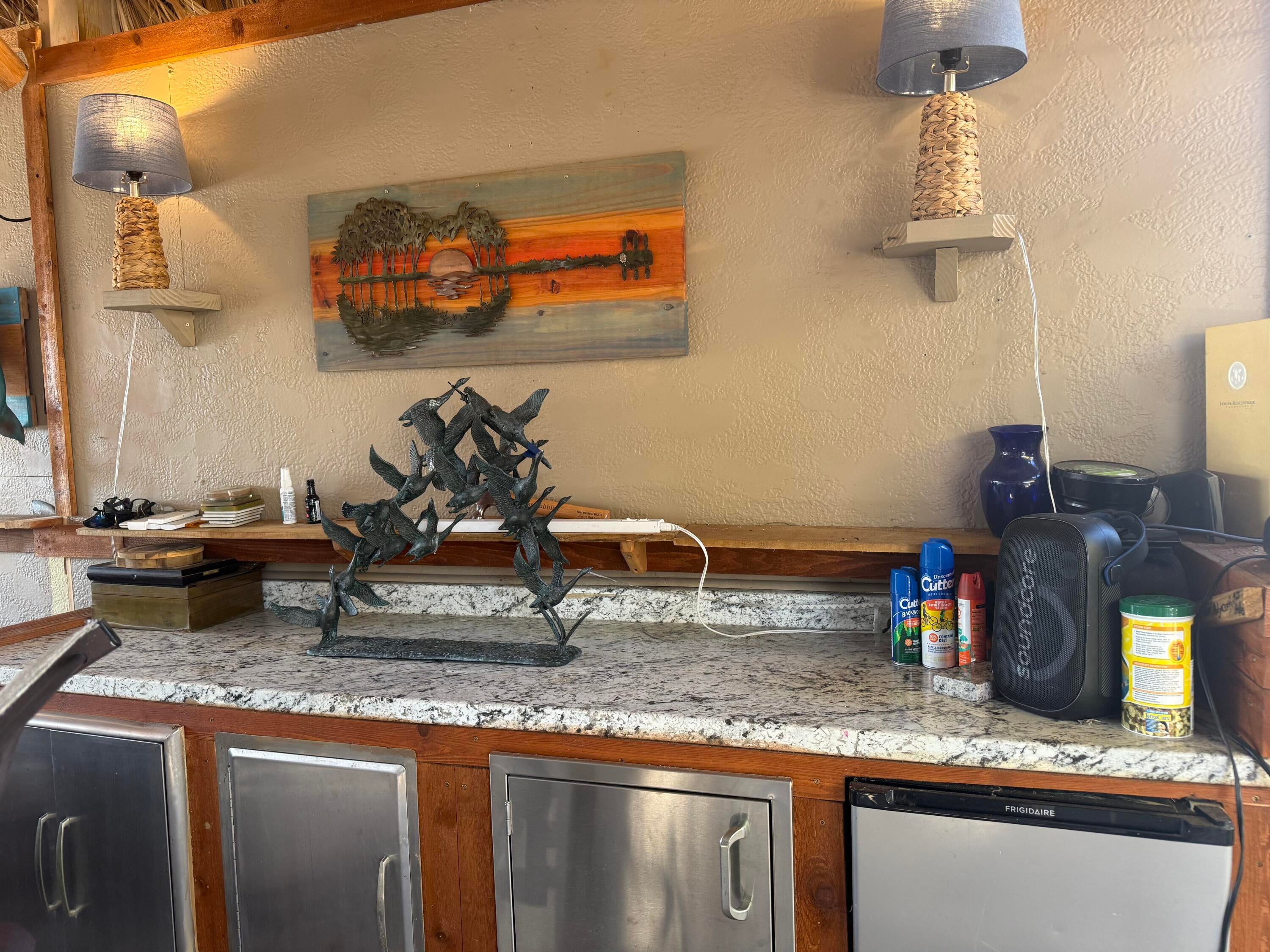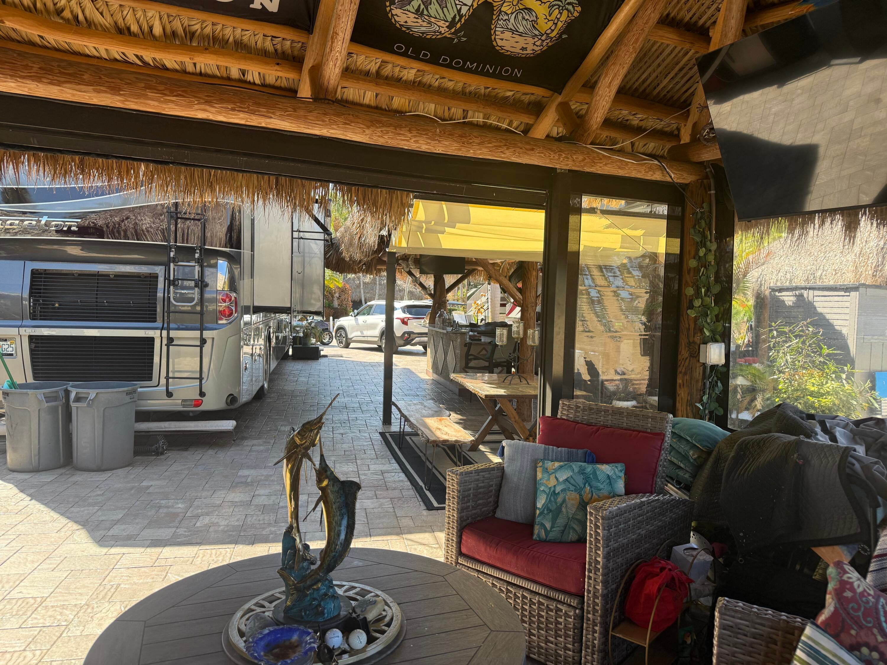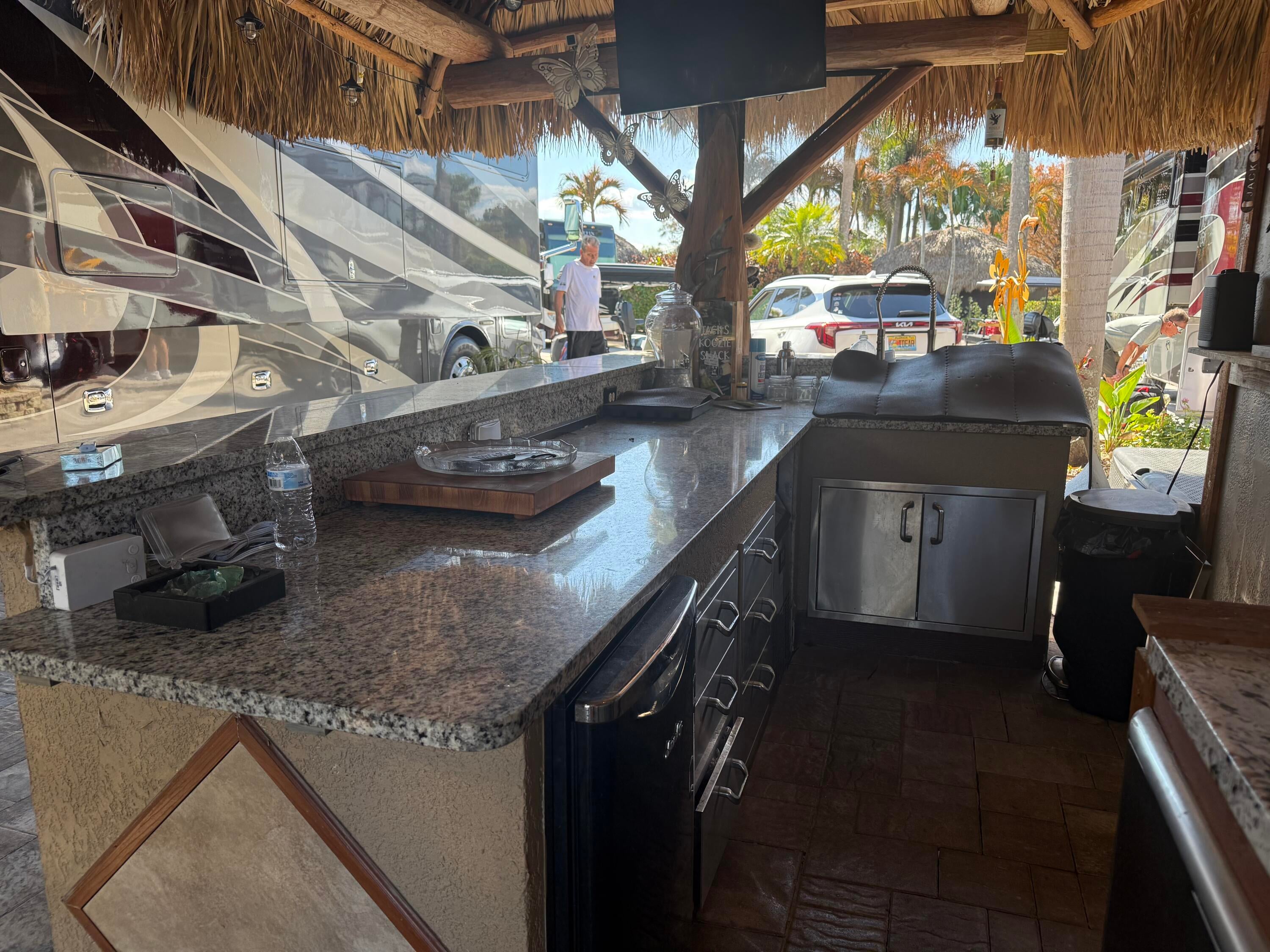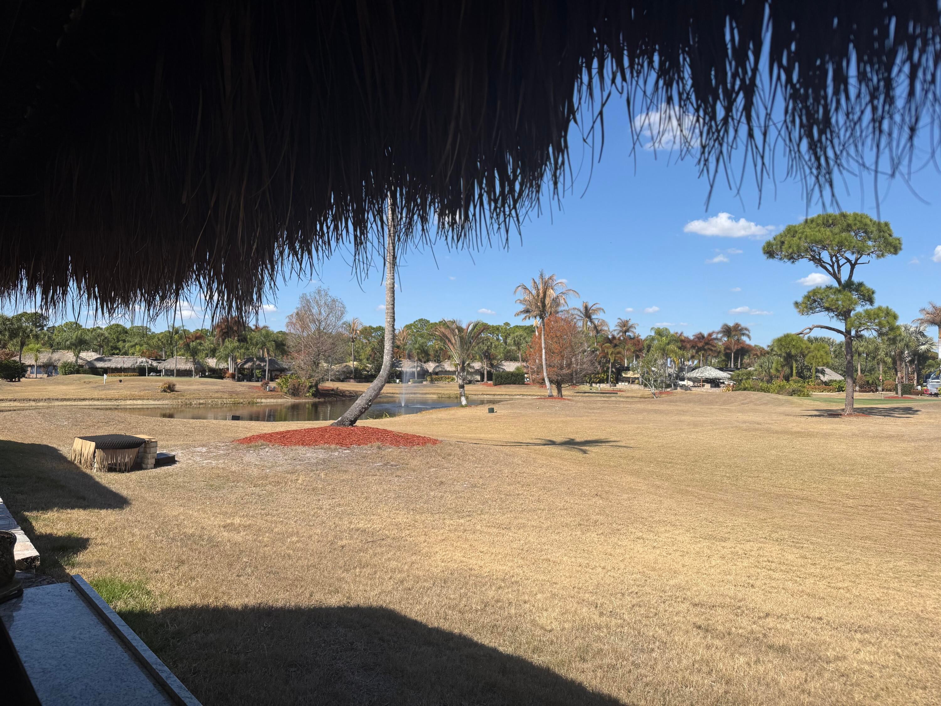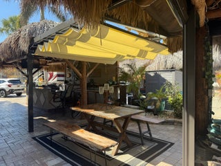 Beautiful landscaped lot that backs to golf course. Waterfall for relaxation while entertaining. New thatched large tikis. Granite countertop bar. Electric remote controlled full wall shades . Enjoy the pools and hot tubs , bocce ball , golf course, pickle ball ,shuffleboard, billiards , darts, tennis, full amenities for you to enjoy. Very active community . Happy hour during season on Friday Nights 5-7.