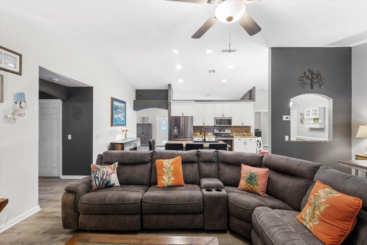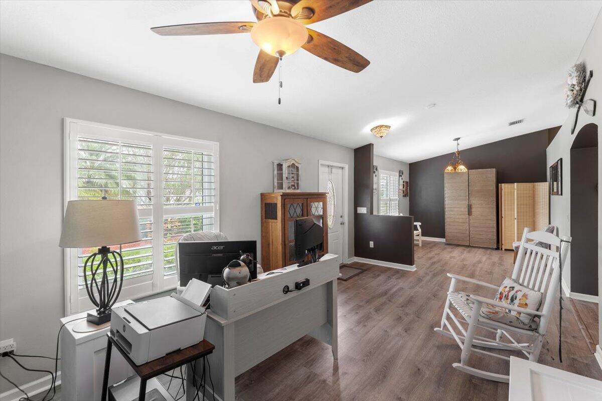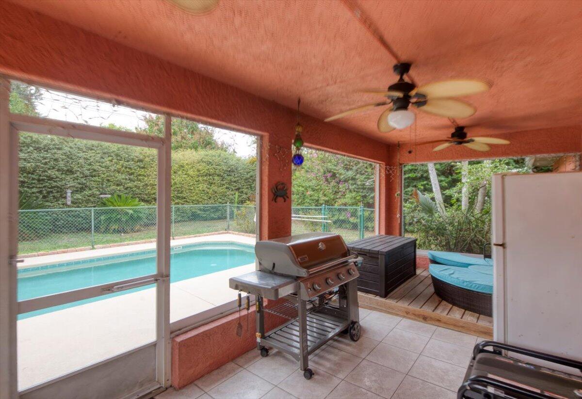 SELLER MOTIVATED AND WILLING TO NEGOTIATE!!!Beautiful three bedrooms, two baths CBS split floor plan POOL home in desirable Oak Hammock. Quiet neighborhood situated on .34 acres with mature, lush landscaping. Private fenced-in backyard. Spacious screened-in lanai with elegant French doors installed in 2019. New roof July, 2024! Large shed for storing tools or can be renovated into a mancave or she shed with minimal effort. Concrete saltwater separately fenced-in pool is lovingly maintained with brand new brickwork all around. Solar heating for the pool makes swimming a reality all year round. Comes with new robo pool cleaner. No HOA! Vinyl flooring installed 2018. Must see!White plantation shutters inthe master bathroom and bedroom and front rooms. Samsung appliancesBronze refrigerator, oven, dishwasher, microwave. Black large-capacity washer and dryer were bought in 2023. Master bedroom is larger than usual with a generous-sized bathroom and linen closet. Walk-in closet in the master. Other two bedrooms with ample closetspace are across the house with a bathroom and linen closet in betweencould be a separate suite! Each bedroom is a good size. Huge family roomeasily fits a large sectionalwith a fireplace and mantel to place your family treasures. Perfect space against the wall for a dining room table or even a grand piano!Kitchen has white cabinets and granite counters. Large island to have intimate breakfasts under a vaulted ceiling. Plenty of room for a small table and four chairs too. Large pantry and lots of cabinet space.Dining room and living room in the front of the house are very versatile; can be used as an office, gaming room, or even for guests. Two-car garage has rubberized flooring and air conditioning. Driveway easily fits four cars/vehicles. Private septic system has been serviced yearly, pumped and cleaned regularly as well as consistent enzyme additives used. Must see to truly appreciate ; beautiful home to live in!