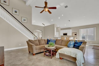Stately custom 4-bedroom plus loft, 2.5-bath, lakefront home with a 3-car garage, situated on an oversized 0.31-acre cul-de-sac lot with a huge oversized driveway in the highly sought-after 24-hour manned, guard-gated community of Lake Charles. This beautifully maintained residence offers stunning lake views and direct access for boating and fishing (electric motors permitted), along with a thoughtful floor plan featuring the primary suite conveniently located on the main level.The spacious primary retreat features serene water views, a fully remodeled en-suite bath with dual sinks, separate shower, and a large walk-in closet. A remodeled downstairs guest bath adds additional comfort for visitors.The main living area showcases 20" diagonal ceramic tile throughout with no carpet anywhere in the home tile downstairs and engineered hardwood flooring upstairs for a seamless, solid-surface finish. The kitchen is equipped with granite countertops, a center island, breakfast bar, and neutral finishes that flow effortlessly into the living and dining spaces. Upstairs, enjoy a lake-view loft with built-in projector and screen included, creating the perfect home theater or media space, along with three generously sized bedrooms and a well-appointed combination bath with dual sinks ideal for family or guests. Outdoor living is exceptional with a 31-foot screened patio under truss overlooking the lake, offering ample space to relax or entertain. Pool-ready with room to design your dream outdoor oasis. Enjoy boating and fishing right from your own dock, with electric motors permitted on the connecting lakes. The three-car garage is truly a dream, featuring custom cabinetry and finished flooring plus an AC Split/Heat Pump ideal for storage, hobbies, or showcasing vehicles. Lake Charles residents enjoy amazing resort-style amenities including a beautiful Beach Clubhouse with heated pool and spa, library, media center, lighted tennis and pickleball courts, basketball court, shuffleboard, bocce, horseshoes, playground, picnic and BBQ areas, jogging and biking paths, scenic preserves, and interconnecting lakes for non-gas-powered boats. HOA fees include lawn care, basic cable, and internet, adding exceptional value and convenience. Ideally located in St. Lucie West, the spring training home of the New York Mets, with abundant shopping, dining, medical facilities, and PGA golf nearby, plus quick access to I-95 and the Florida Turnpike. A rare opportunity to own a lakefront home combining privacy, luxury, and an exceptional lifestyle.