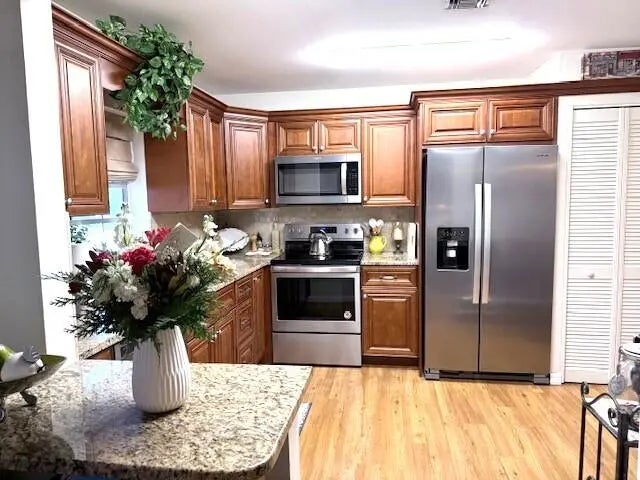 CONDO BEAUTIFUL!! This partially furnished end condo is updated & decorated beautifully . Updates include wood cabinets & granite counters in kitchen, SS appliances + matching pantry. Crown molding above cabinets, Eat-at bar, w/stools between Fam Rm & Kitchen. Wood floors throughout, tile floors in bathrooms. Updated bath vanities & shower in master bath w/grab bars. light fixtures changed in most rooms. Pretty ceiling fans in living & bedrooms. Screened lanai w/panel shutters for slider. Lush landscaping around unit. Some furnishings in photos will not stay. Really great condo for the price & monthly condo fees is lowest in all of HP. Call now to see!!