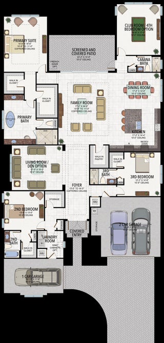 Experience the pinnacle of luxury living in this pristine Trivoli model, situated on a rare, oversized end lot with breathtaking long water views in Valencia Walk at Riverland. Built in 2023, this fabulous home features 3 spacious bedrooms, 4 full bathrooms, a versatile club room (potential 4th bedroom), and a dedicated den, all showcasing stylish wide-plank tile flooring throughout. Step inside to an expansive open-concept layout bathed in natural light, featuring high coffered ceilings with abundant recessed lighting. The gourmet kitchen is a chef's delight, boasting GE stainless steel appliances, sleek white cabinetry with soft-close doors, stunning quartz countertops, a natural gas stove with range hood, and a massive center island. The primary suite offers serene lake views and aa luxurious en-suite bathroom with dual quartz vanities, ceiling-high mirrors, a spa-like tub, and an oversized shower with floor-to-ceiling tile. Two generous guest suites, each with their own en-suite bathroom and walk-in closet, provide ample space and privacy for visitors. Premium upgrades include wide plank-tile flooring, custom master closets, a built-out laundry room, and professional epoxy garage flooring. Step outside to the large covered and screened patio to take in beautiful sunrises over the longest part of the lake, with plenty of room on the premium lot for a future pool. Located just steps from the clubhouse, residents of Riverland enjoy an unparalleled lifestyle within a 4,000-acre master-planned community. Enjoy access to a 16-acre Sports & Racquet Club, a 51,000 sq ft Wellness & Fitness Center, a 5-acre Arts & Culture Center, and future Town Center, making this an exceptional place to call home.